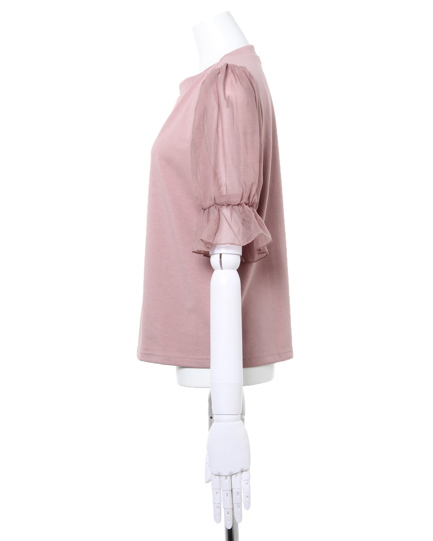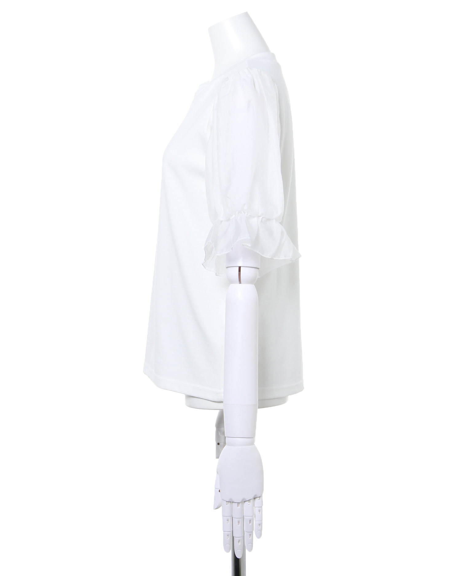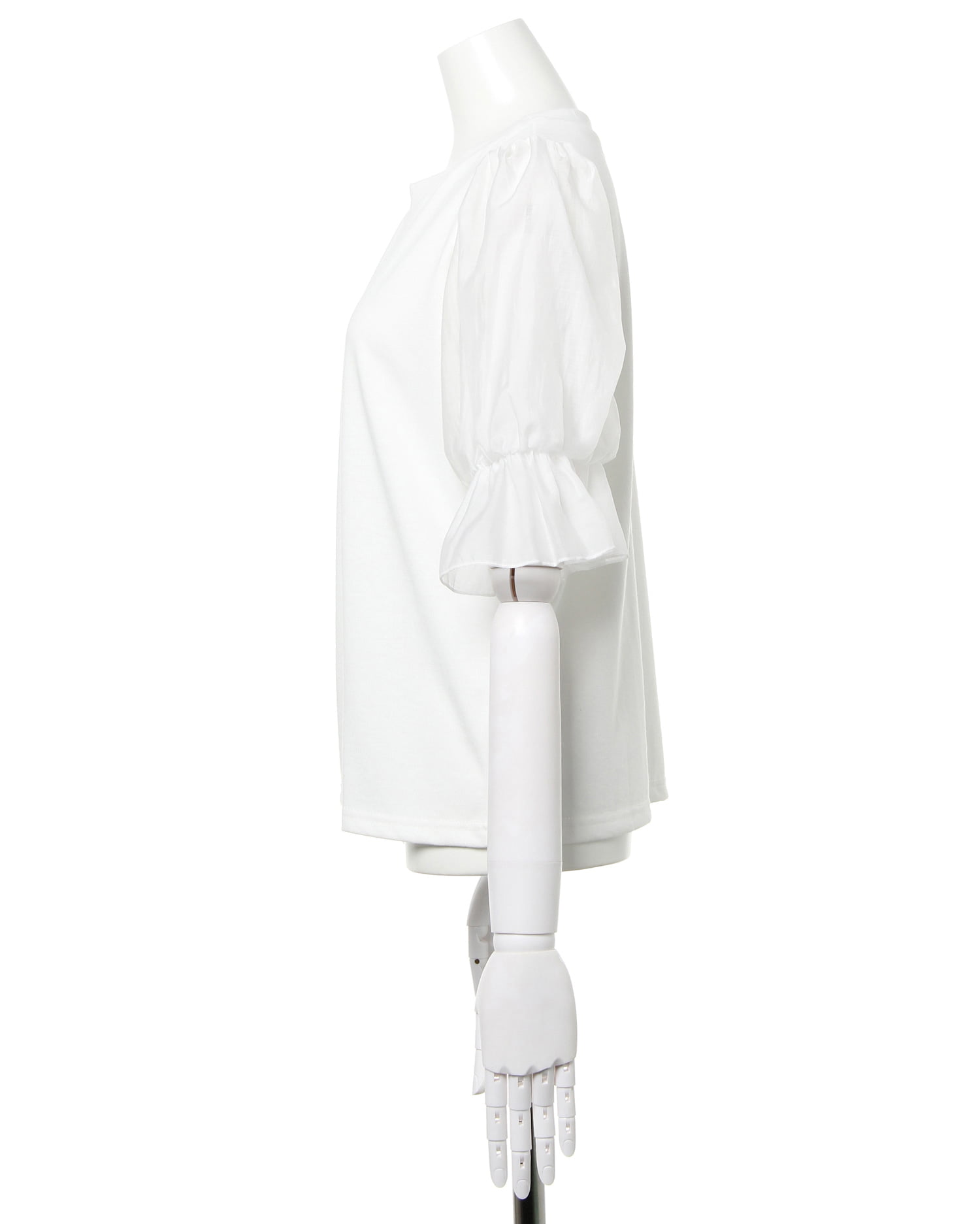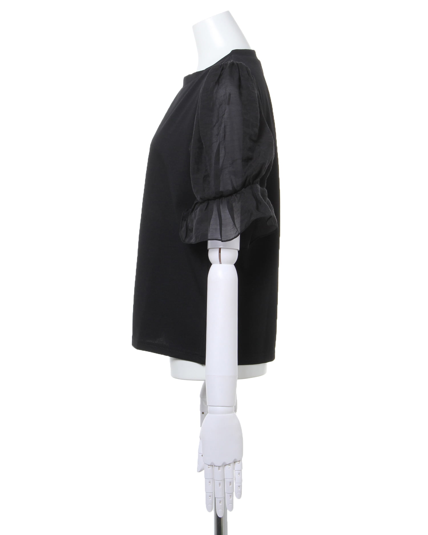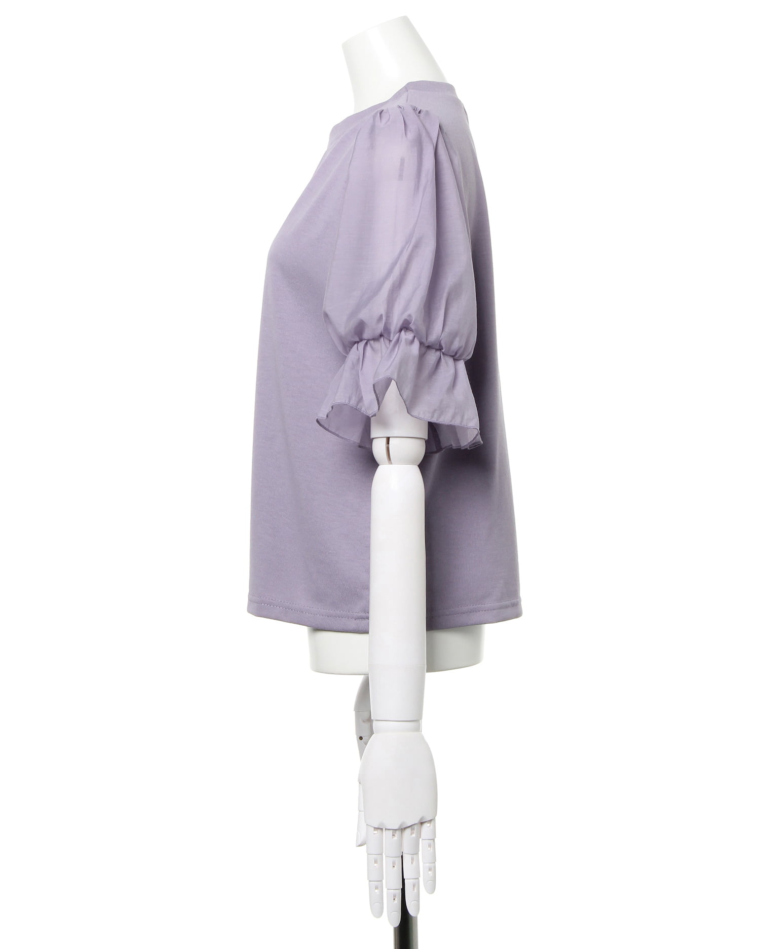 異素材で切り替えたボリュームスリーブがトレンドライクなTシャツ。ナチュラルな柔らかい素材とチュールを重ねたふんわりスリーブはほんのり肌が透けるシアー感がポイント。ボディ部分はフロントのロゴのみでシンプルに仕上げています。どんなボトムスにも合わせやすいのでデイリーに活躍。トップスインスタイルで着こなすのもおすすめです。