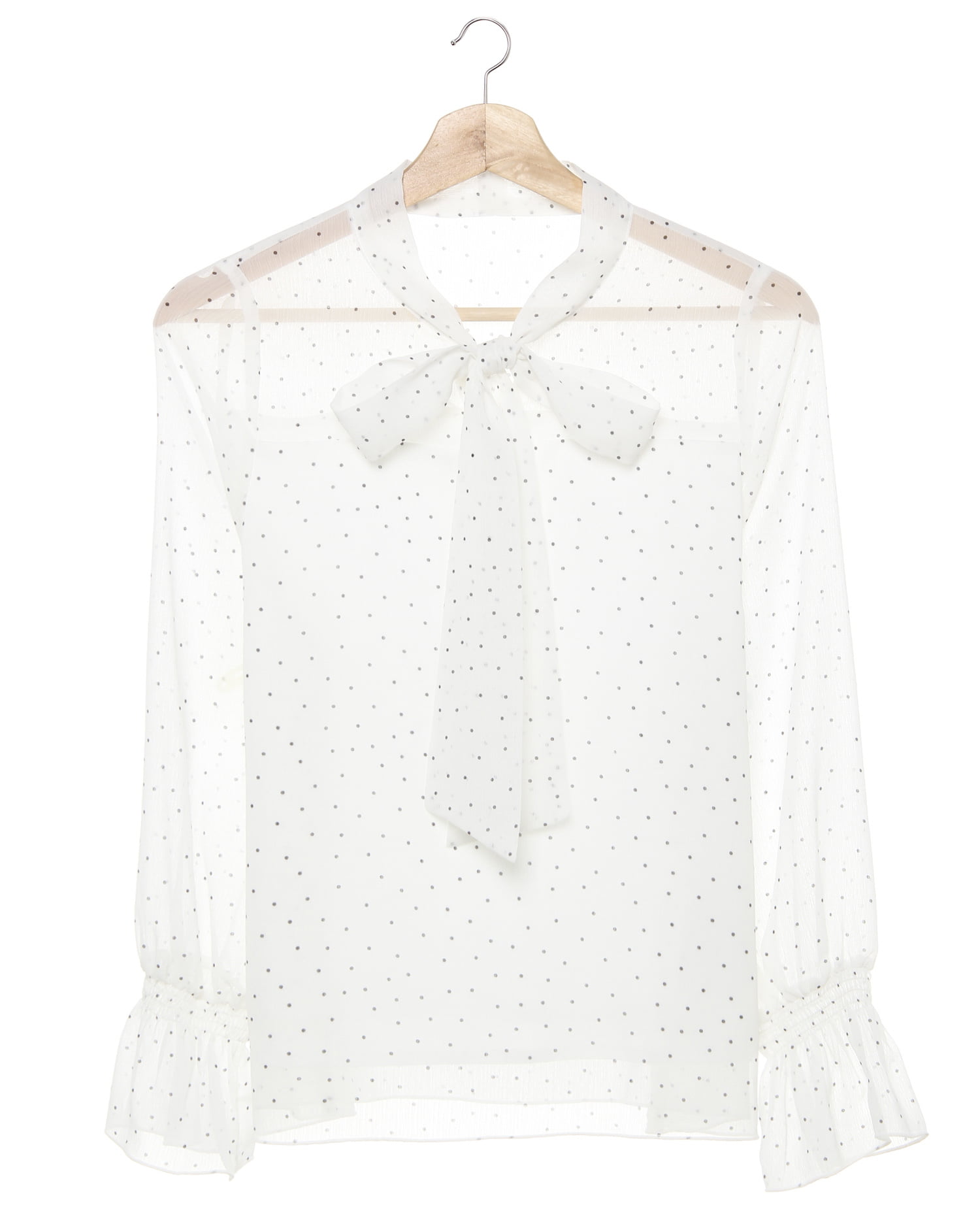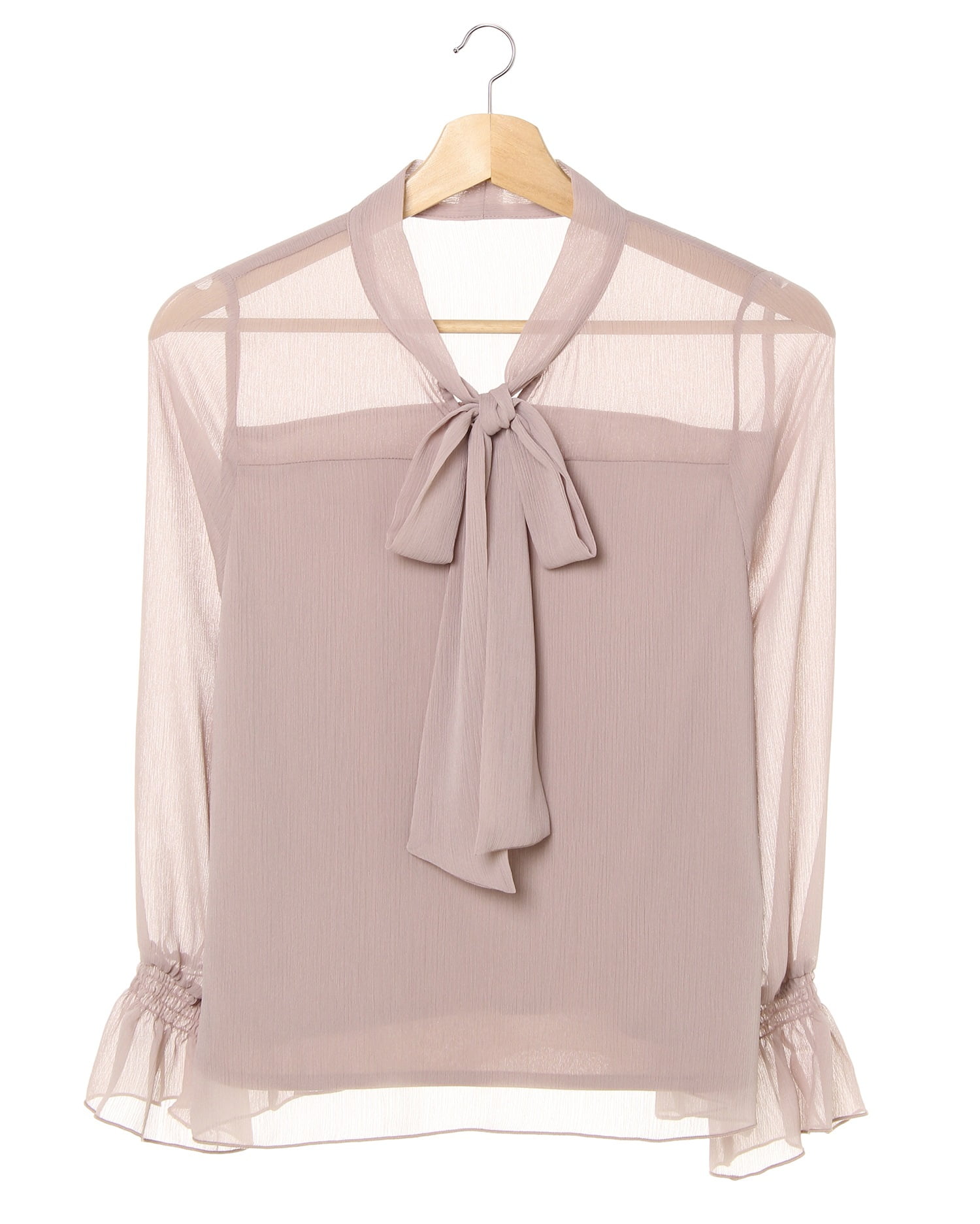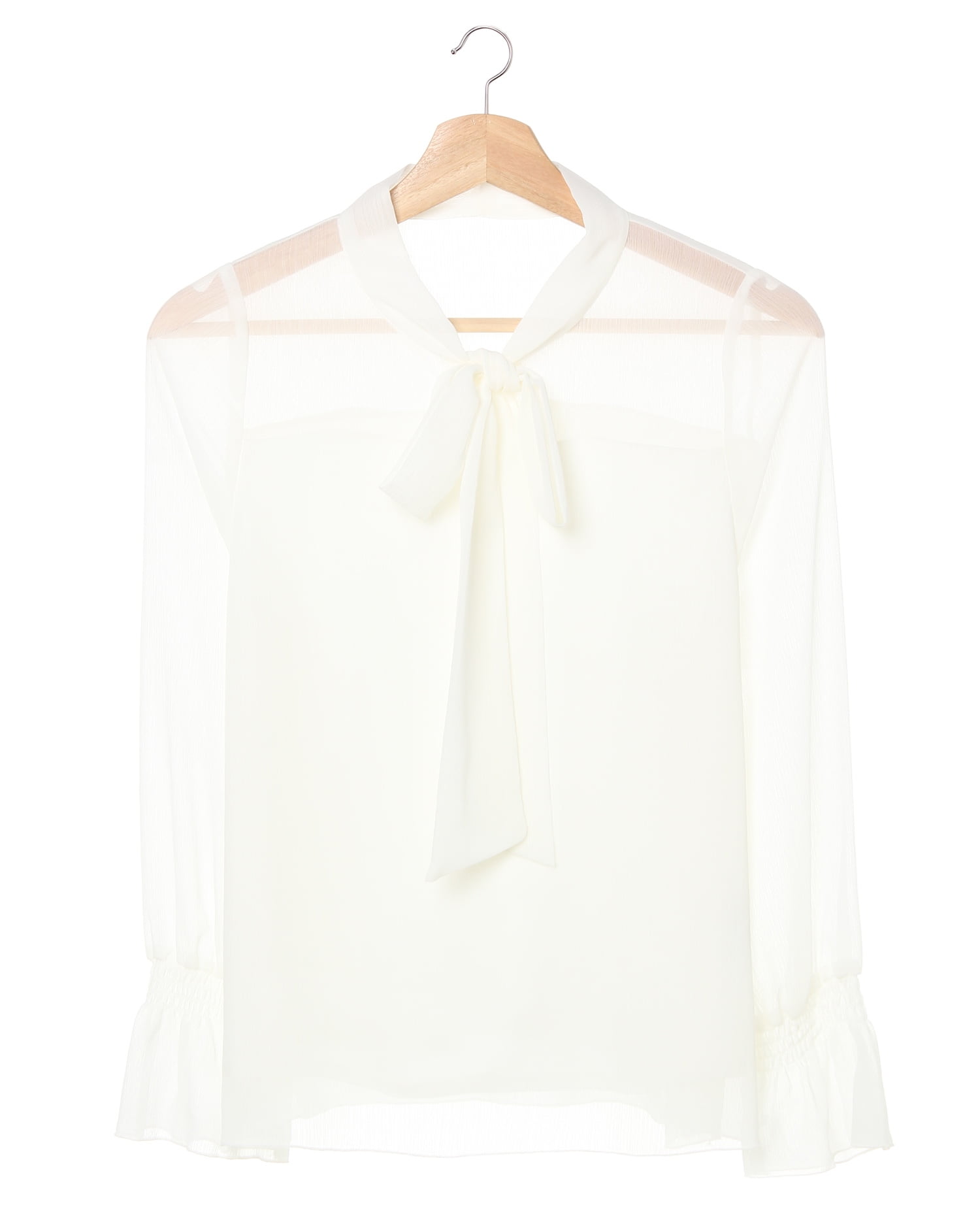 ヨーク部分からほんのり透ける素肌とのコントラストでエレガントな着こなしに導くブラウス。表面感のある楊柳素材が表情豊かで大人っぽい印象です。首元のボウタイデザインが今年らしく、顔周りを明るく華やかに演出。袖口にゴムを入れたボリュームスリーブでバランス良く合わせられるのも魅力的です。ベアトップの様な裏地を付けているので透け感のある素材でもインナーを気にせず安心。