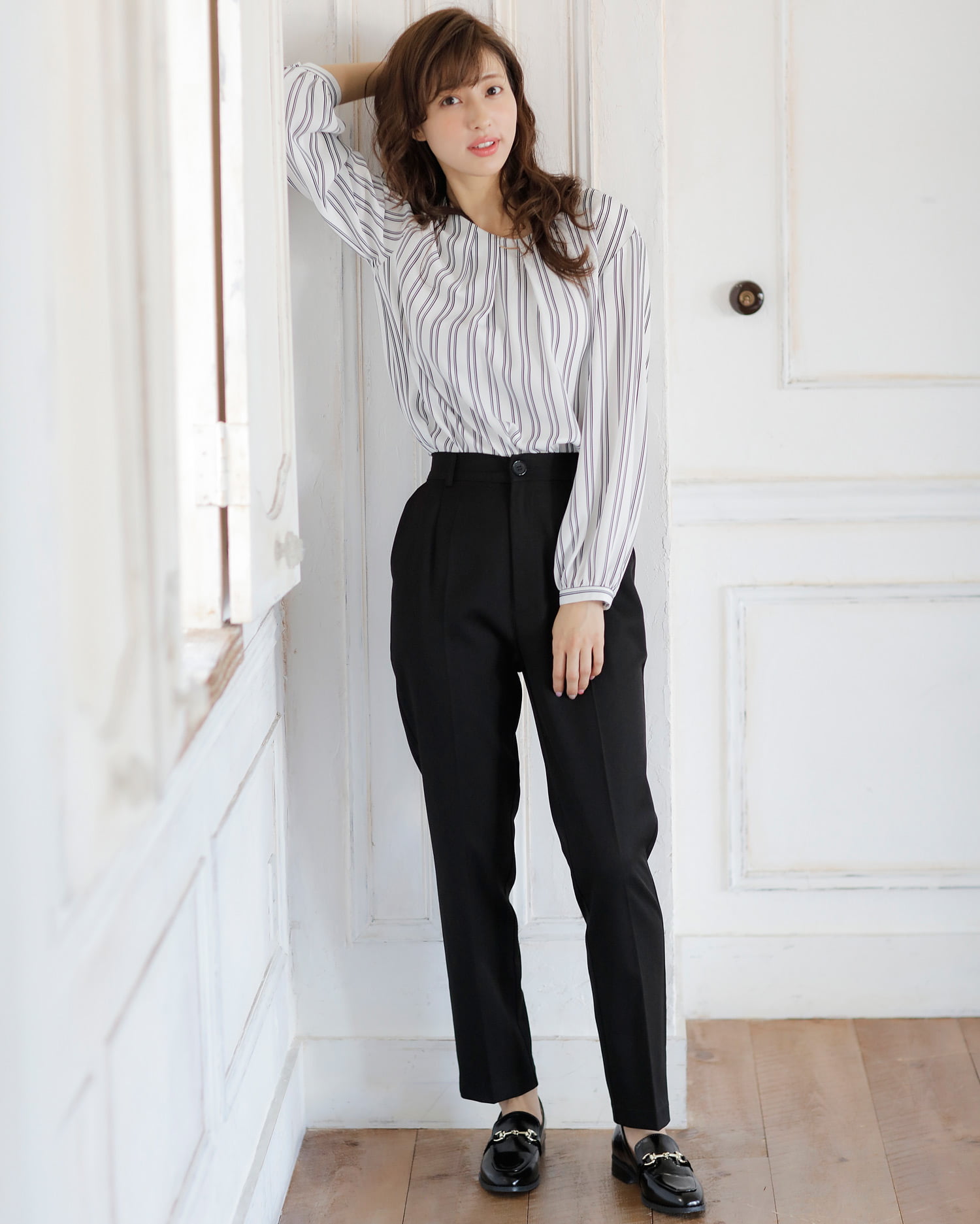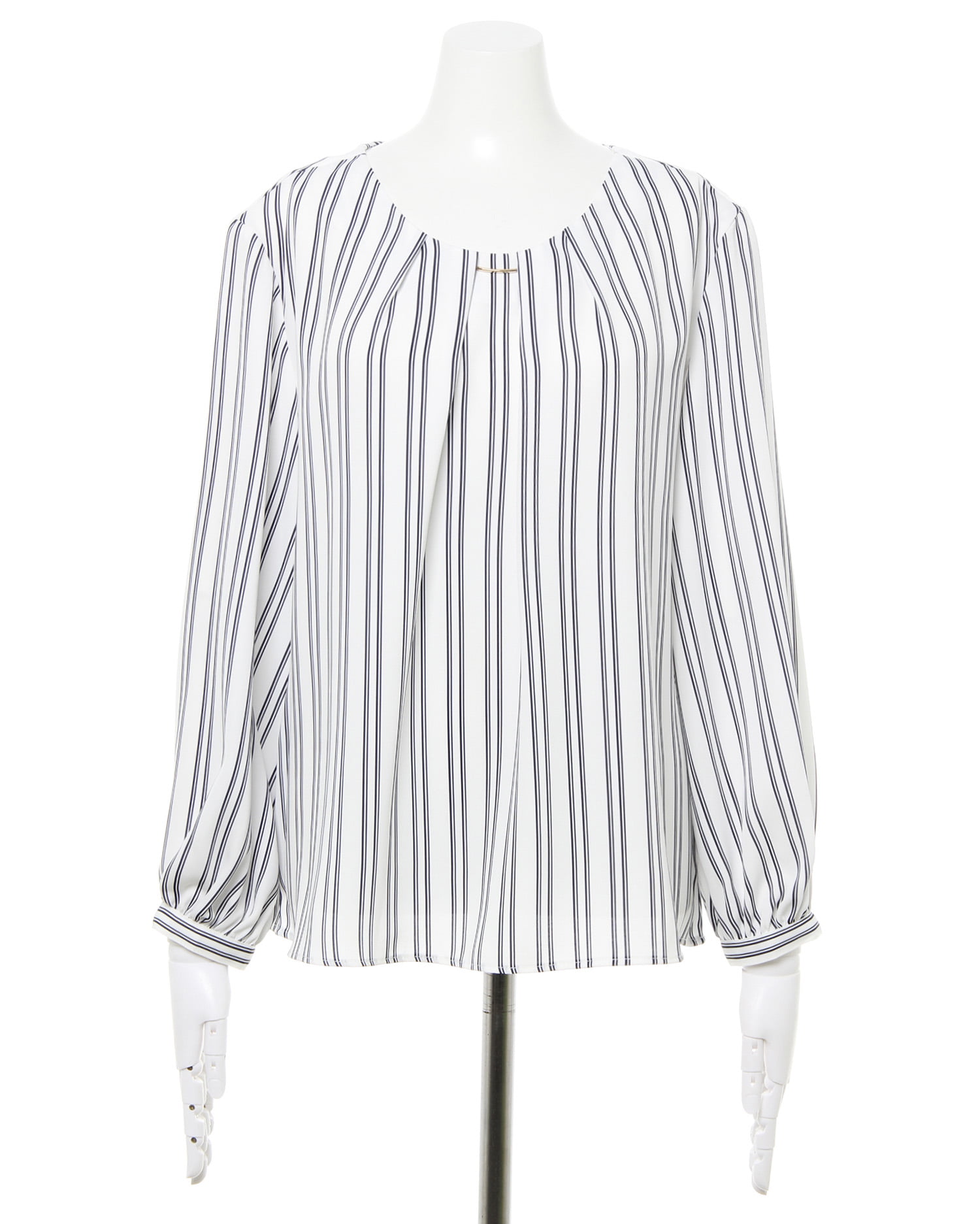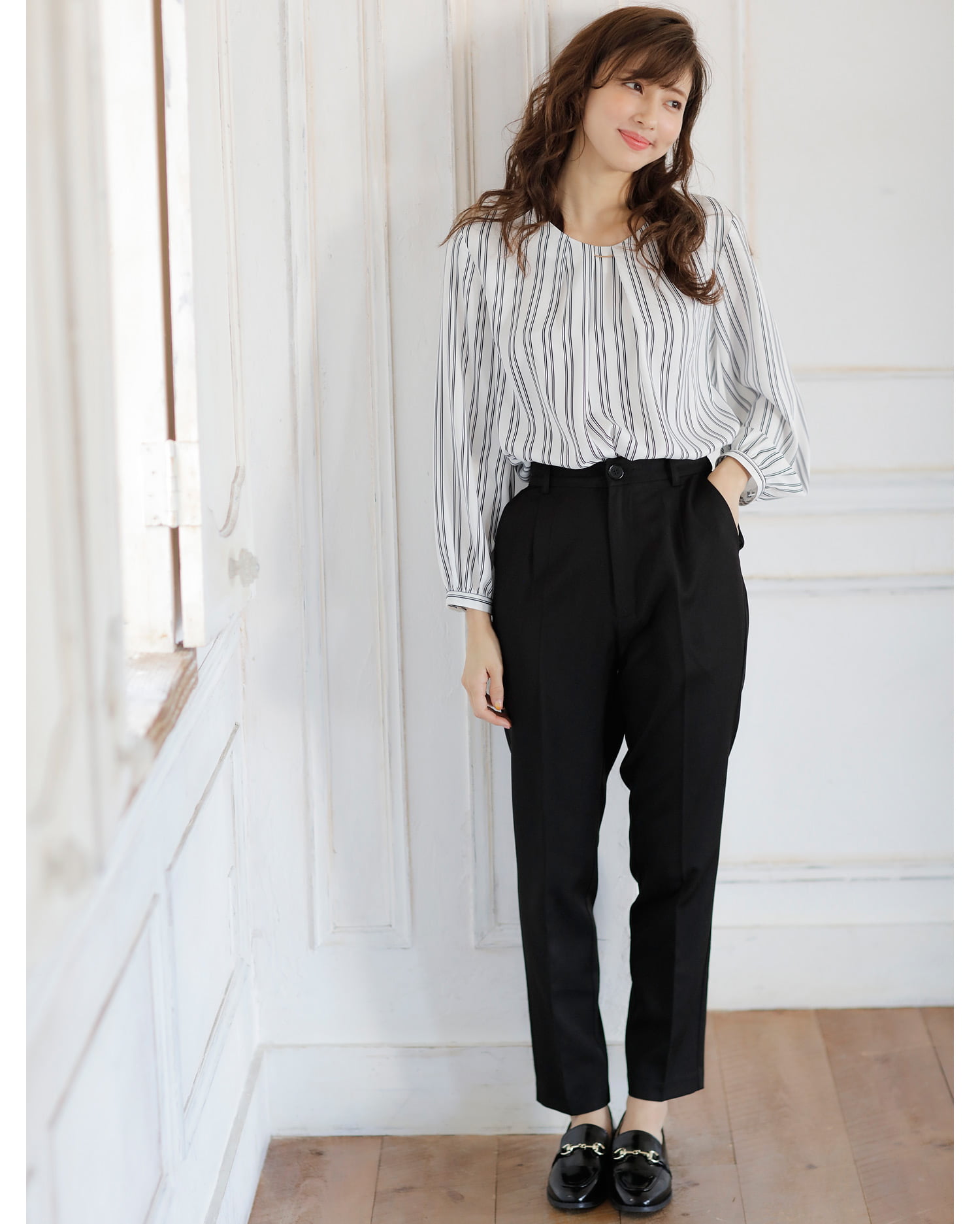 ふんわりシルエットがフェミニンなブラウスはとろみのある素材で着心地抜群。ピッチを変えたストライプがコーディネイトのアクセントになってくれます。きちんと感があるのでオンオフ問わずに着られるのもポイント。ネックラインにはピン付きで華やかな印象に。程よい裾丈はトップスインスタイルも◎。パンツと合わせたマニッシュスタイルもおすすめです。