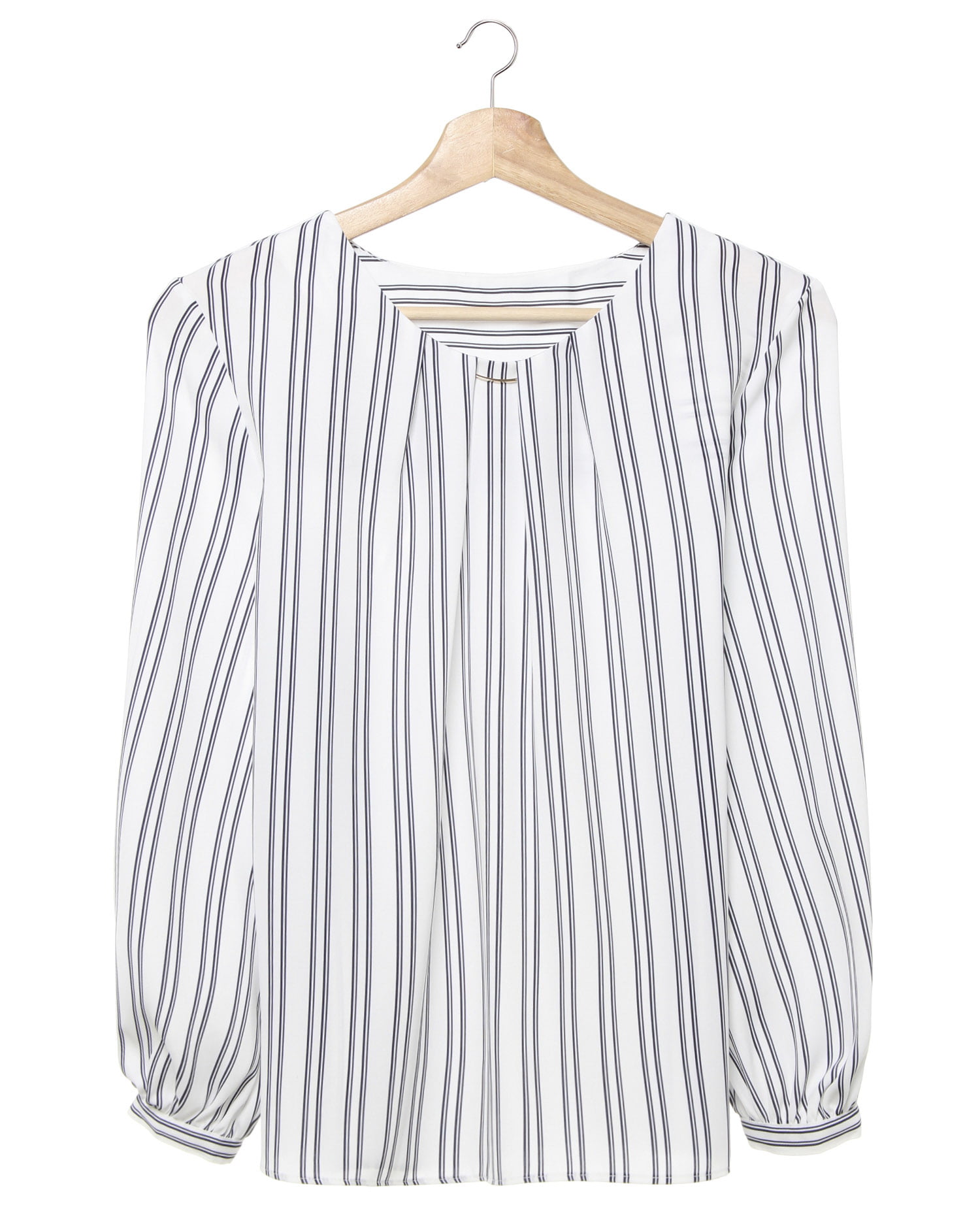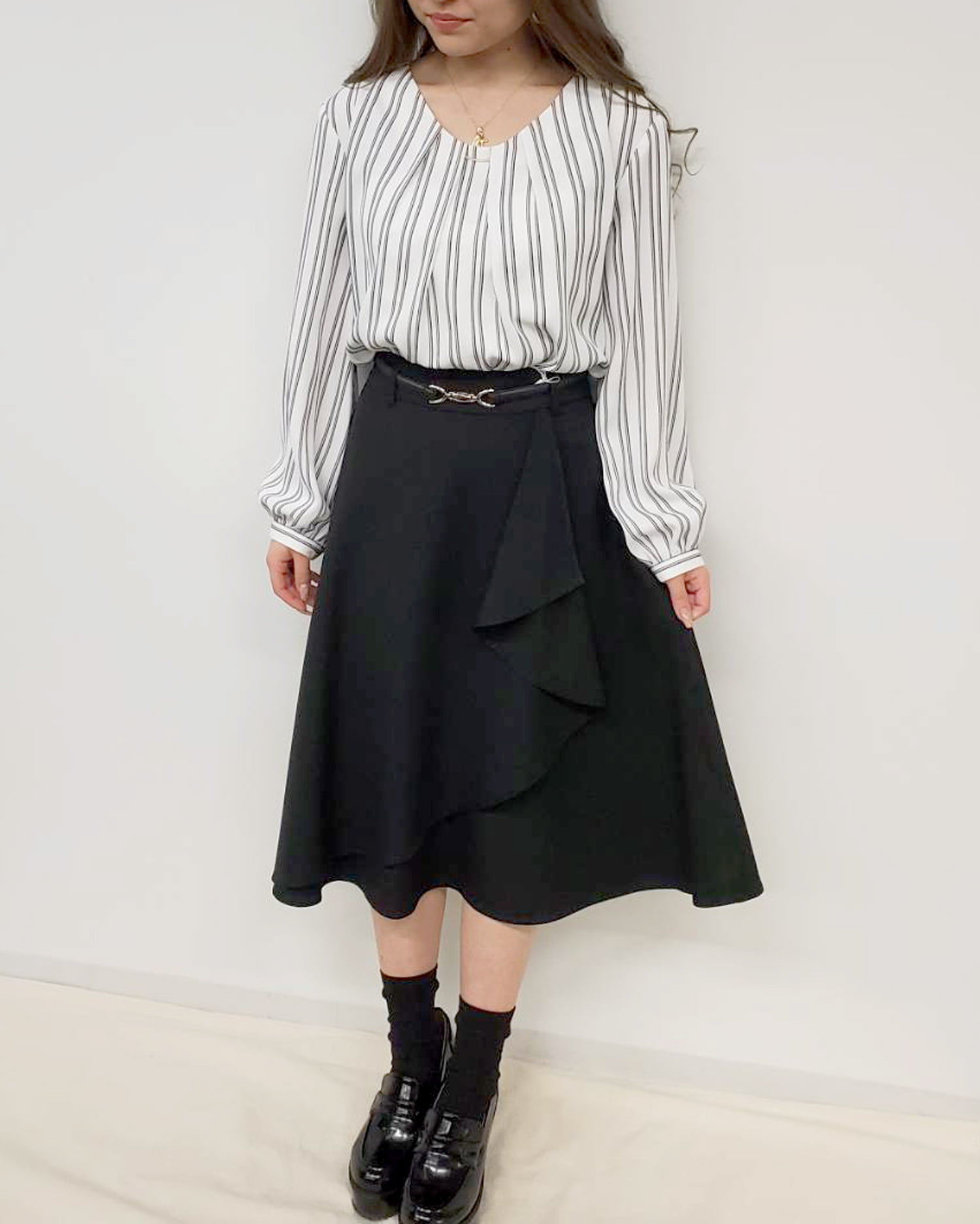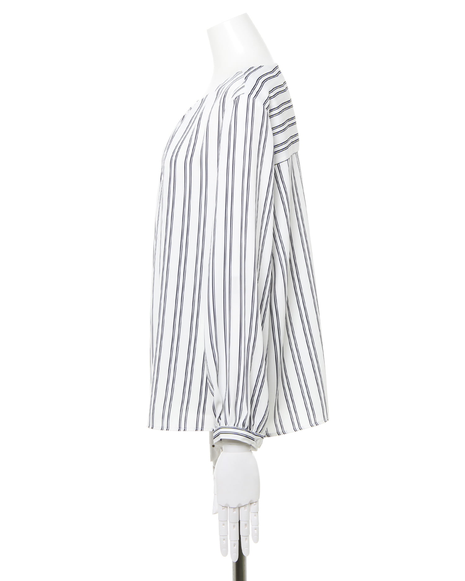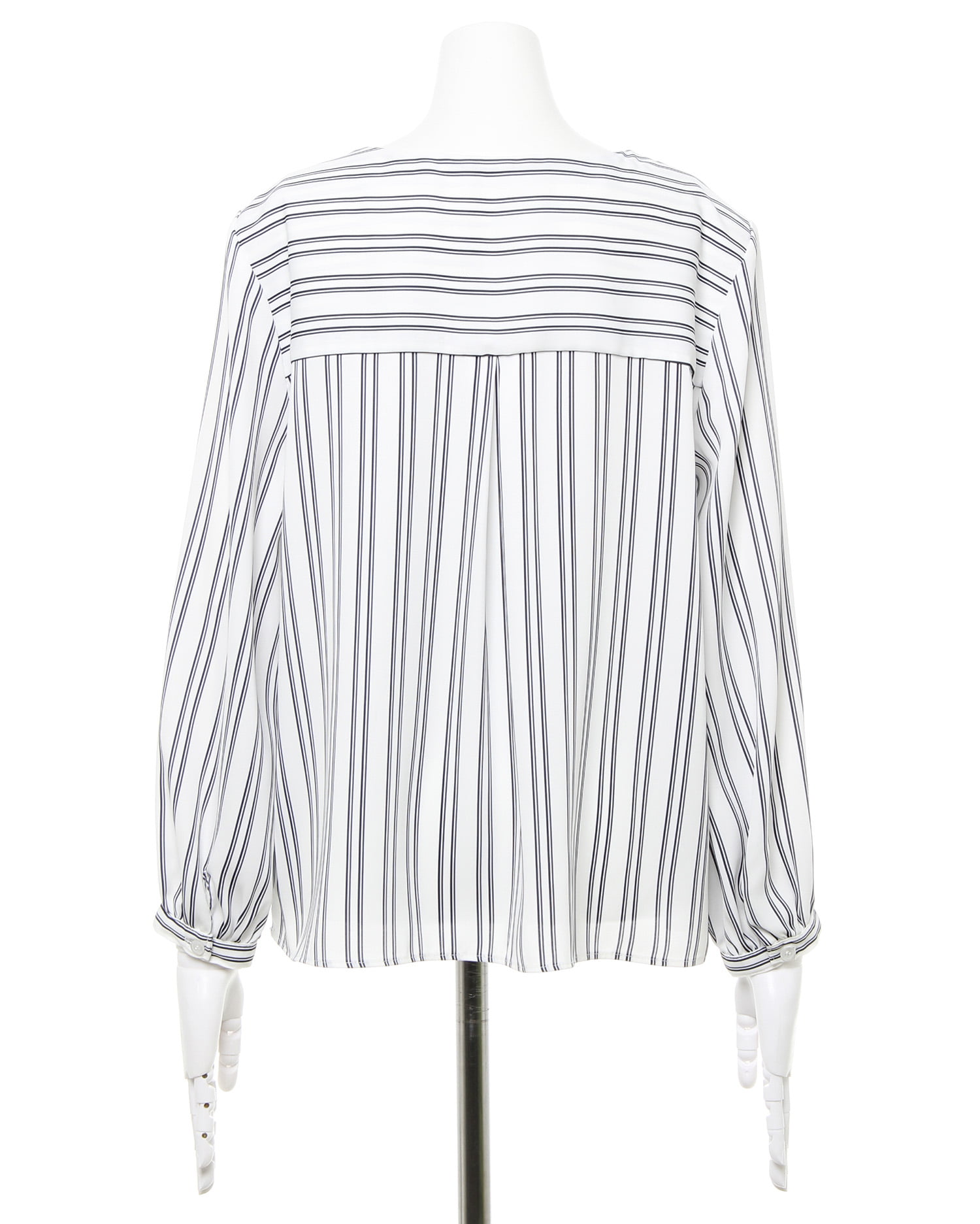 ふんわりシルエットがフェミニンなブラウスはとろみのある素材で着心地抜群。ピッチを変えたストライプがコーディネイトのアクセントになってくれます。きちんと感があるのでオンオフ問わずに着られるのもポイント。ネックラインにはピン付きで華やかな印象に。程よい裾丈はトップスインスタイルも◎。パンツと合わせたマニッシュスタイルもおすすめです。