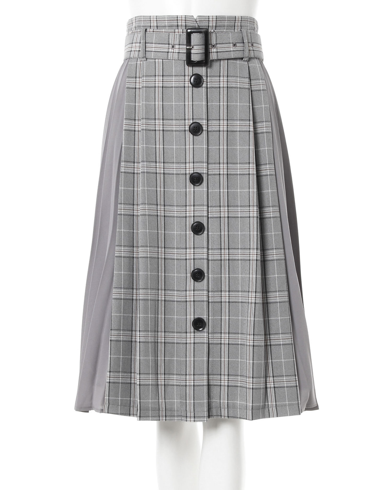 存在感抜群のミディ丈スカートはきちんと感も兼ね備えたスタイリッシュデザインに注目。ハリ感のあるチェック生地とエアリーなプリーツで表情のあるアイテムに仕上げています。上品な印象のアイテムなのでオフィスシーンにもオススメ。バックウエストはゴムになっているので脱ぎ穿きも楽チンです。スクエアバックルの共布ベルト付きでトップスインスタイルもサマに。