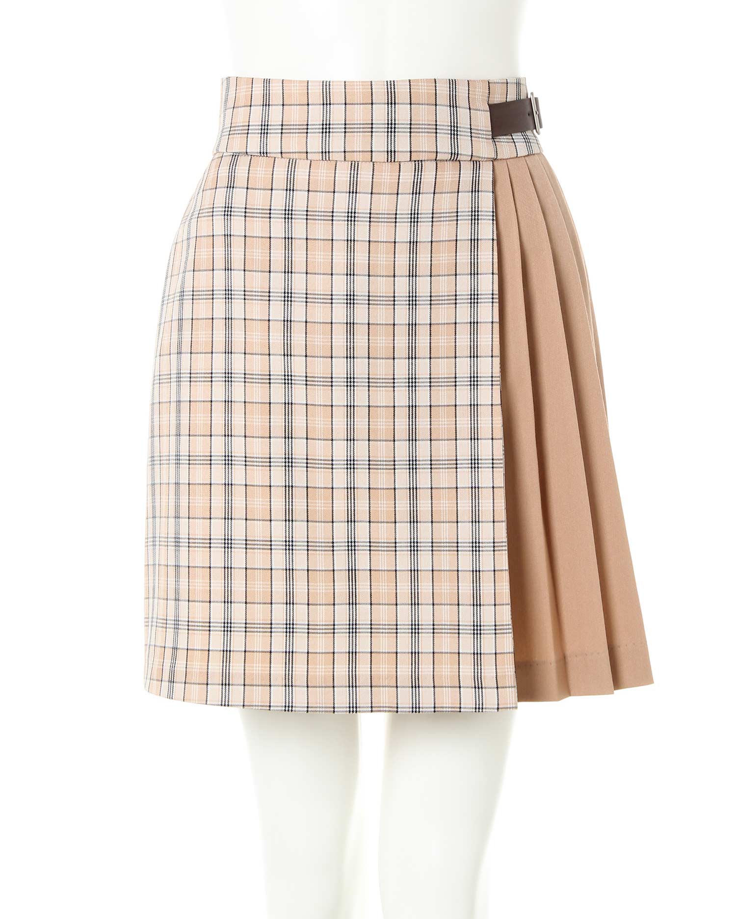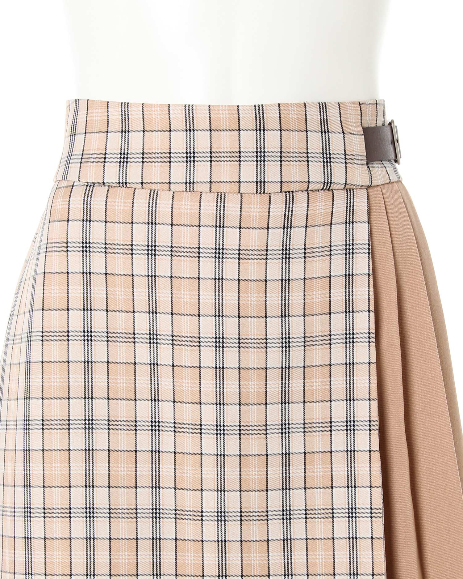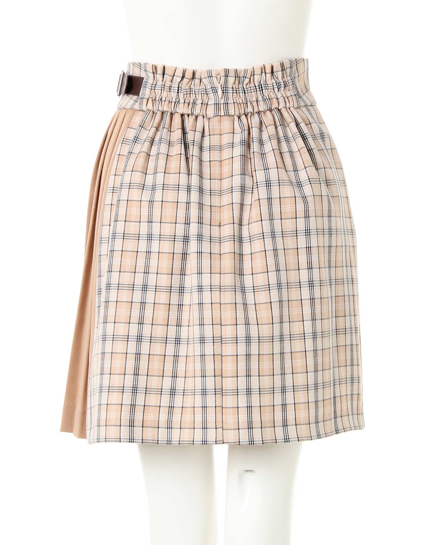トレンドのチェック柄と無地のプリーツのコントラストが新鮮な台形スカート。ウエストから裾へ向かって広がるシルエットは太ももをほっそり見せ、美脚効果も抜群です。サイドにはベルトをあしらってアクセントに。切り替え部分はきちんと縫製されているのではだける心配もありません。バックウエストはゴム&ジップで脱ぎ着も楽チン。ゆったりシルエットのトップスを合わせてキュートに着こなしたいアイテムです。