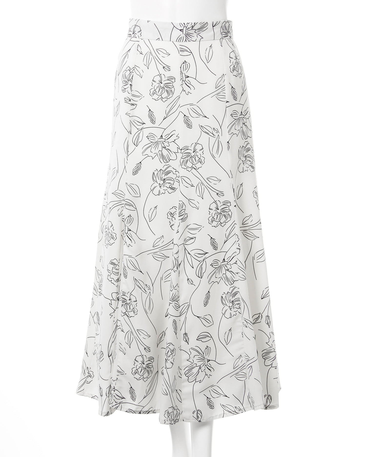 モノトーンの花柄プリントがシックなロング丈のスカート。手書き風のフラワープリントがコーディネイトのアクセントになる1枚です。腰回りをすっきり、裾をふわりと広げたマーメイドラインでスタイルアップを実現。バックウエストはゴム&ジップで脱ぎ穿きも楽ちんです。エアリーな素材で季節感たっぷりの着こなしに。上品なアイテムなのでオンオフ問わずに着回せます。