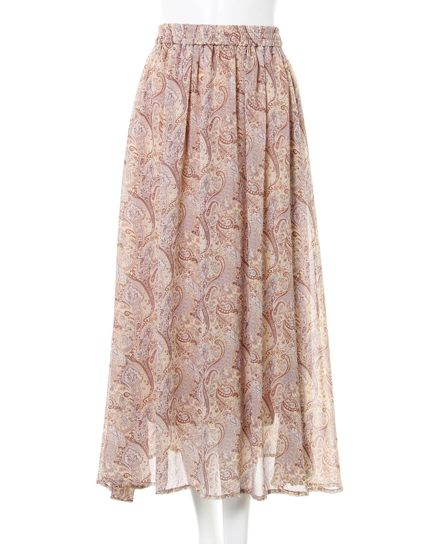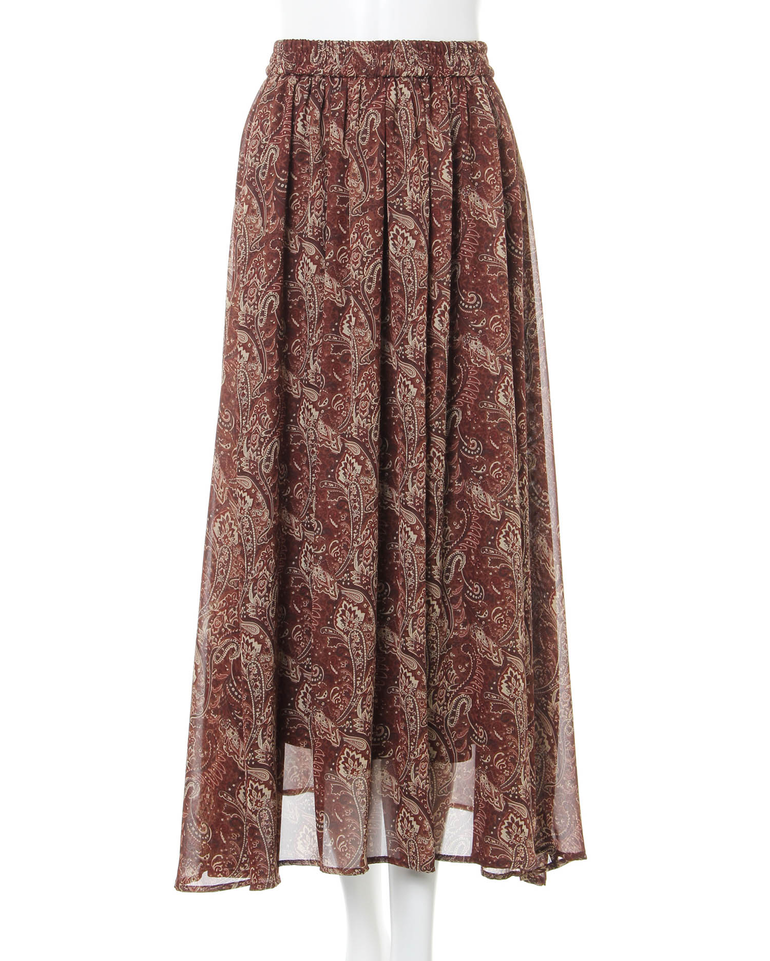 レトロ&クラシカルなペイズリー柄が大人っぽいロング丈のスカート。ギャザーをたっぷり入れたふんわりとしたシルエットでフェミニンな着こなしが叶います。落ち着いたカラー使いが上品。薄手の透け感ある素材も裏地付きなので安心して着られます。ウエストはゴムになっているので脱ぎ穿きも楽ちん。トップスインスタイルもおすすめです。