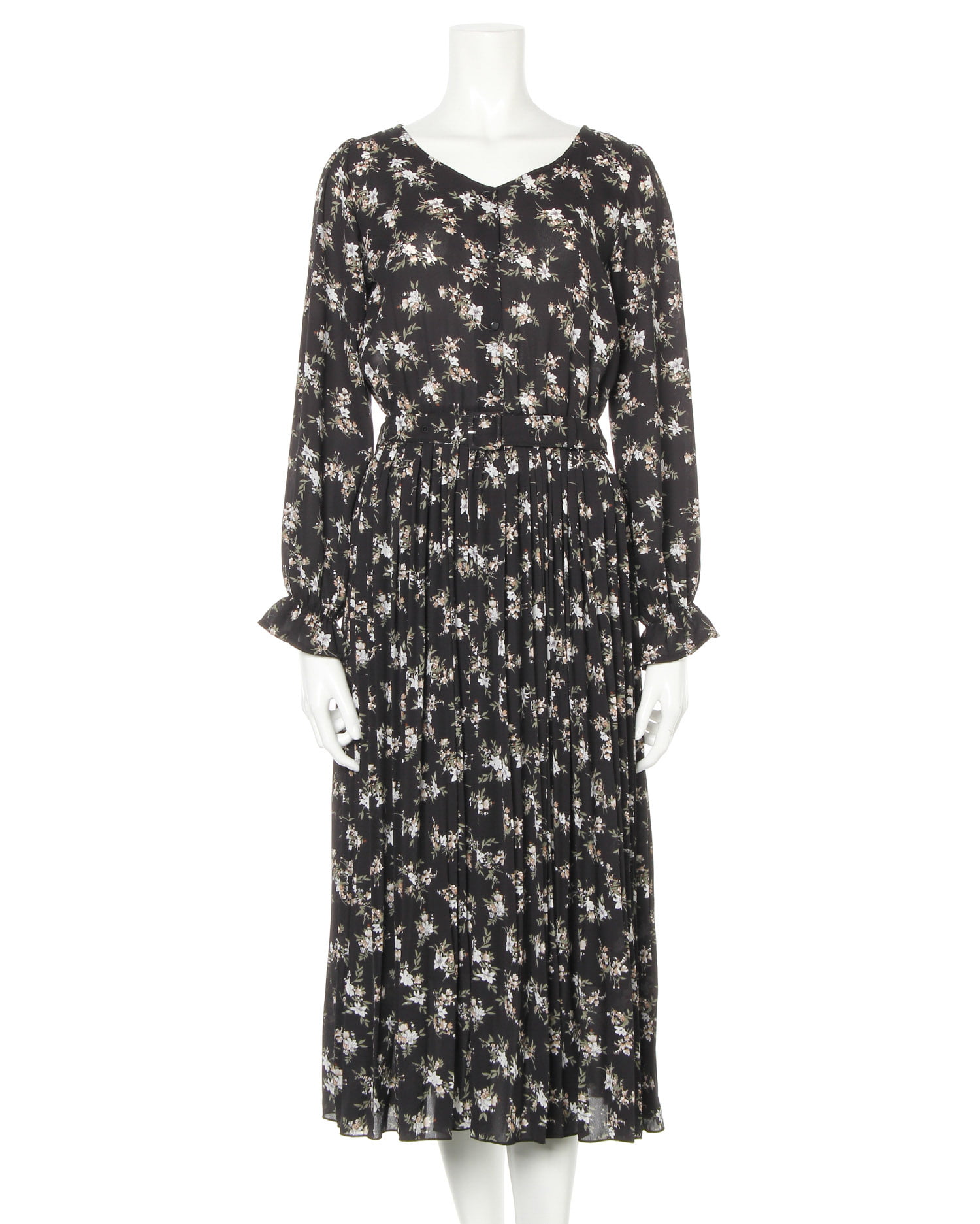 清楚感のある小花柄のワンピースはオンオフ問わずに着回せるおすすめアイテム。シャリ感のあるさらとりした素材で着心地は快適。ウエスト部分にはゴムを入れているので締め付け感もなく着やすくなっています。すっきり開いたネックラインが顔周りを明るく見せてくれるのもポイント。スカート部分は細めのプリーツでフェミニンな雰囲気になっています。スクエアバックルのベルト付き。