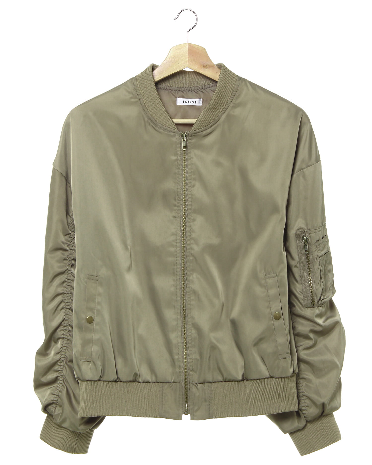 季節の変わり目に欠かせないMA-1ブルゾンは存在感抜群のビックシルエットが今年らしい。光沢のある滑らかな生地がカジュアル過ぎず上品な着こなしを提案します。ドロップショルダーやギャザーを寄せたスリーブデザインで女性らしい雰囲気をプラス。ショート丈は様々なボトムスとバランス良く合わせられて普段使いに活躍する事間違いなしです。やや薄手の素材は季節の変わり目のライトアウターとして追加決定。