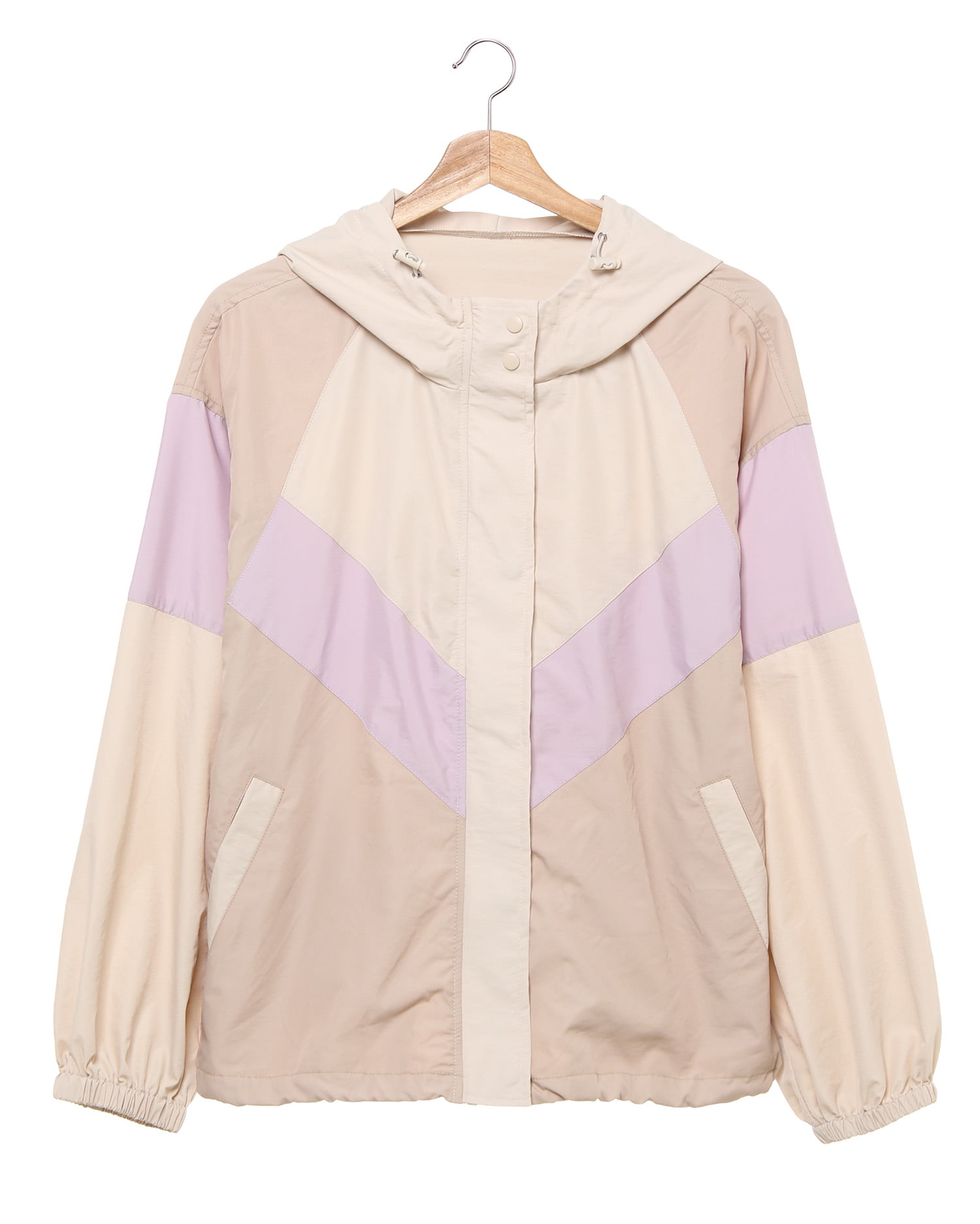 ゆったりシルエットのブルゾンはデイリー使いにぴったりの1枚。ブロッキングカラーがアクセントになっています。今年らしいきれいカラーを合わせることでカジュアルになりすぎず、フェミニンな雰囲気に。フロンは斜めに切り替えることですっきり見えを叶えます。フードとウエスト内側には風の侵入を防げるドローコードが付き。