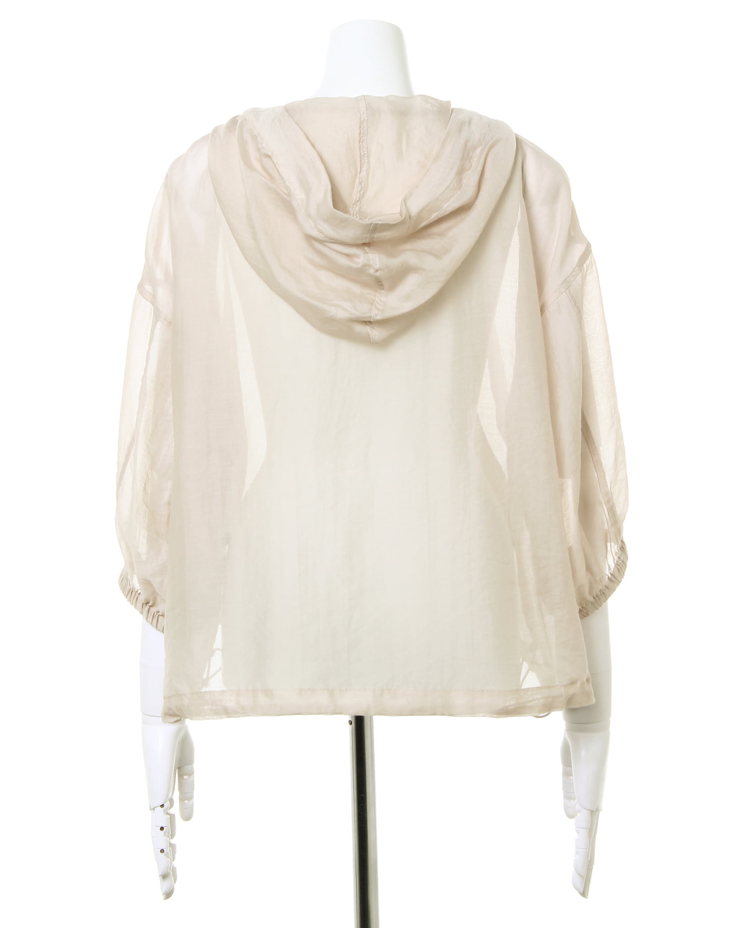 注目のシアーアイテムは普段のスタイルにプラスするだけでトレンドコーデが完成。ゆったりとしたシルエットとちょっぴり短めの裾丈でバランス良く合わせられます。薄手の生地は普段使いはもちろん、日よけとしても活躍。袖口にはゴムを入れているのでブラウジングも可能です。フード部分と裾には調節できるドローコード付き。
