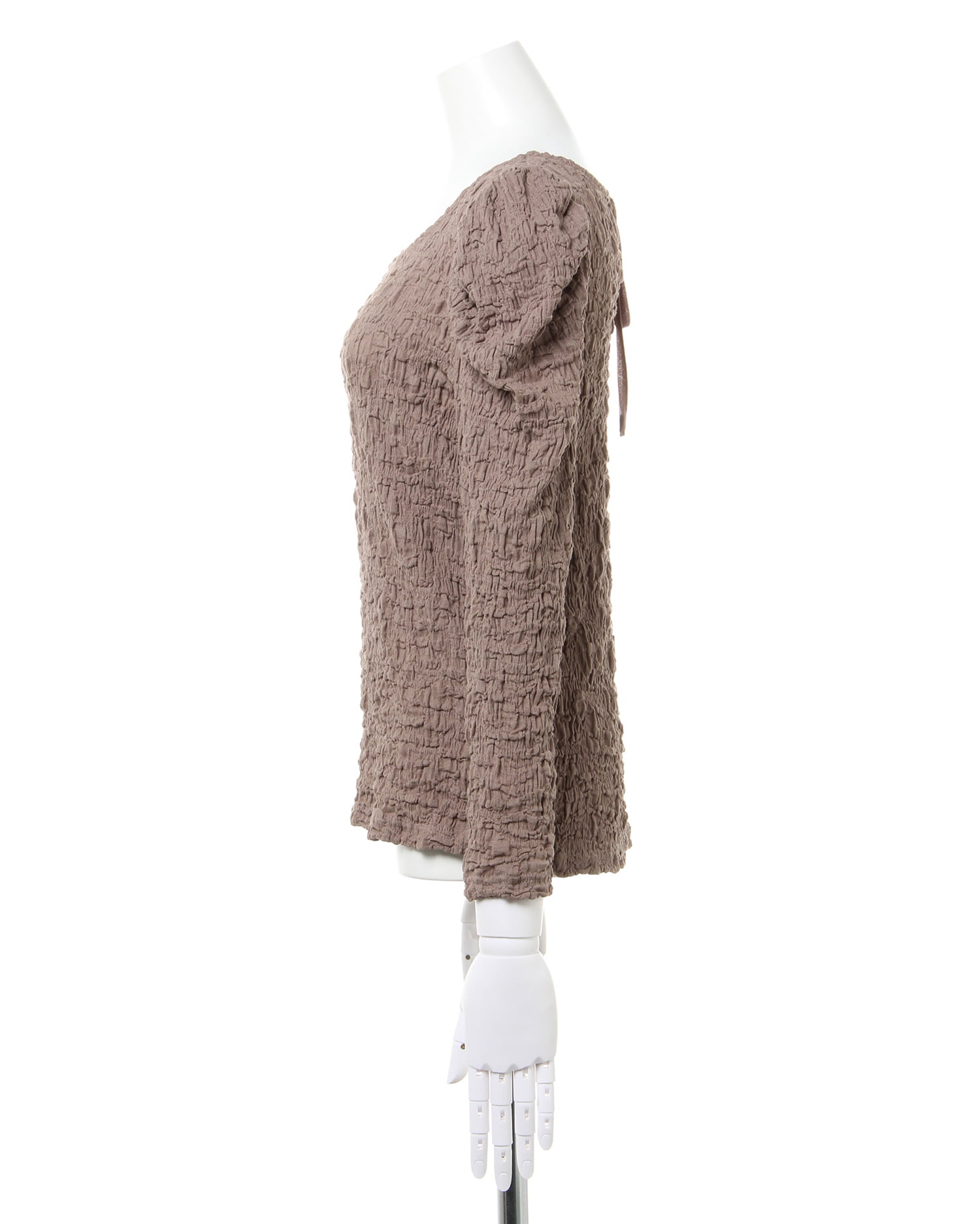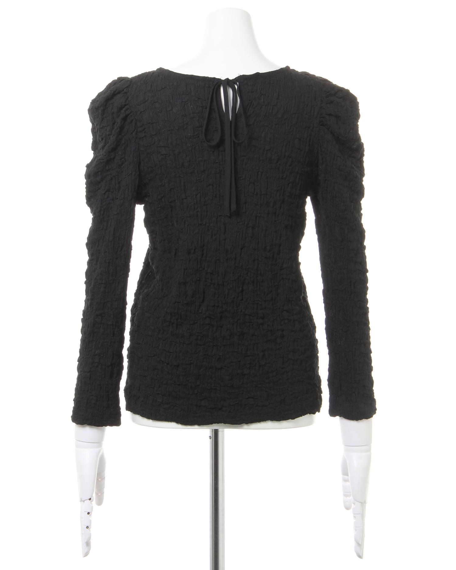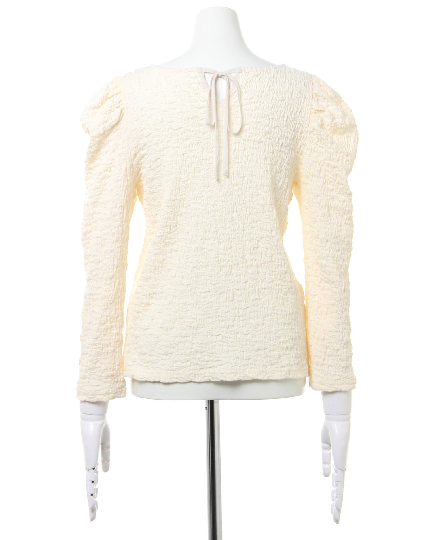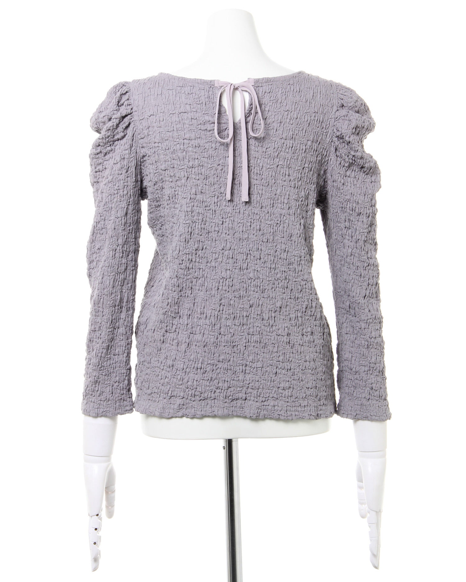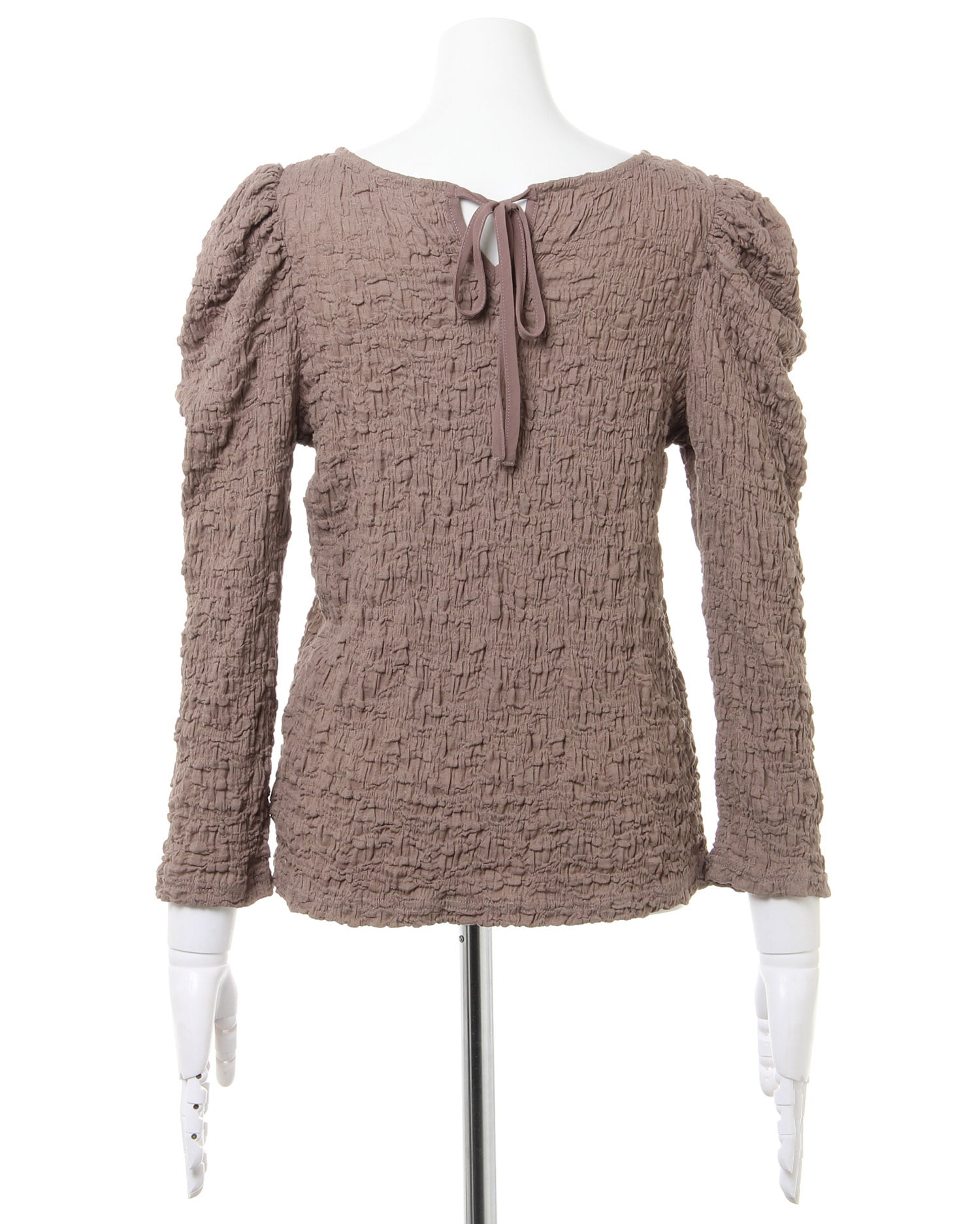 くしゅっとした立体感ある生地で表情のある着こなしが叶うロングスリーブトップス。伸縮性のあるやわらかな生地で着心地も快適です。ボディラインに沿うコンパクトなシルエットが上半身をすっきり見せてくれるのもポイント。どんなボトムスにも合わせやすいので普段使いにぴったりです。バックにあしらったリボンがフェミニンなアクセントに。