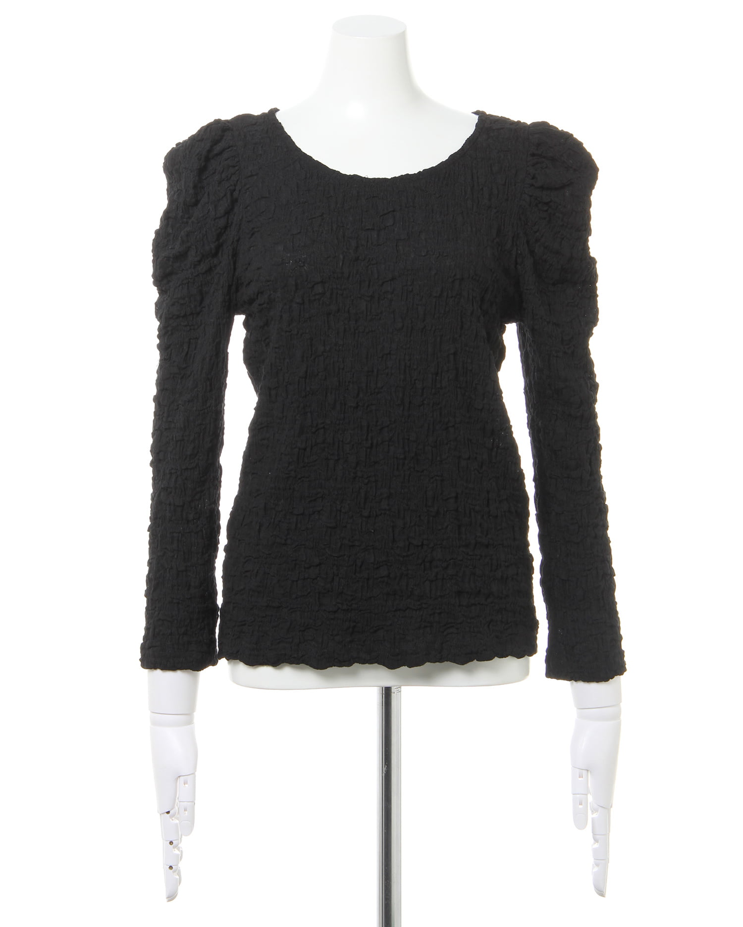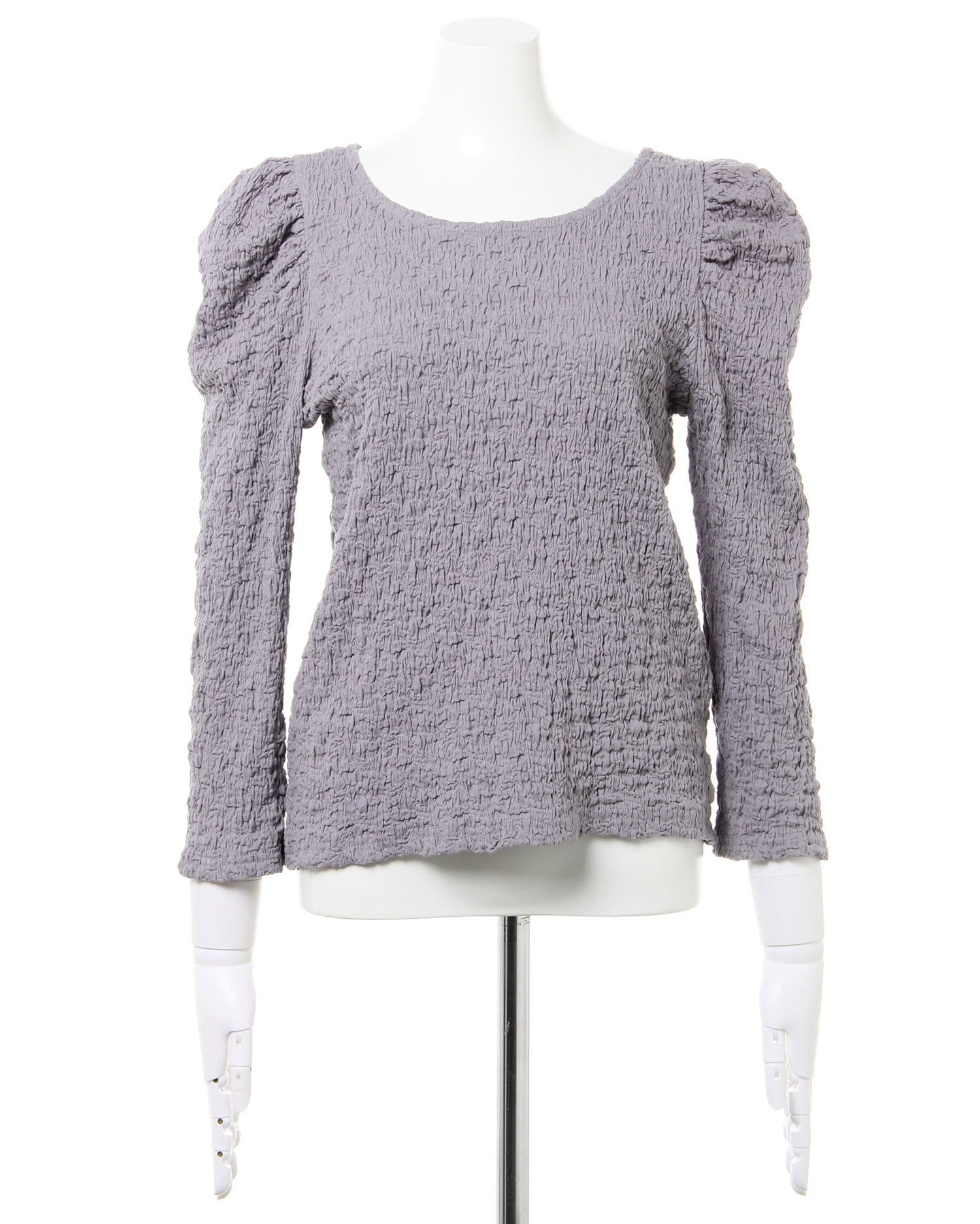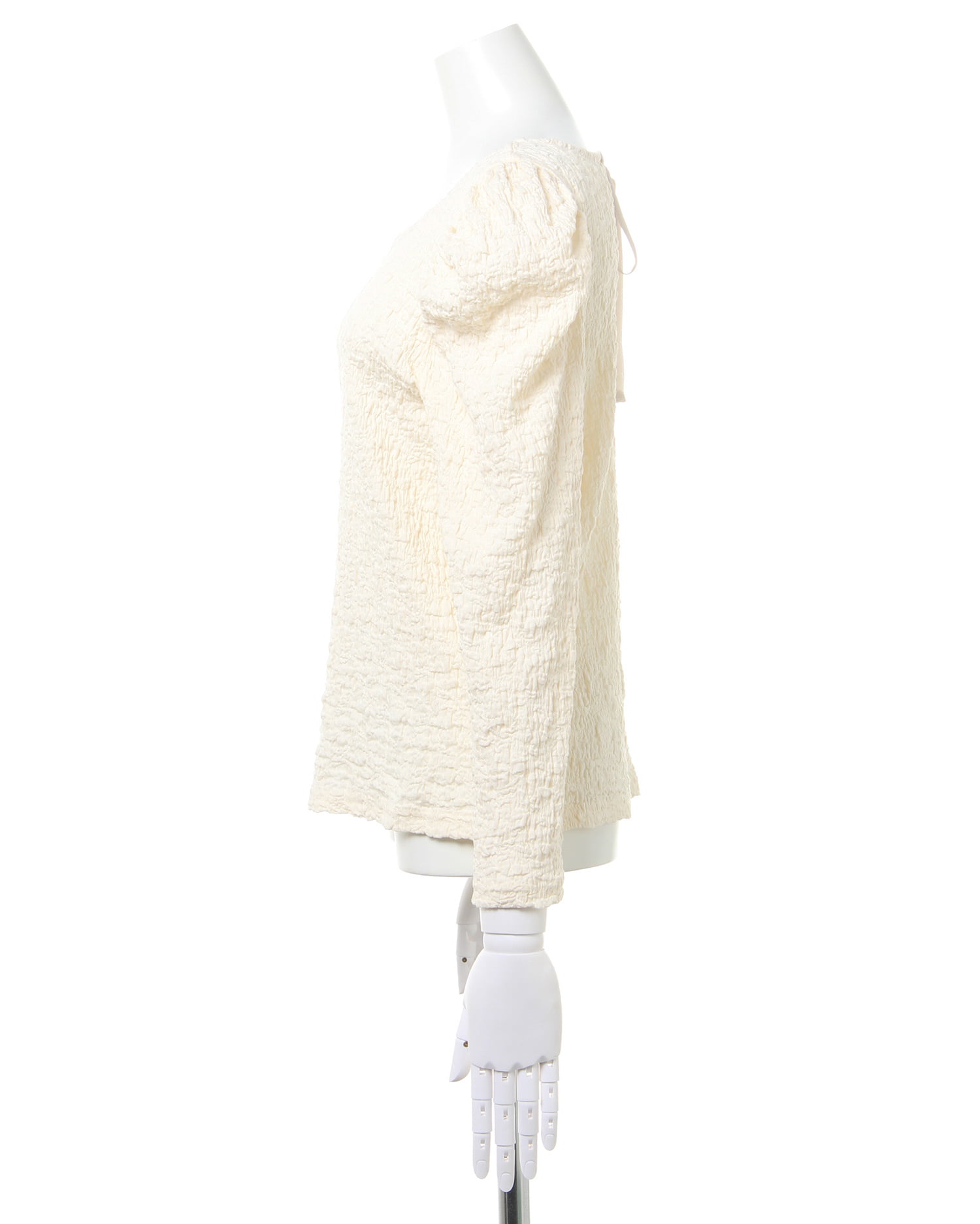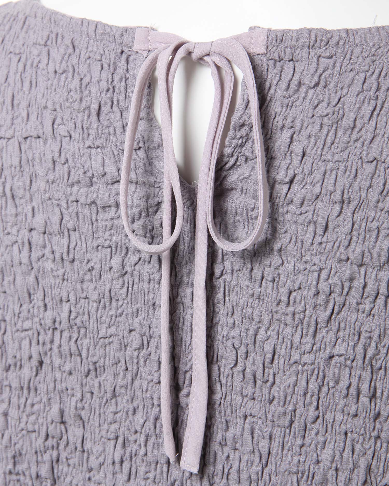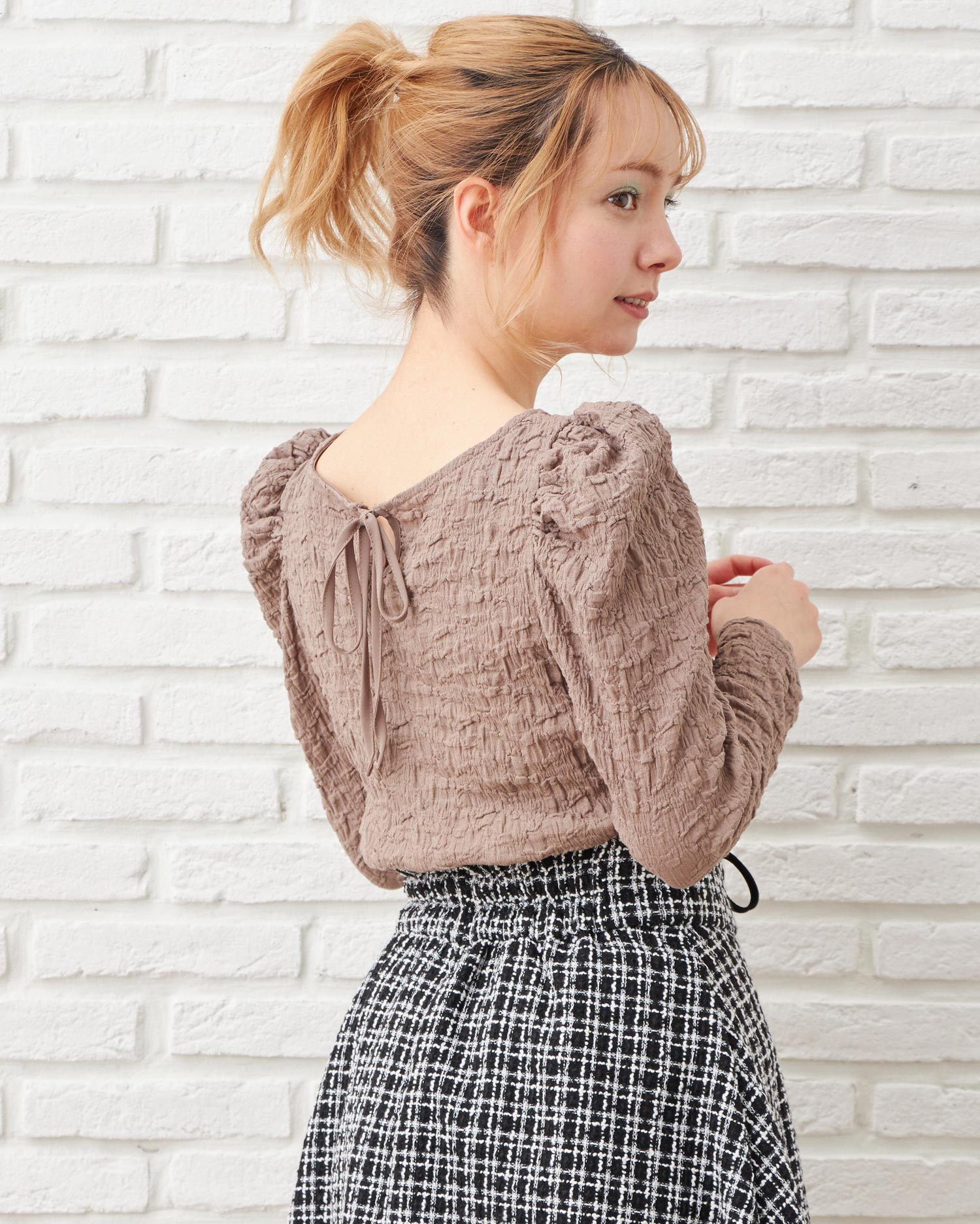 くしゅっとした立体感ある生地で表情のある着こなしが叶うロングスリーブトップス。伸縮性のあるやわらかな生地で着心地も快適です。ボディラインに沿うコンパクトなシルエットが上半身をすっきり見せてくれるのもポイント。どんなボトムスにも合わせやすいので普段使いにぴったりです。バックにあしらったリボンがフェミニンなアクセントに。