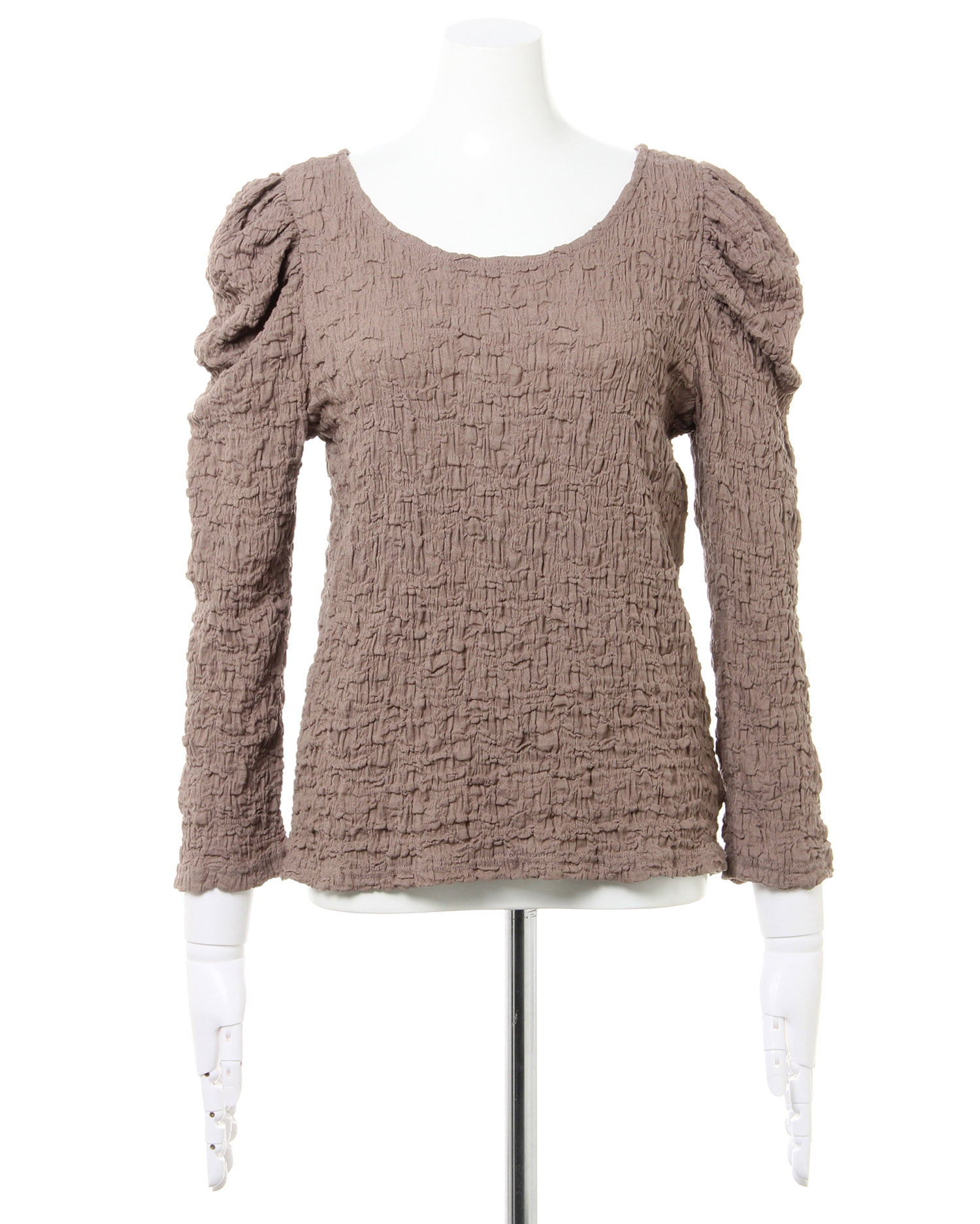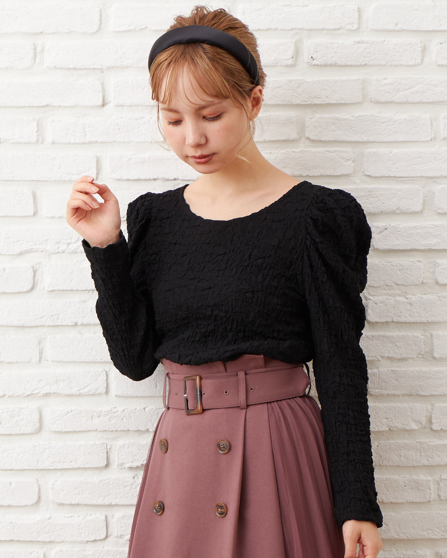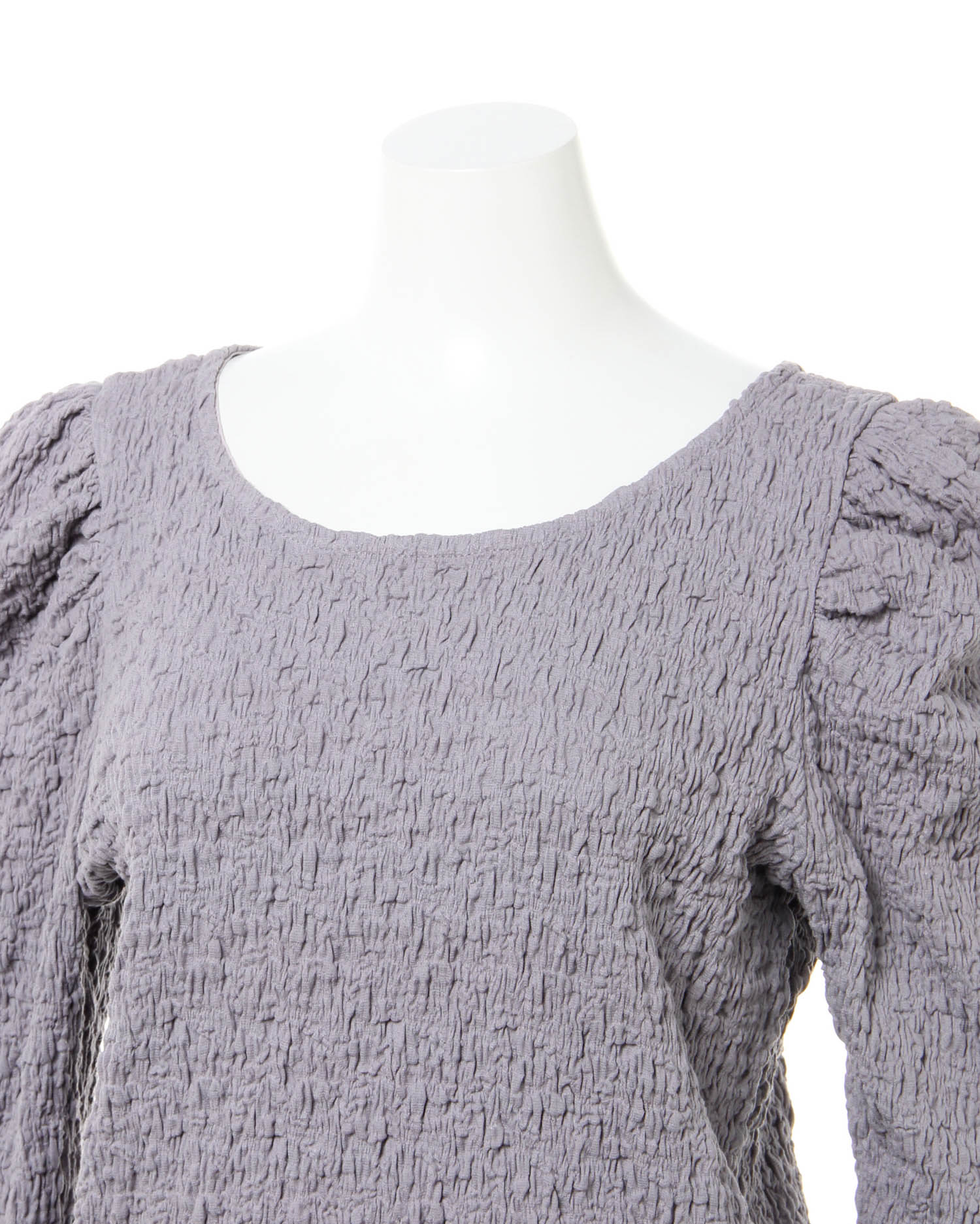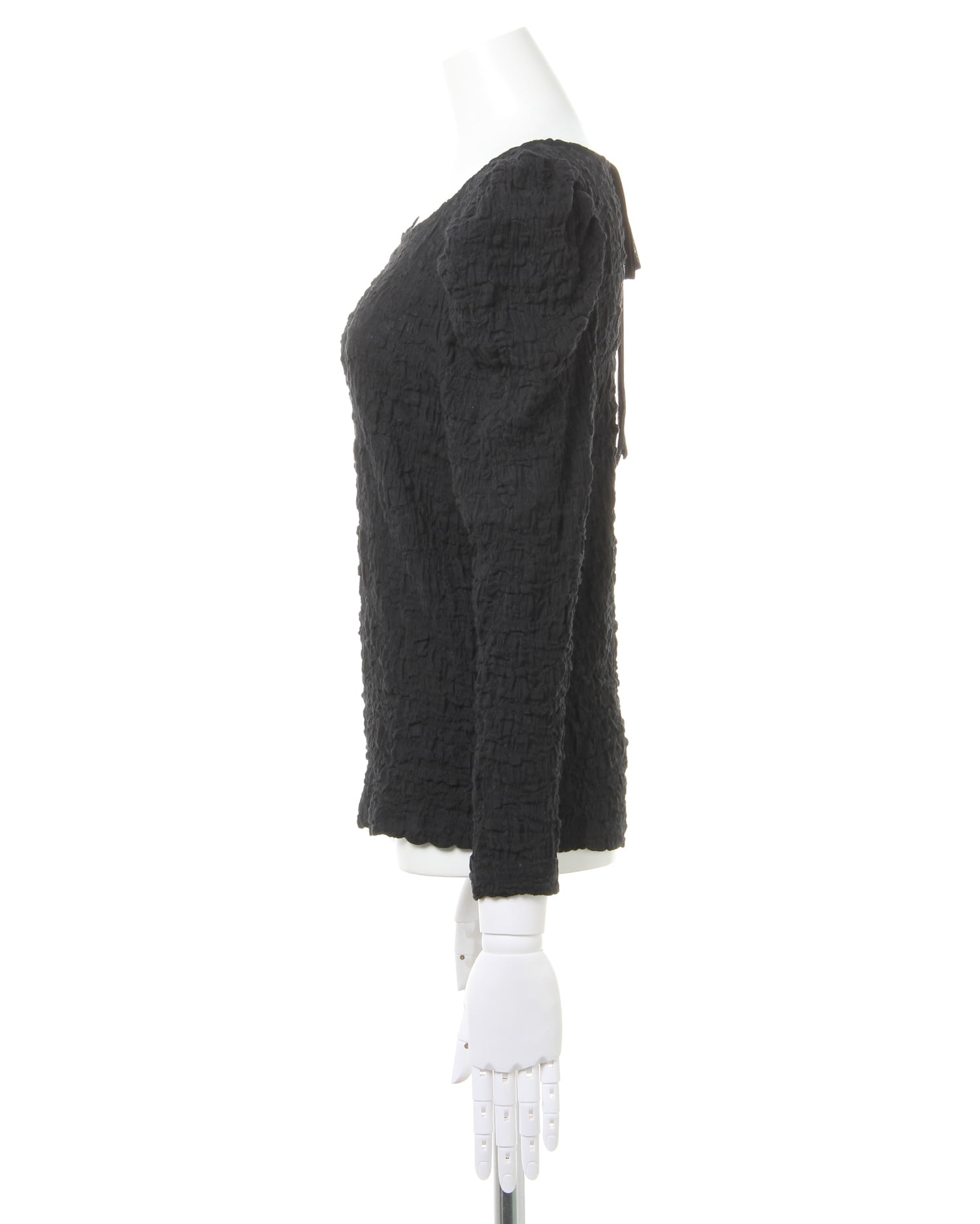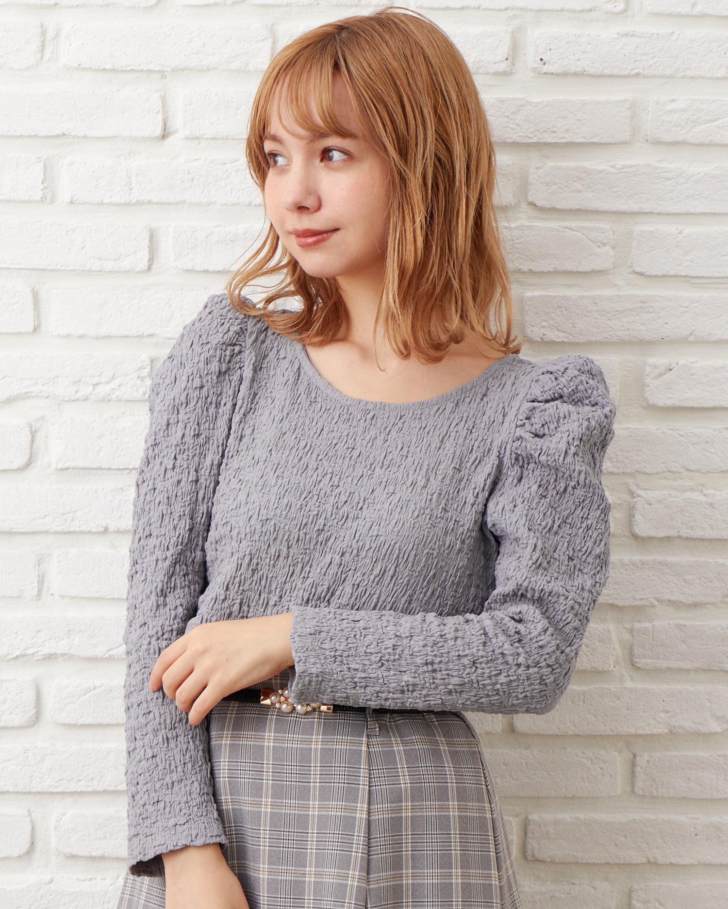 くしゅっとした立体感ある生地で表情のある着こなしが叶うロングスリーブトップス。伸縮性のあるやわらかな生地で着心地も快適です。ボディラインに沿うコンパクトなシルエットが上半身をすっきり見せてくれるのもポイント。どんなボトムスにも合わせやすいので普段使いにぴったりです。バックにあしらったリボンがフェミニンなアクセントに。