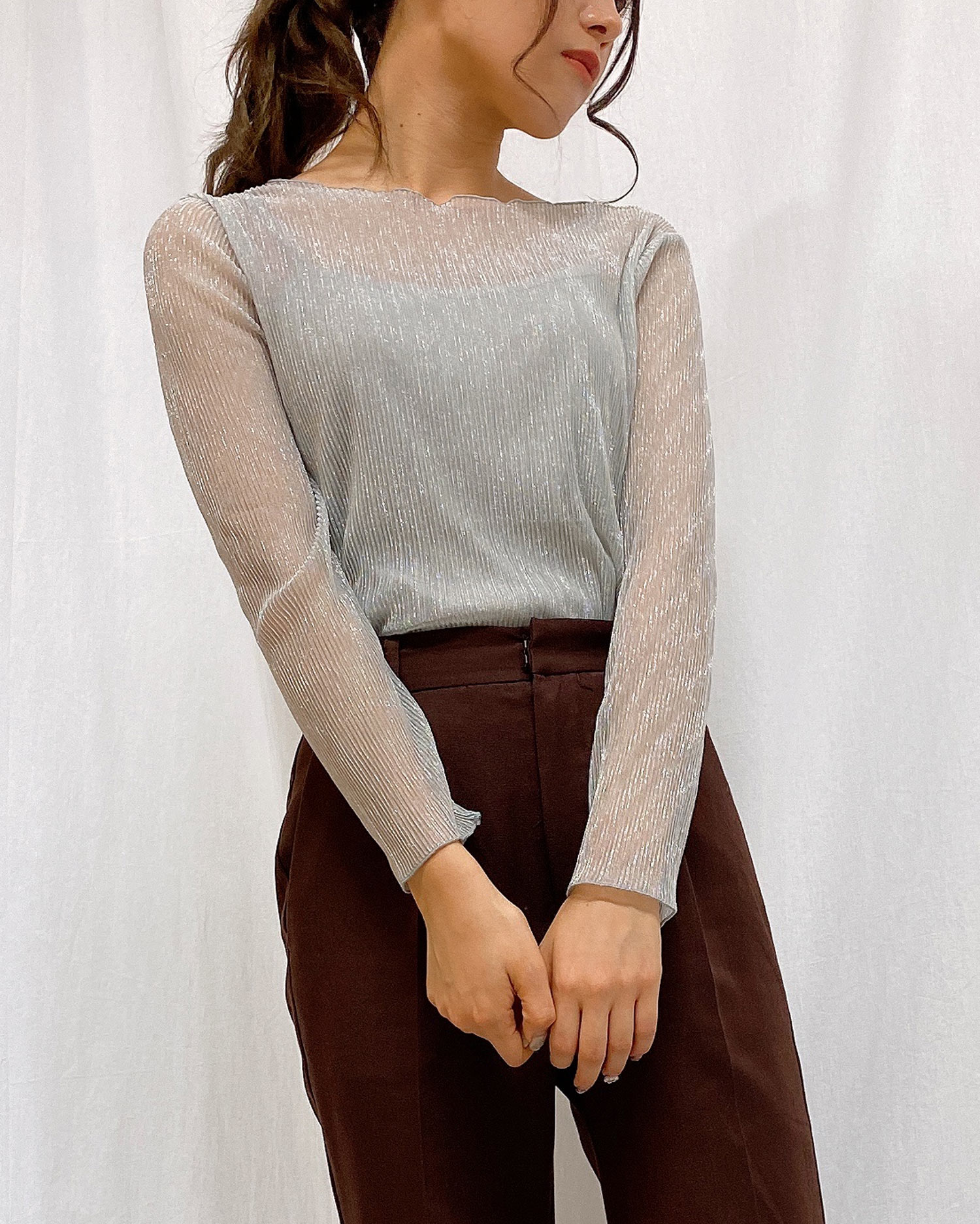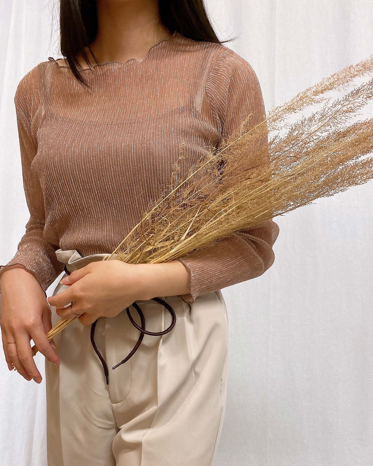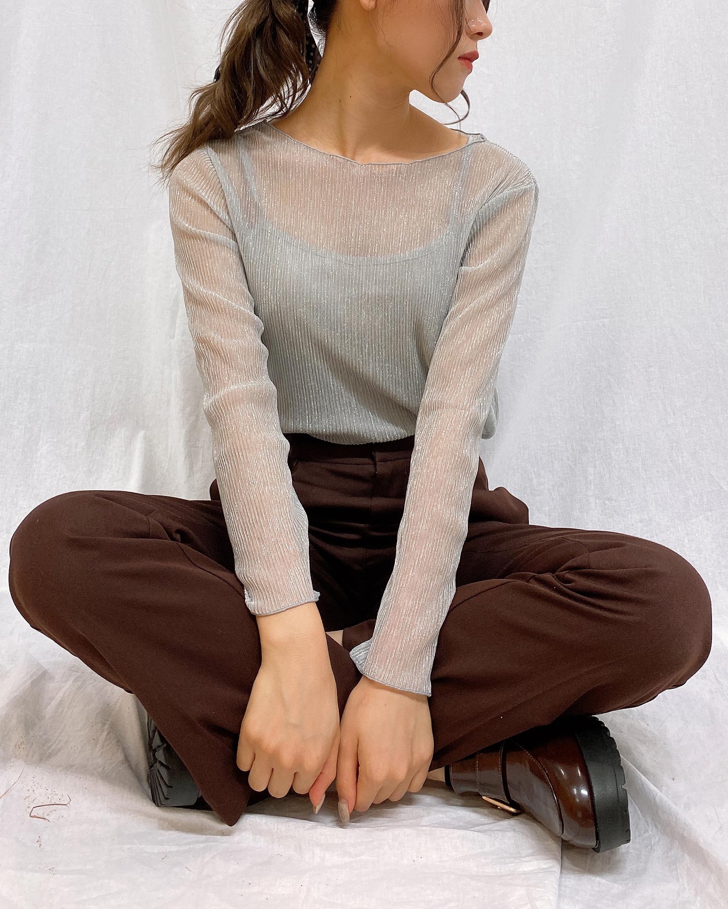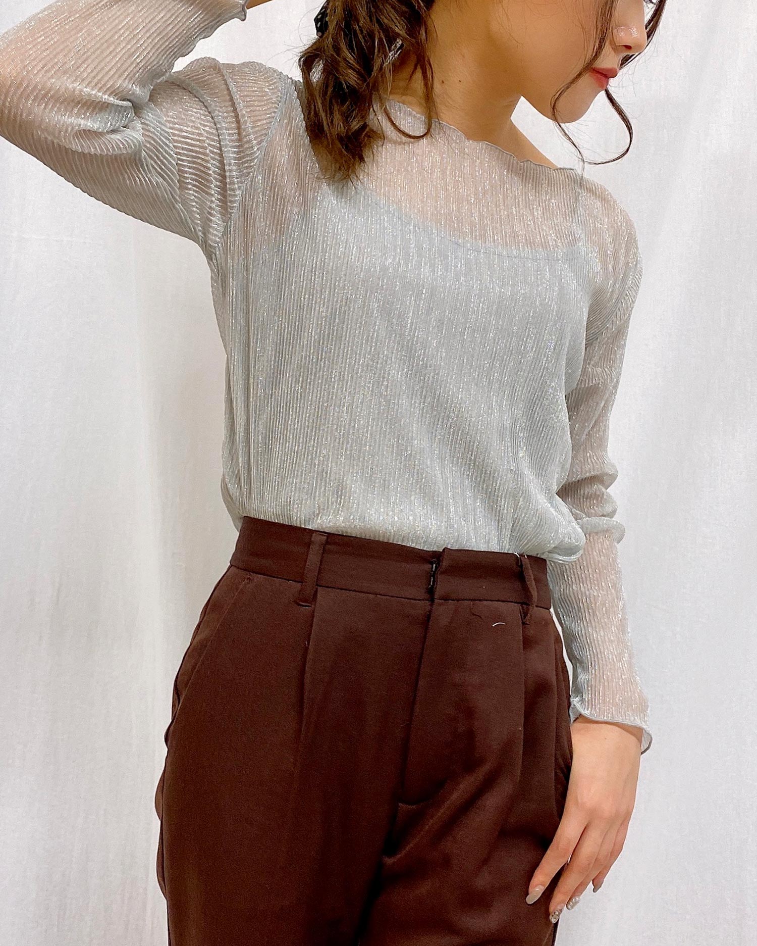 トレンドのシアー素材にラメを散りばめたトップスはコーディネイトの主役級の存在感。表情のあるプリーツ加工を施した生地との組み合わせで華やかな印象に仕上げています。首元や裾部分にはメロウデザインでフェミニン要素をプラス。同系色のシンプルなキャミソールがセットになっているので、計算ずくのレイヤードスタイルが完成します。