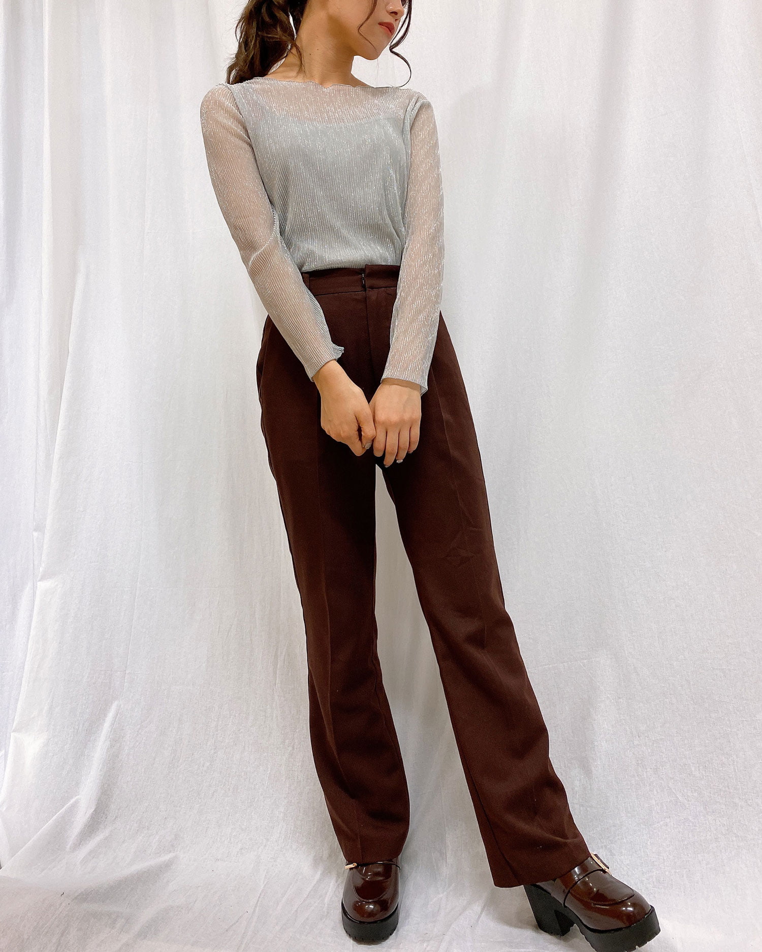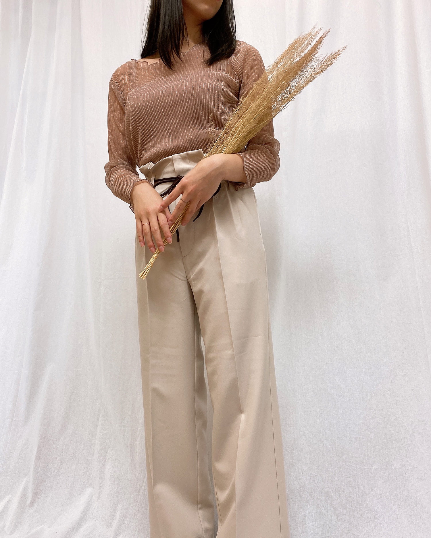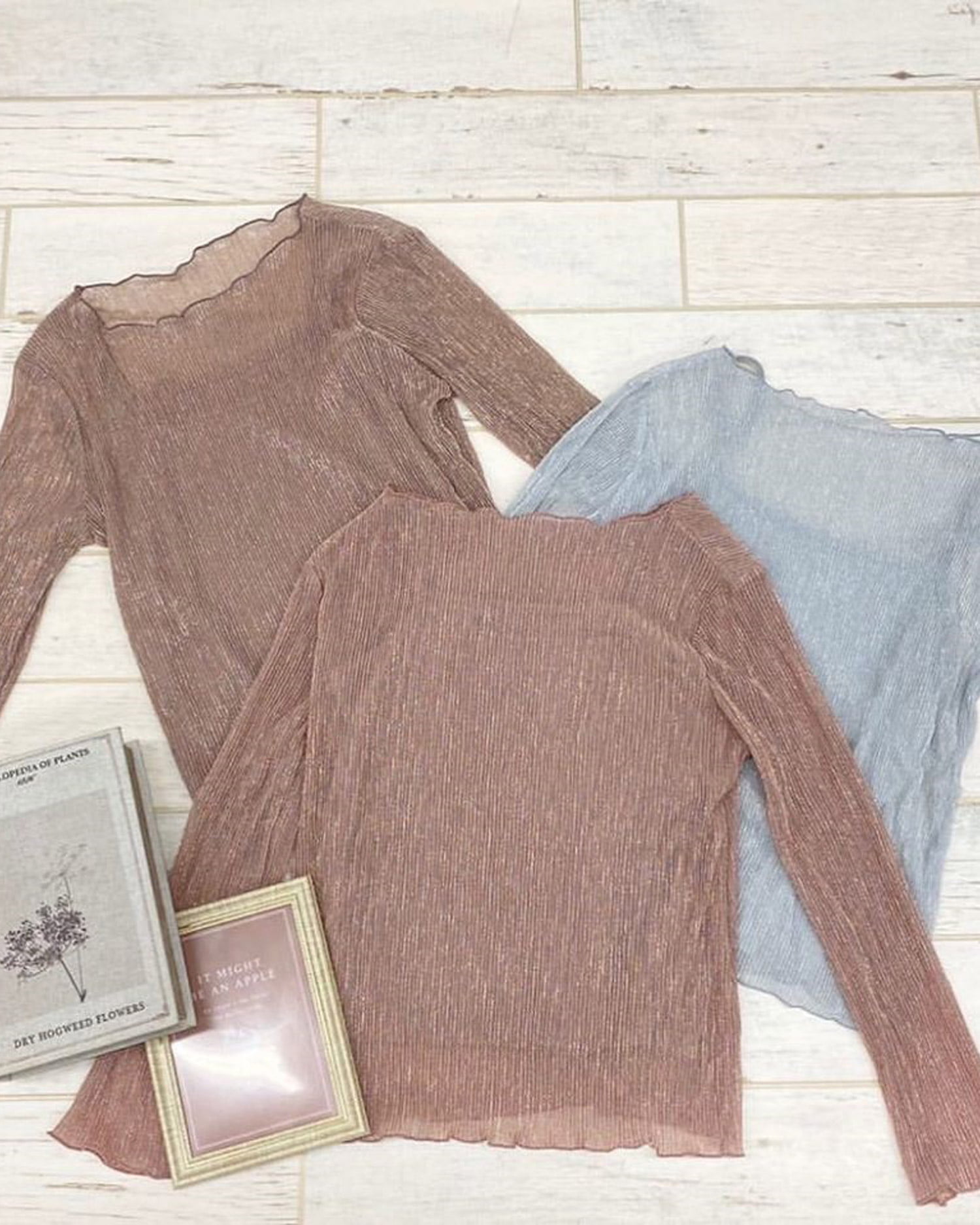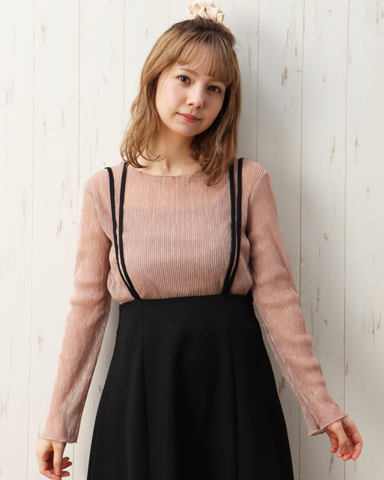 トレンドのシアー素材にラメを散りばめたトップスはコーディネイトの主役級の存在感。表情のあるプリーツ加工を施した生地との組み合わせで華やかな印象に仕上げています。首元や裾部分にはメロウデザインでフェミニン要素をプラス。同系色のシンプルなキャミソールがセットになっているので、計算ずくのレイヤードスタイルが完成します。