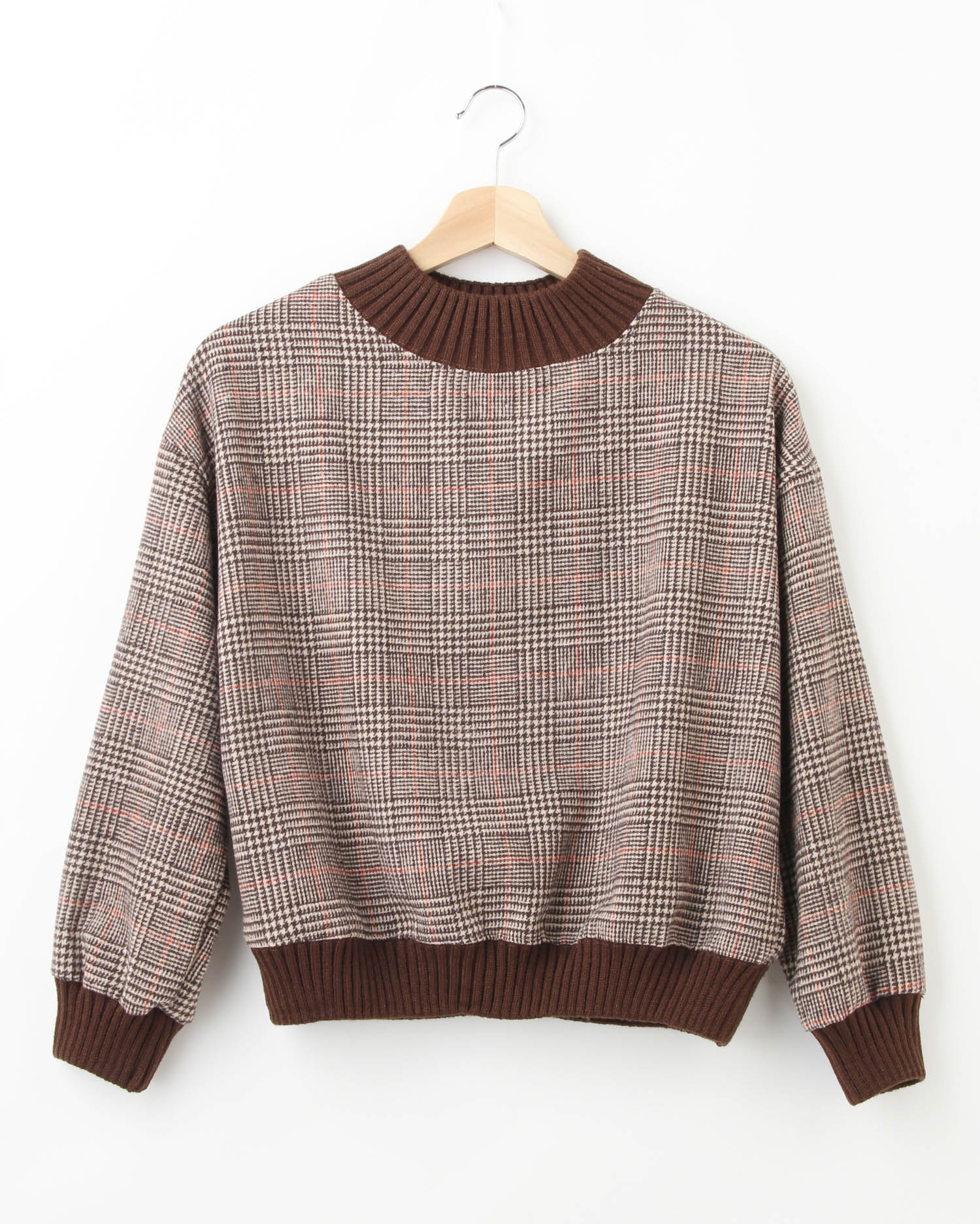 トラッド&クラシカルなチェック柄のプルオーバー。落ち着いたカラーで仕上げているので大人っぽく着られます。小顔効果も期待出来るモックネックでトレンド感たっぷりのスタイルが完成。首元や袖口にリブニットを組み合わせてアクセントにしています。ゆったりとした身頃で着心地も快適。パンツにもスカートにも合わせやすい程よい裾丈もポイントです。