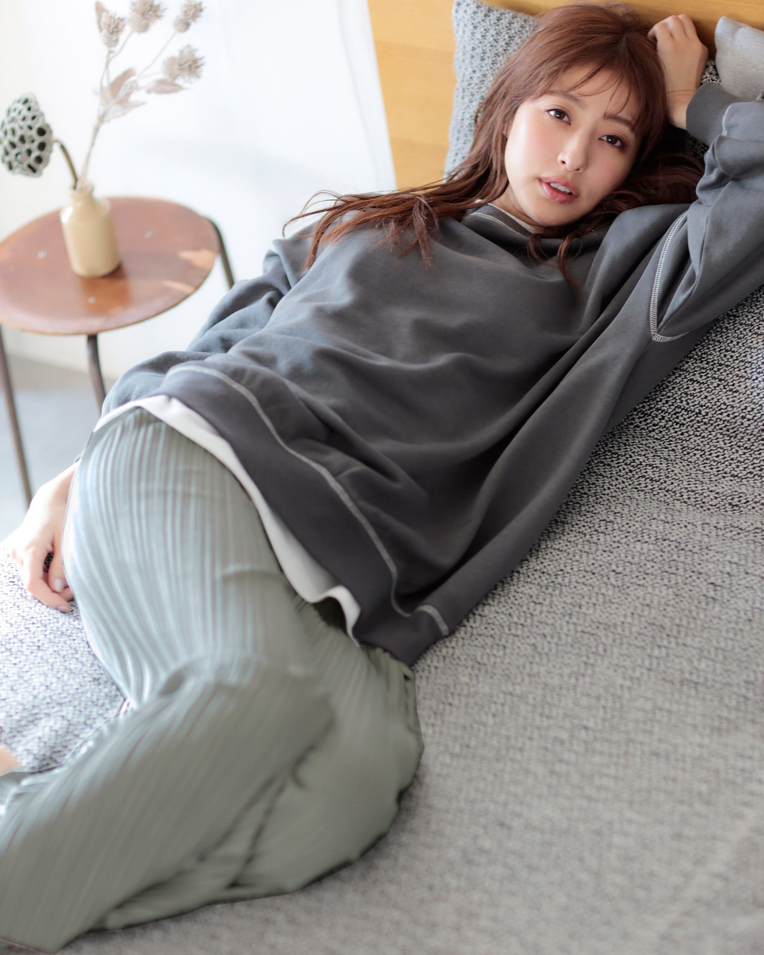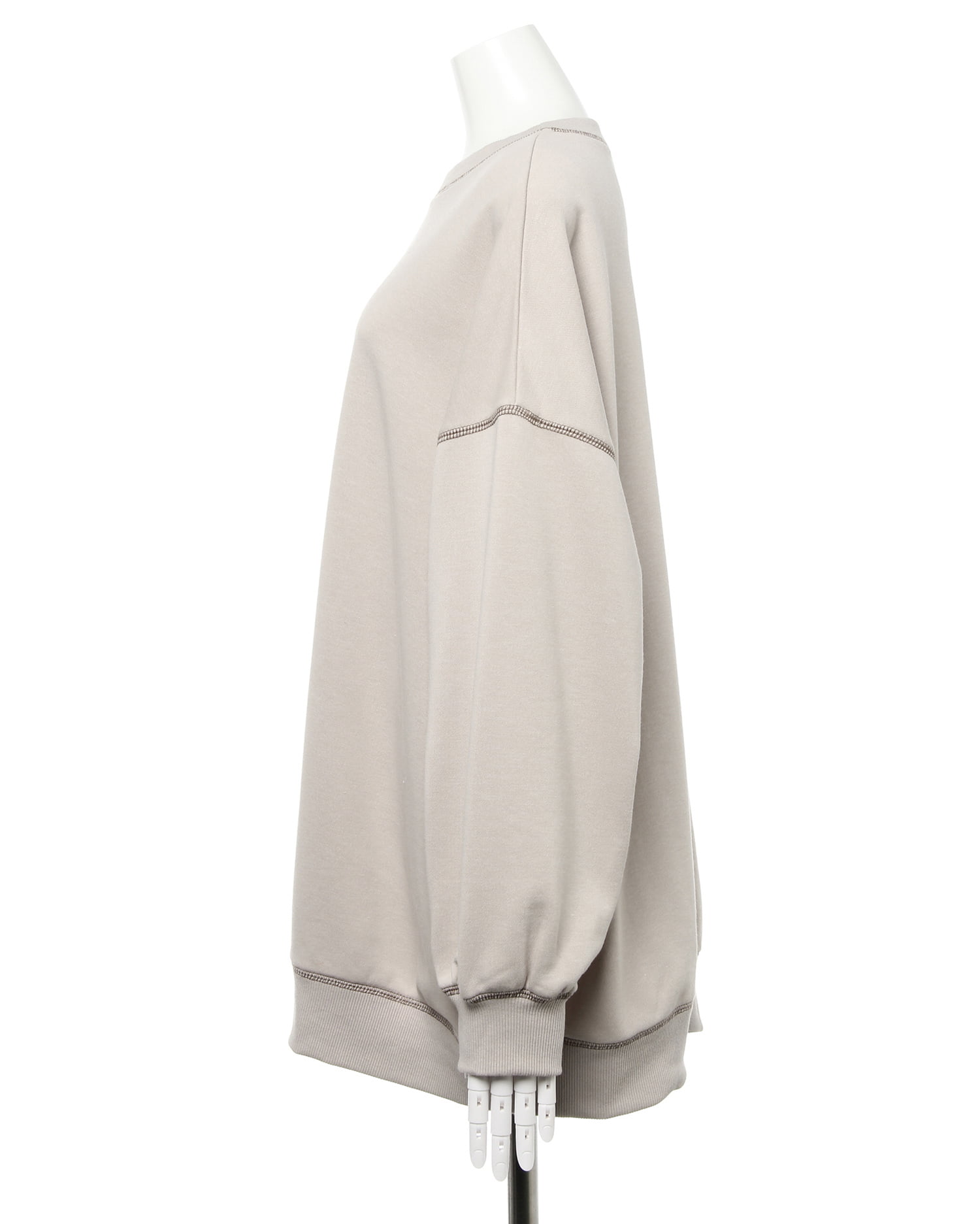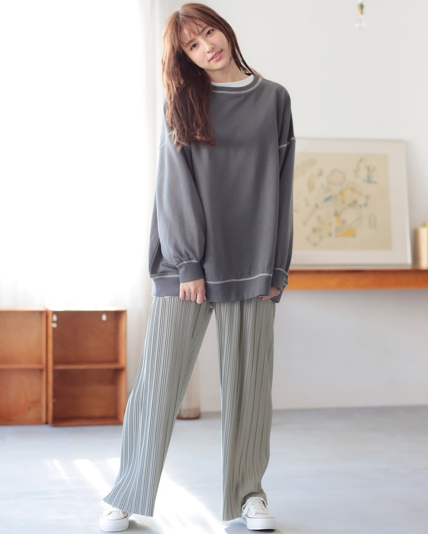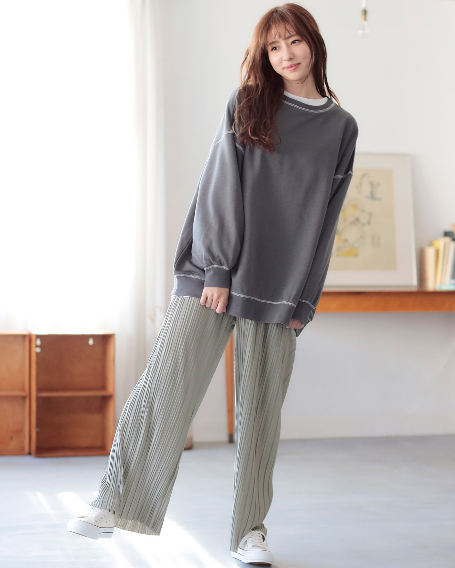 ボディラインを拾わないオーバーサイズのスウェットトップスでトレンドライクな着こなしへ。シンプルな無地に配色ステッチがアクセントになっています。やわらかで伸縮性のある生地で着心地も快適。程よい厚みのスウェットは1枚で着るのはもちろん、インナーを合わせてシーズン長く着回せます。ベーシックなカラーからキレイめカラーまでバリエーションも豊富。