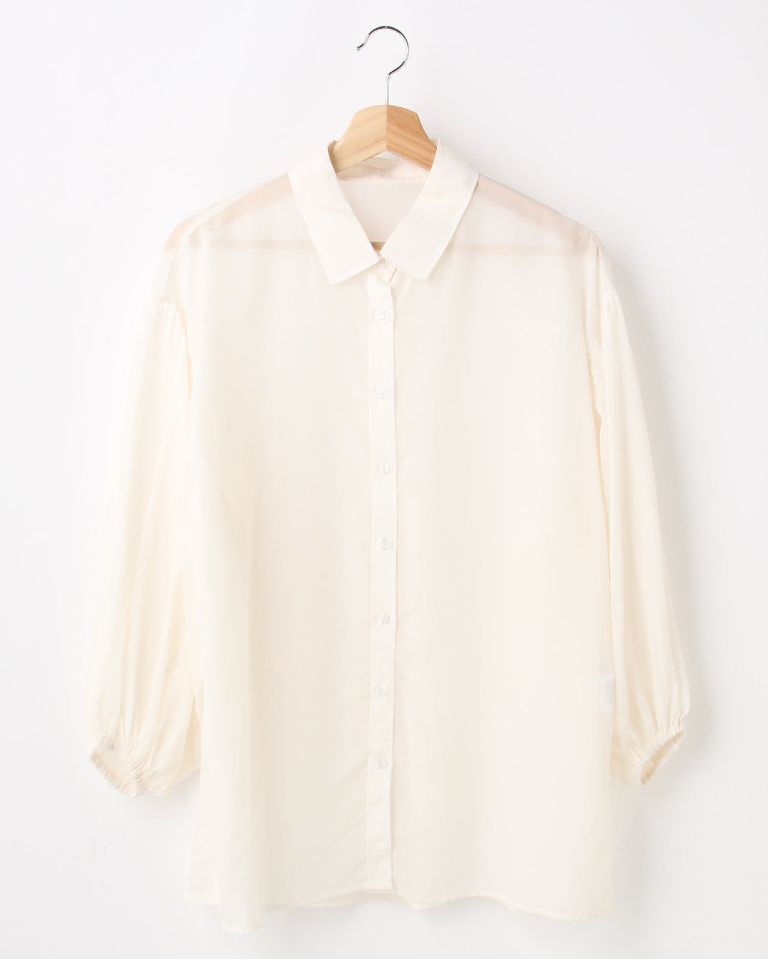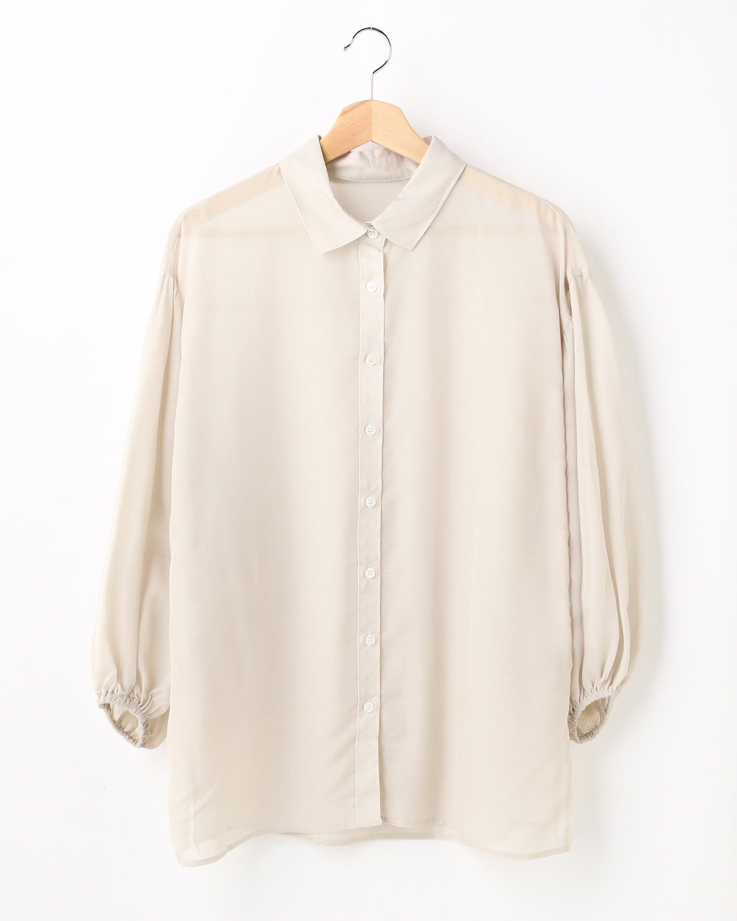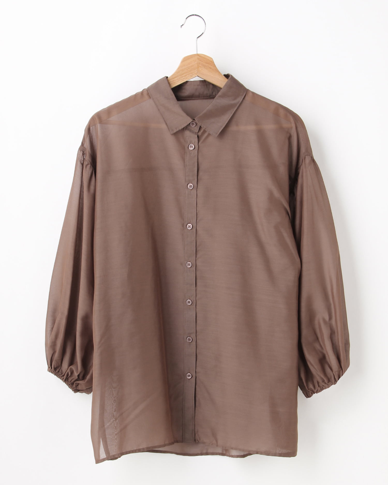 普段のスタイルに合わせるだけで程よく力を抜いた大人ラフコーデが完成するシアーシャツ。ふんわりとしたボリュームスリーブとゆったりとした身頃でキュートな雰囲気に仕上げています。長めの裾丈は気になる腰回りをカバー。ウエストマークした着こなしもおすすめです。今年らしいニュアンスカラーがラインナップ。
