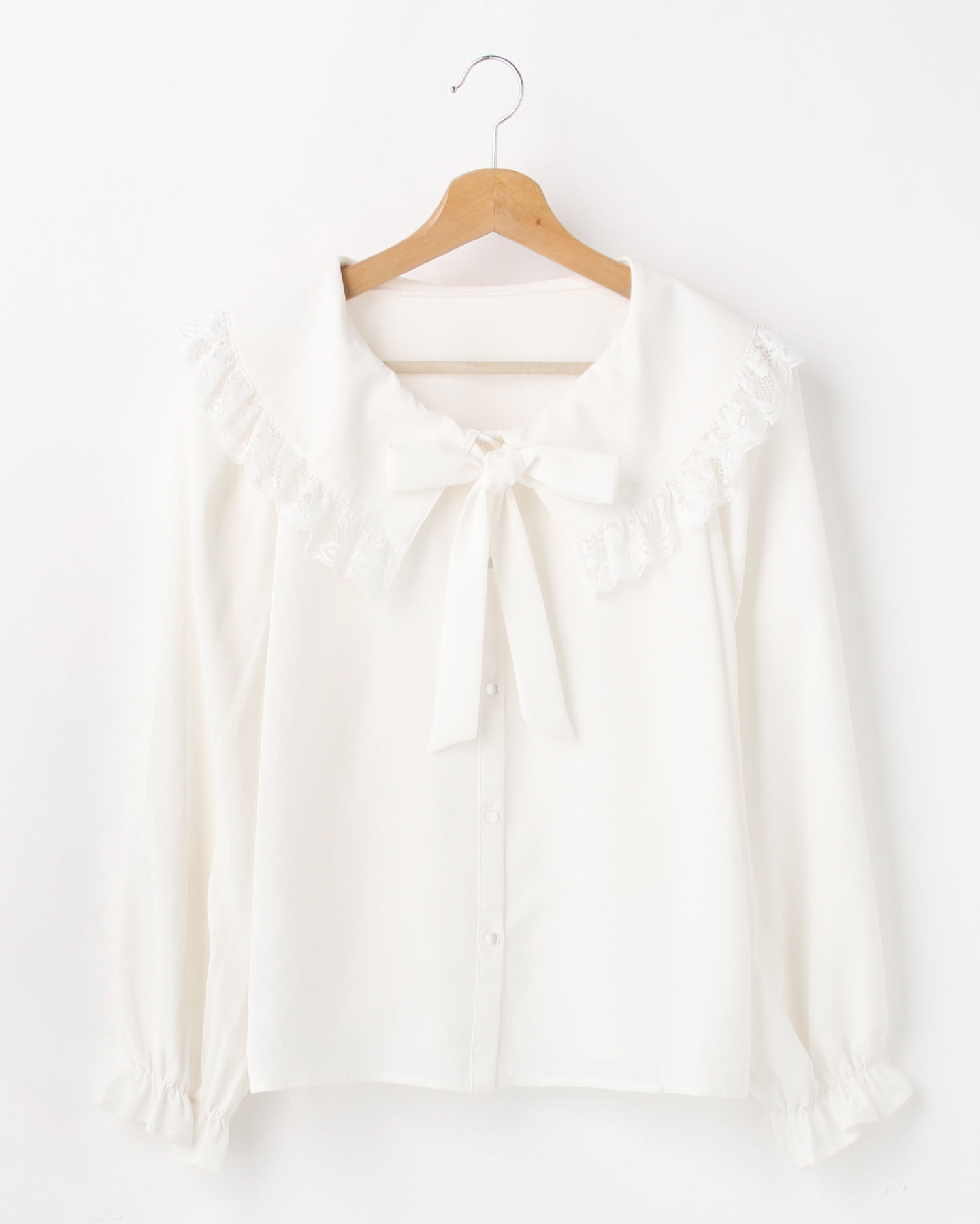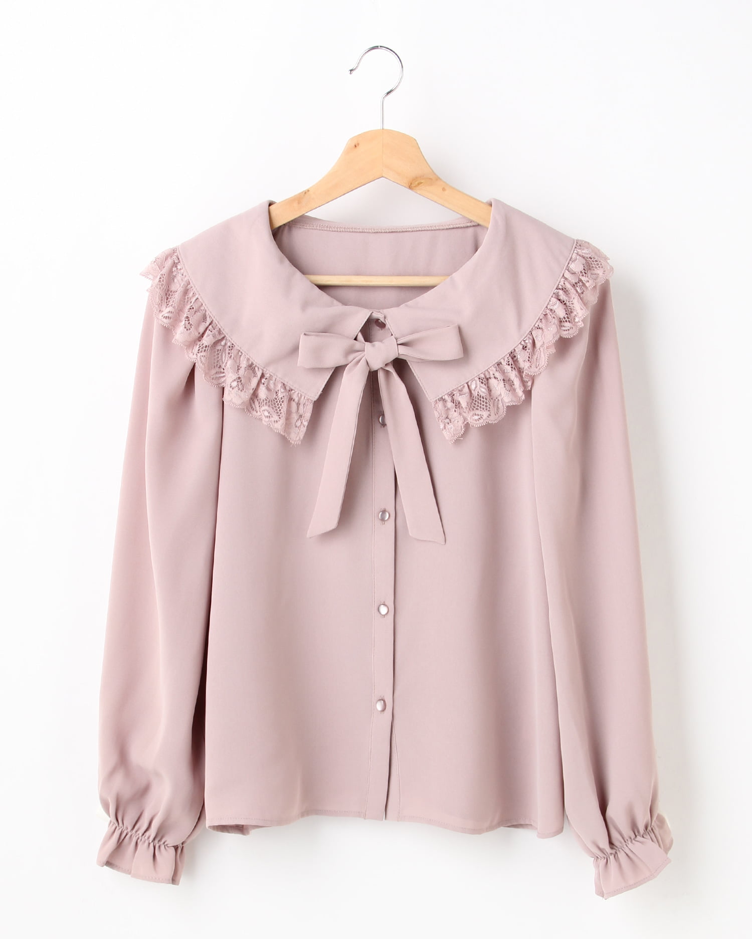 繊細なレースをあしらった大きな襟がフェミニン&キュートなブラウス。取り外し可能なボウタイリボン付きで顔周りを華やかに見せてくれるデザインになっています。薄手の素材で、1枚ではもちろんジャケットやニットのインにも着回せるのでシーズン長く活躍。程よい裾丈はトップスインスタイルで着こなすのもおすすめです。ふんわりスリーブの袖口にはゴム入り。