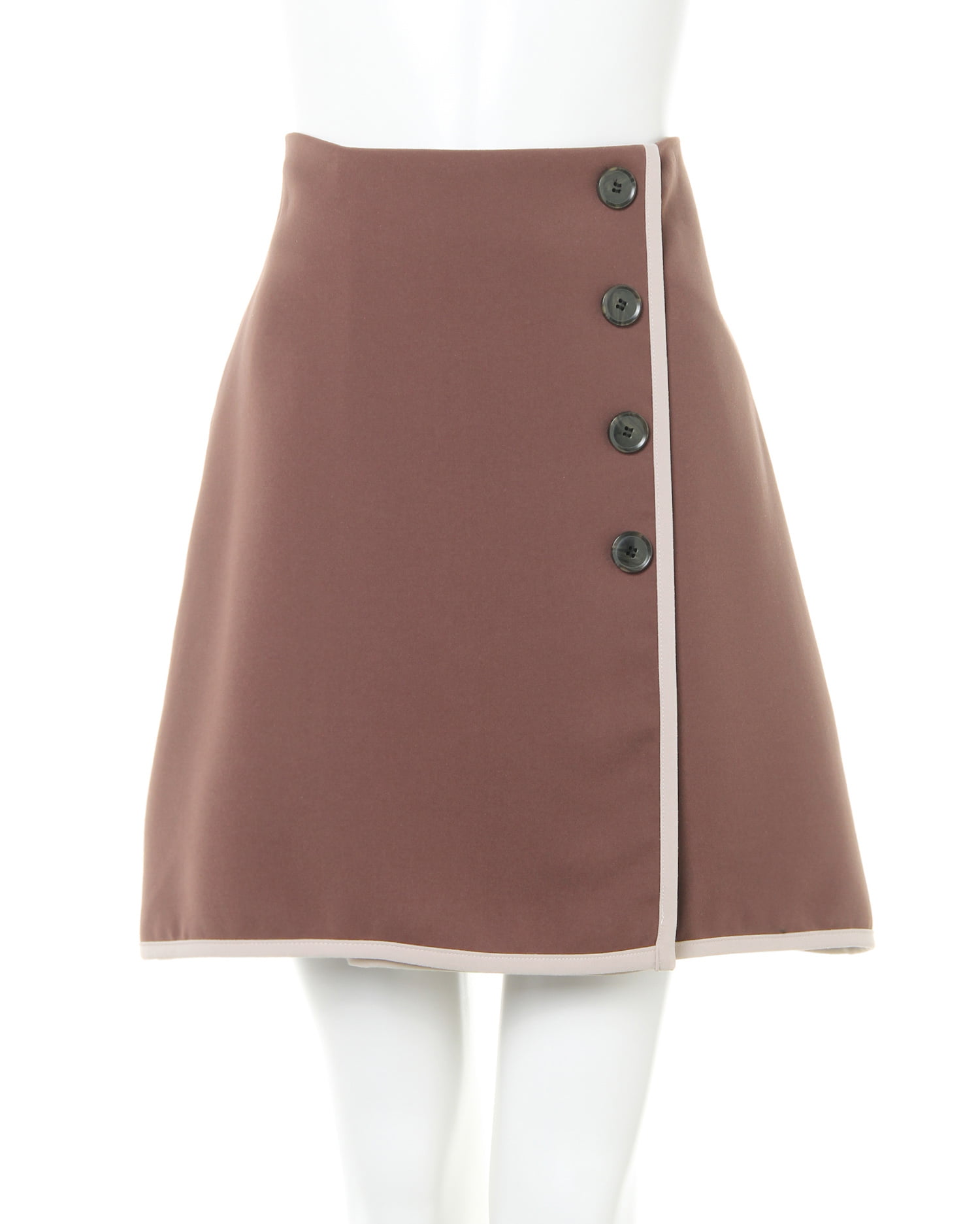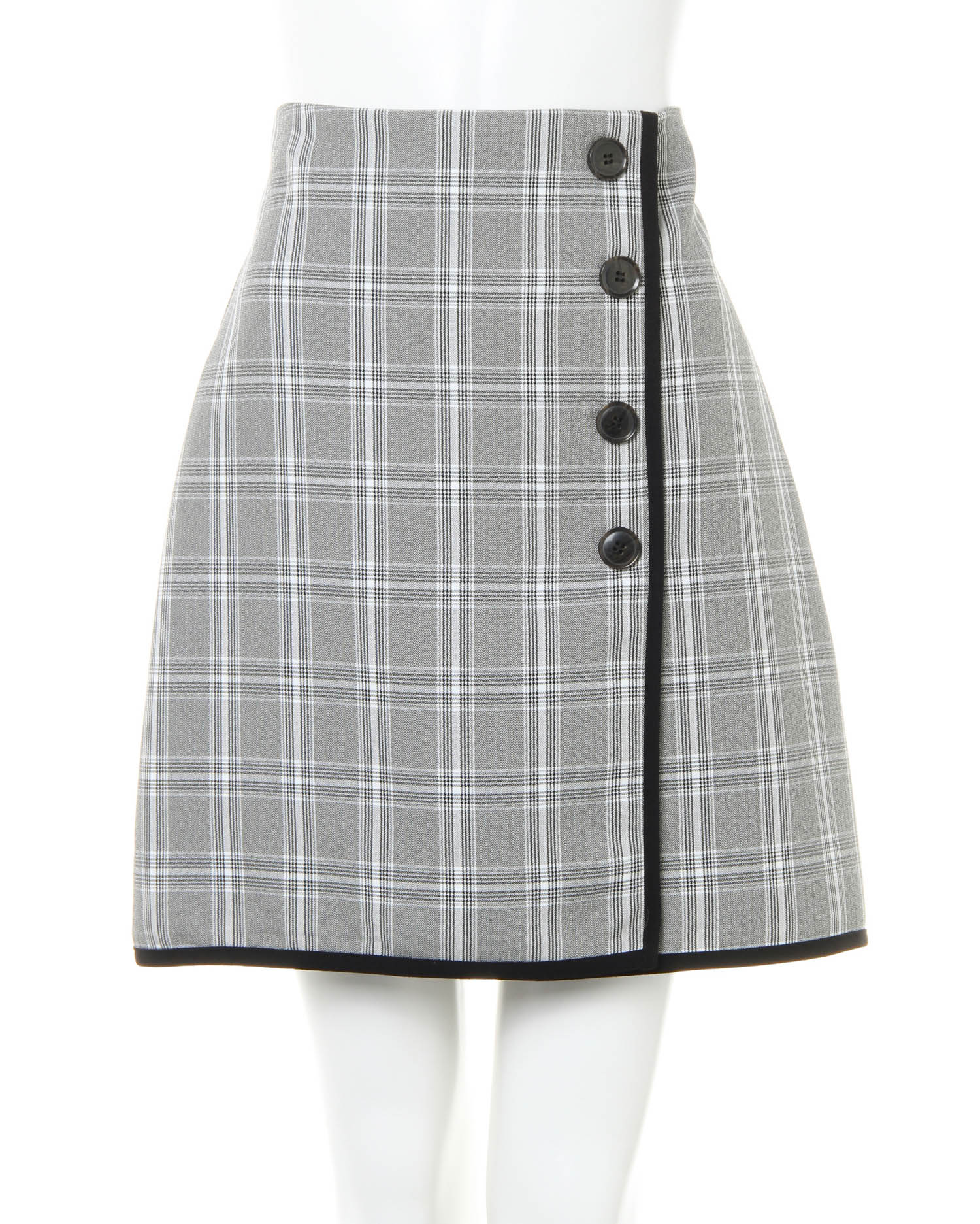 配色パイピングがアクセントになったミニ丈のスカートは台形シルエットがポイント。腰回りをすっきり、裾へ向かって広がるラインが美脚を叶えます。レトロなボタンをあしらったラップ風のデザインが◎。フロントの重なり部分は縫い付けてあるのではだける心配もありません。バックウエストはゴム&ジップで脱ぎ穿きも楽ちん。合わせやすい無地や大人可愛いチェック柄が揃っています。