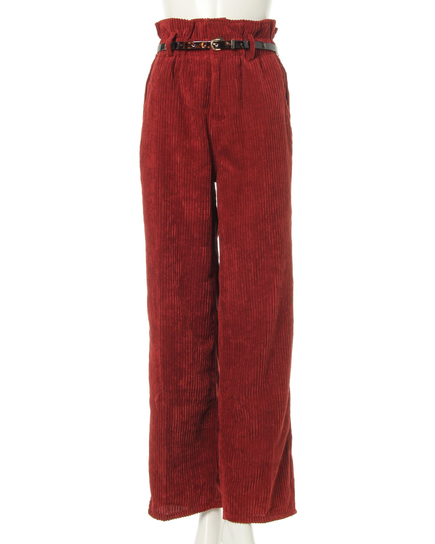 太畝のコーデュロイ素材とワイドなシルエットでこなれ感たっぷりに着こなせるパンツ。ウエスト部分はゴムになっているので程よいフィット感があります。ウエスト上にはフリルをあしらっているのでトップスインスタイルで着こなすのもおすすめ。ウエストマークに便利な細帯のベルトがセットになっています。気になる腰回りをすっきり、スタイルアップも狙えるアイテムは今すぐワードローブに追加決定です。