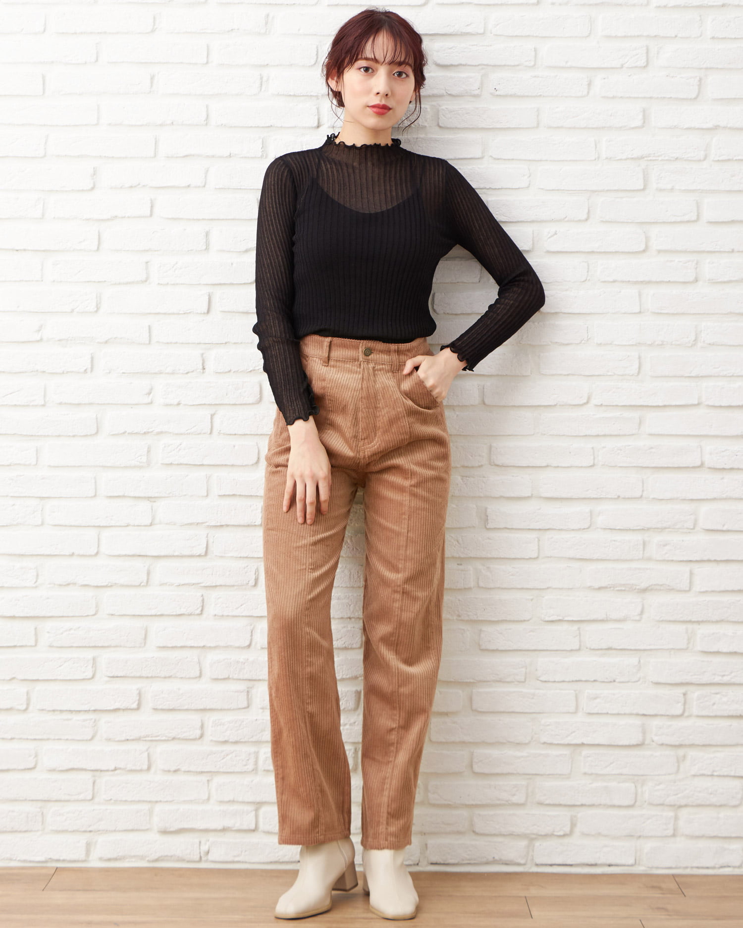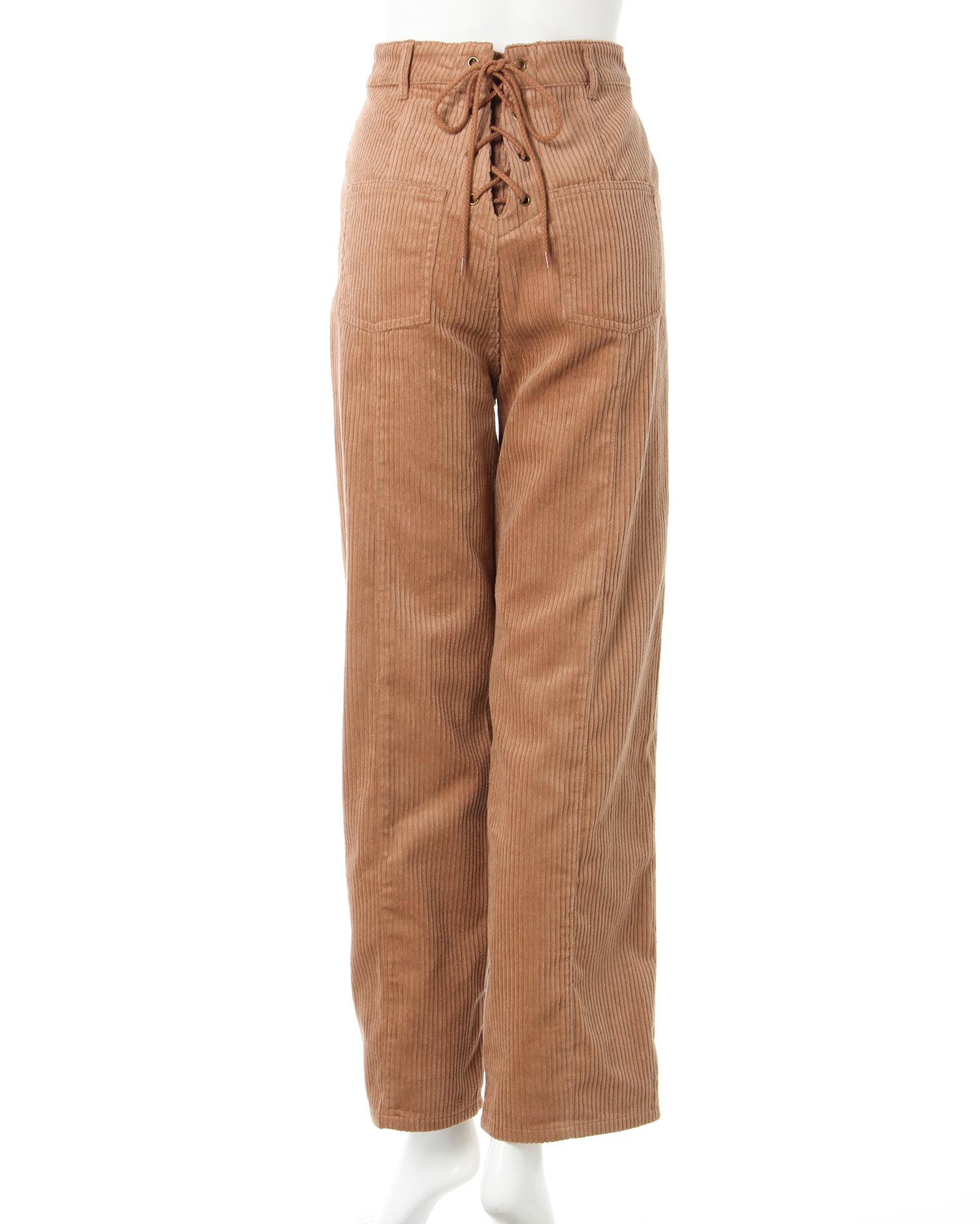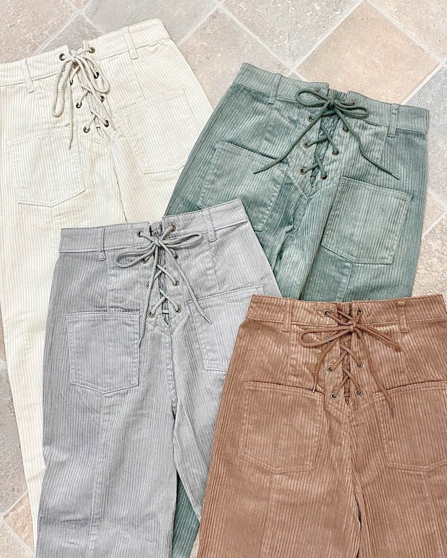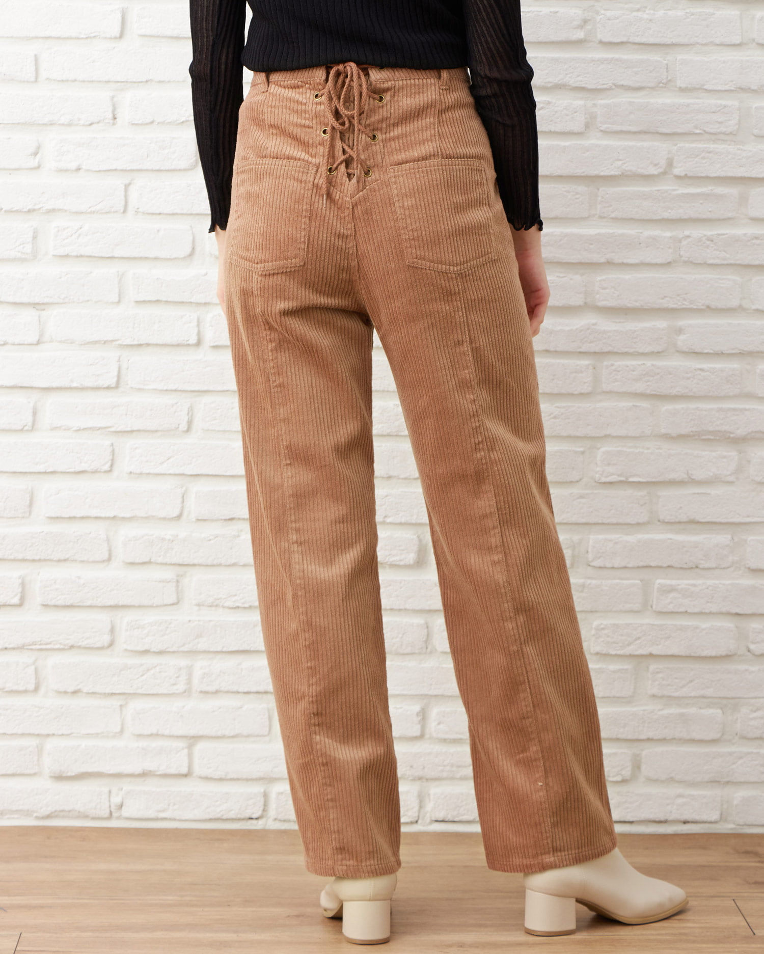 バックのレースアップデザインがアクセントになったストレートシルエットのパンツ。あたたかみのあるコーデュロイ素材で季節感のある着こなしが叶います。カジュアルな印象のアイテムもセンターシームでキレイめに。ベーシックで合わせやすいカラーはもちろん、トレンドのスモーキーカラーも揃っています。