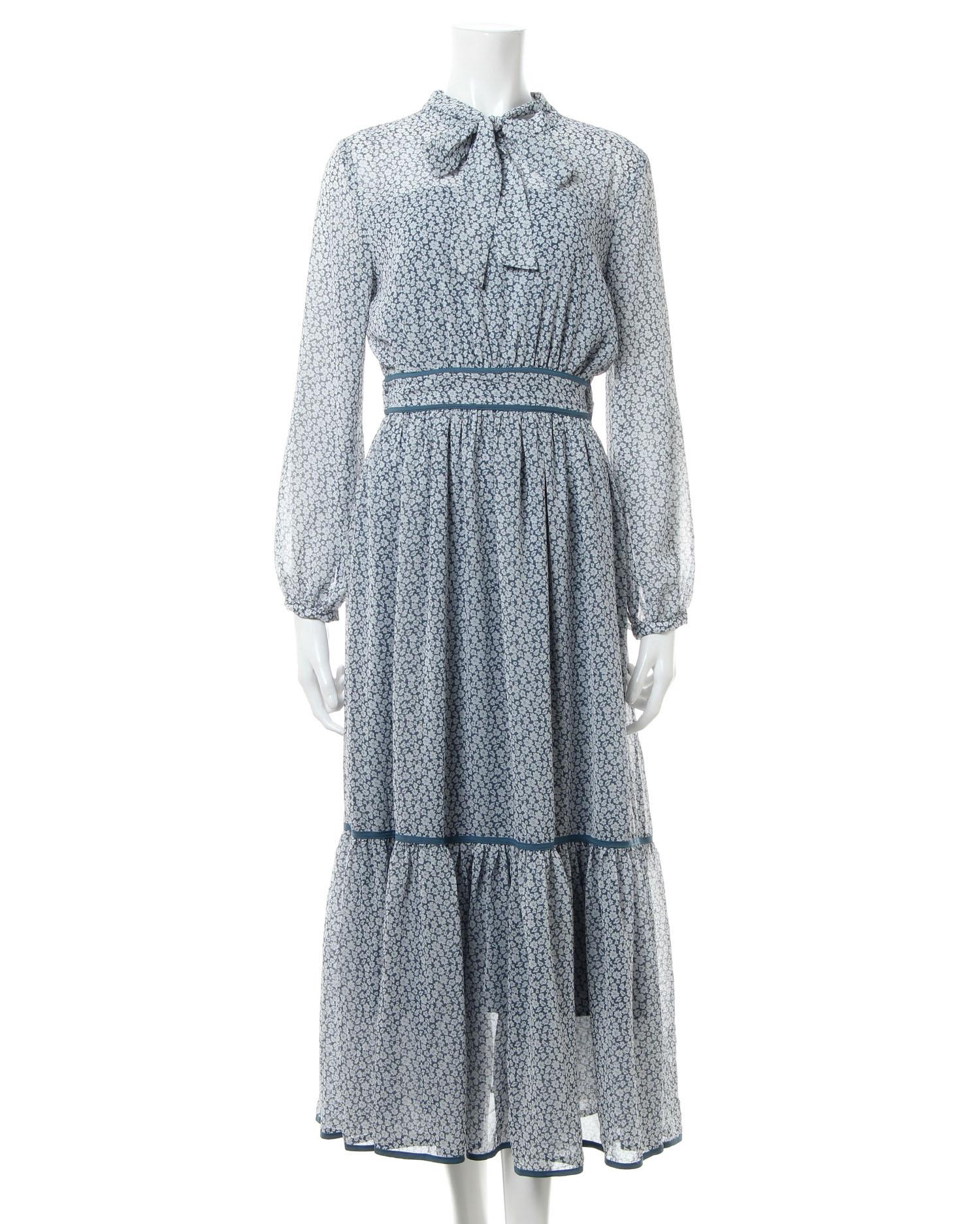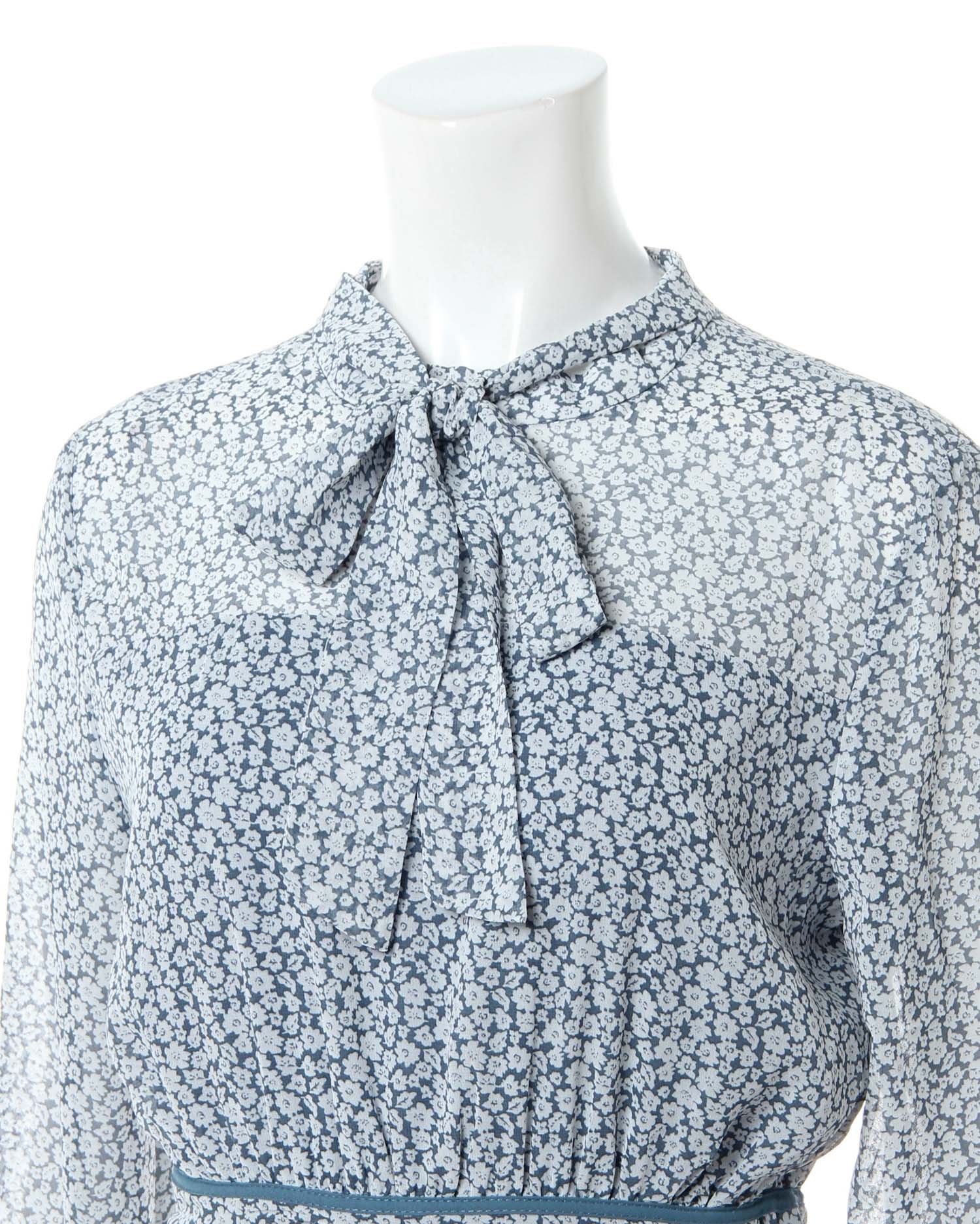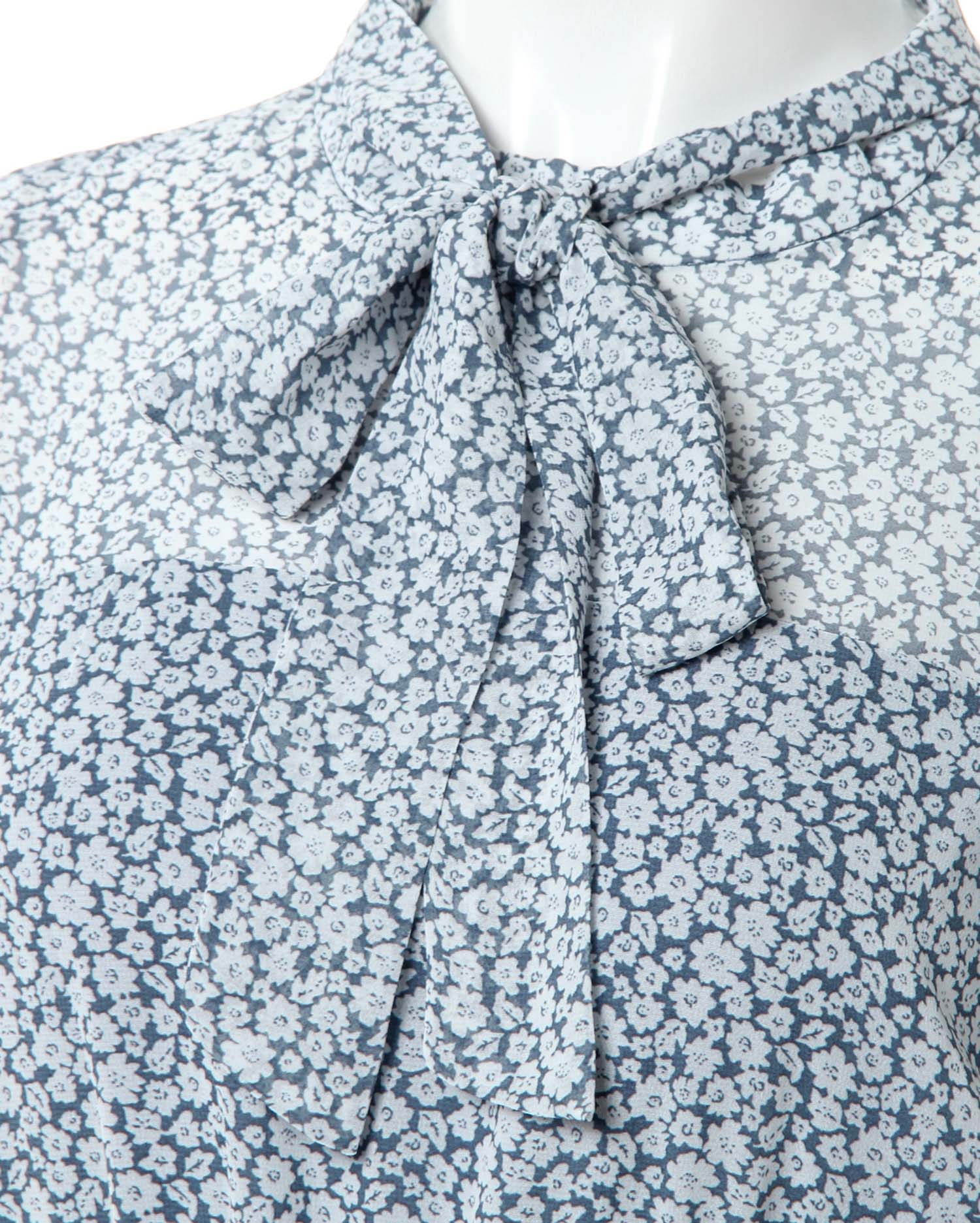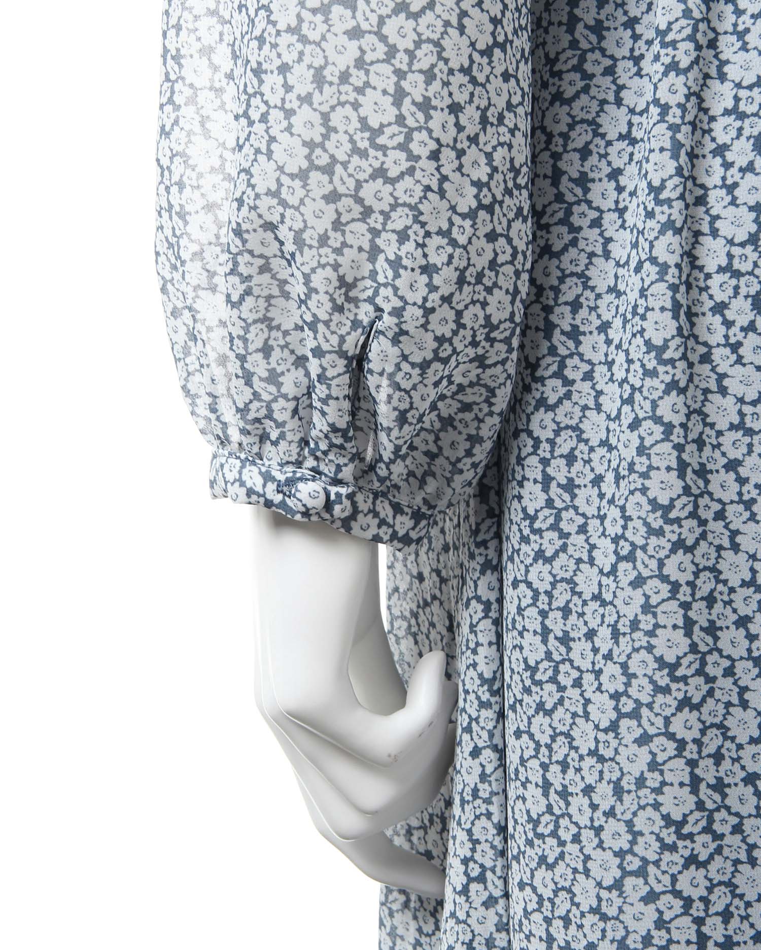 全体にあしらった小さなフラワープリントがクラシカルな雰囲気のロング丈ワンピース。きちんと感のあるボウタイデザインで大人レディな着こなしへと導きます。薄手のシアー素材もバスト下からスカート部分までの裏地付きで1枚でも安心。ウエストラインや裾にパイピングを入れることでアクセントにしています。バックファスナー付きで脱ぎ着も楽ちん。