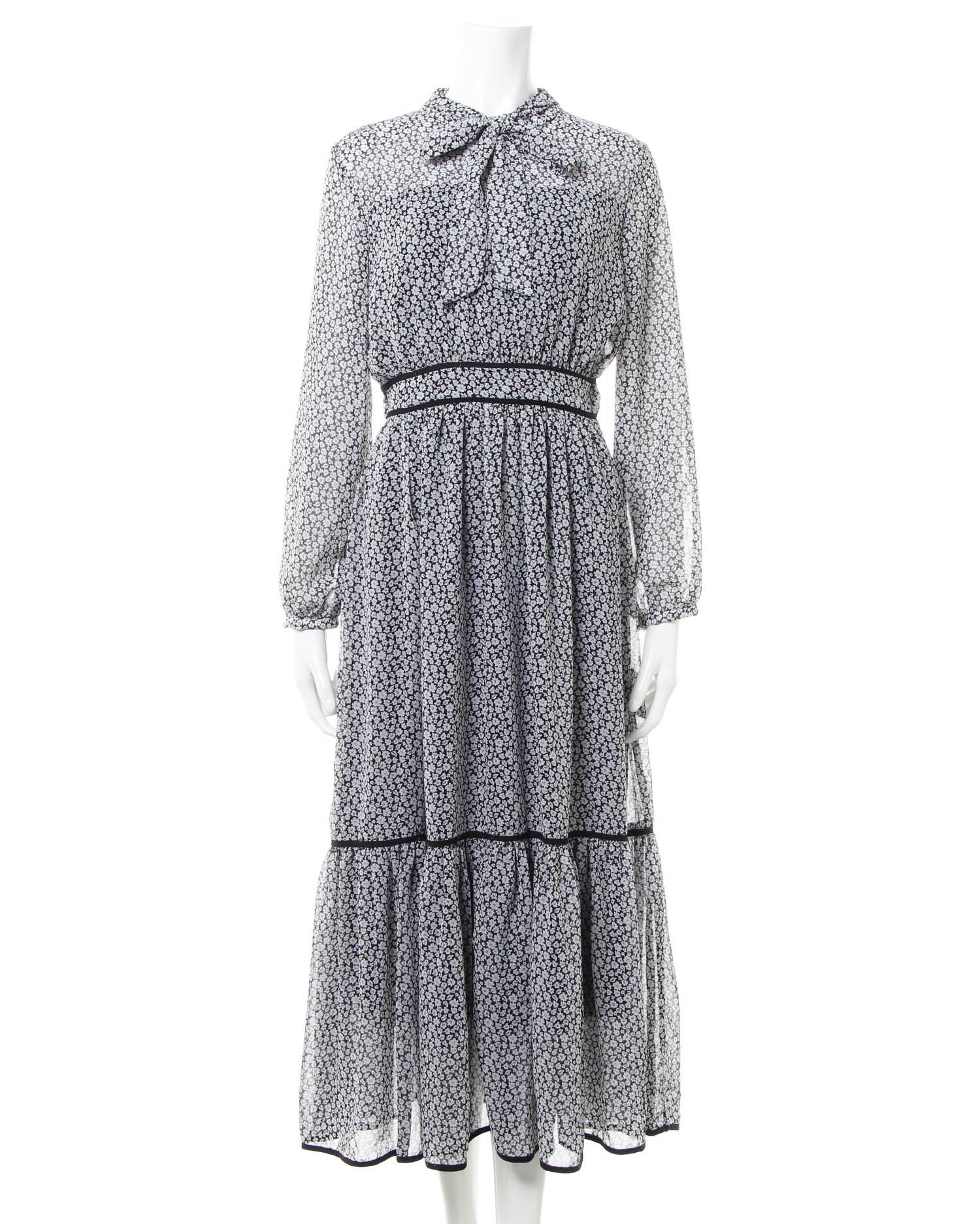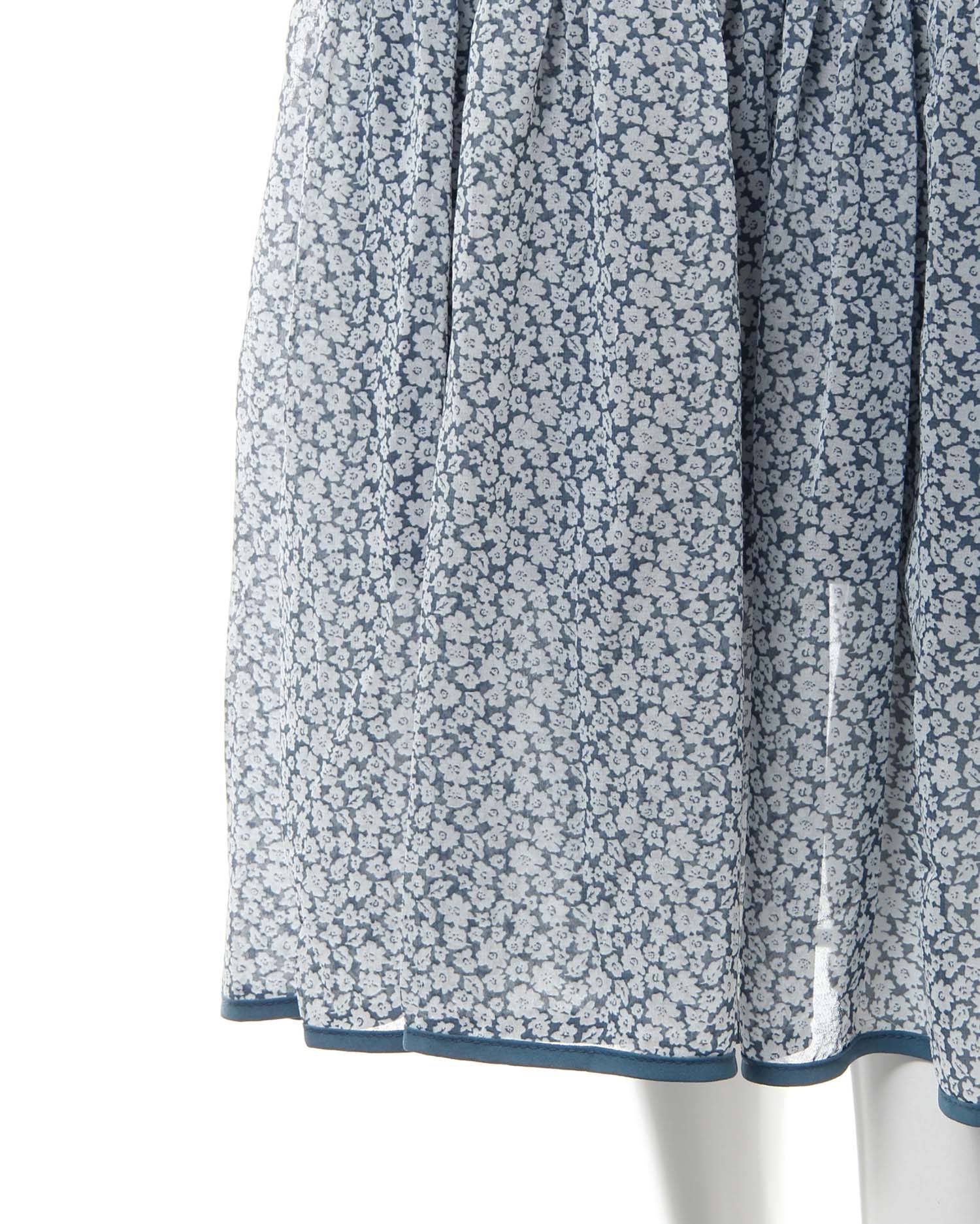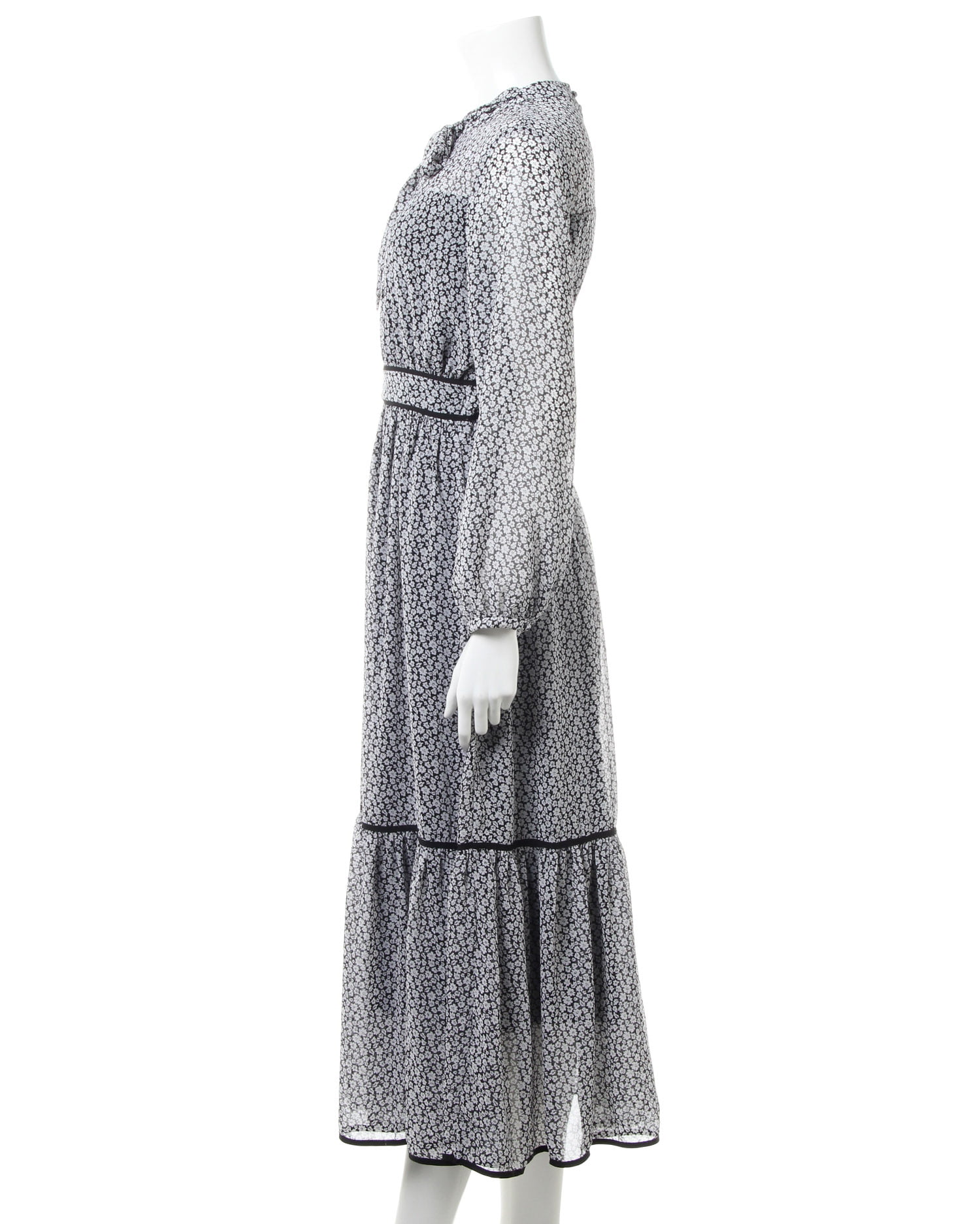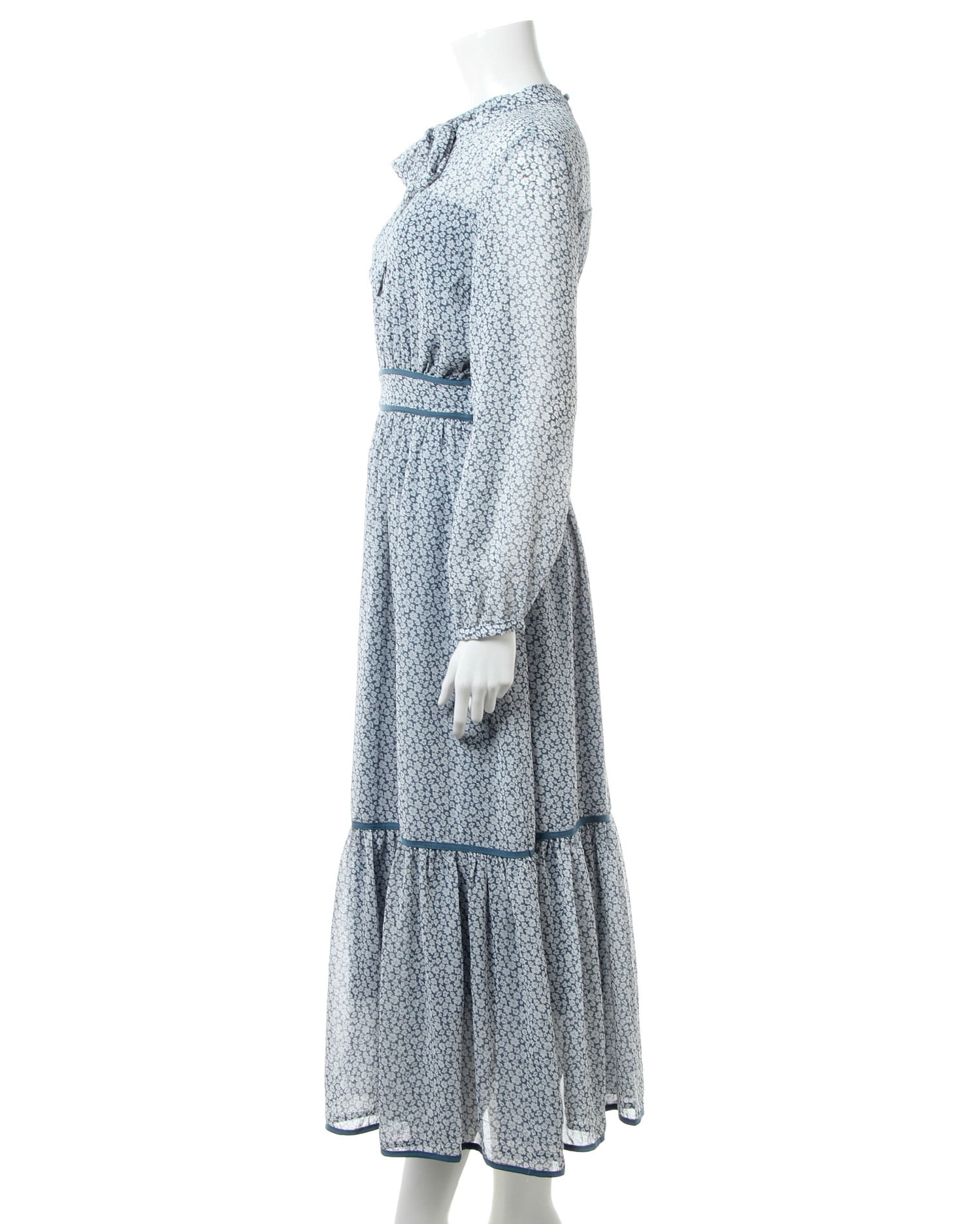 全体にあしらった小さなフラワープリントがクラシカルな雰囲気のロング丈ワンピース。きちんと感のあるボウタイデザインで大人レディな着こなしへと導きます。薄手のシアー素材もバスト下からスカート部分までの裏地付きで1枚でも安心。ウエストラインや裾にパイピングを入れることでアクセントにしています。バックファスナー付きで脱ぎ着も楽ちん。