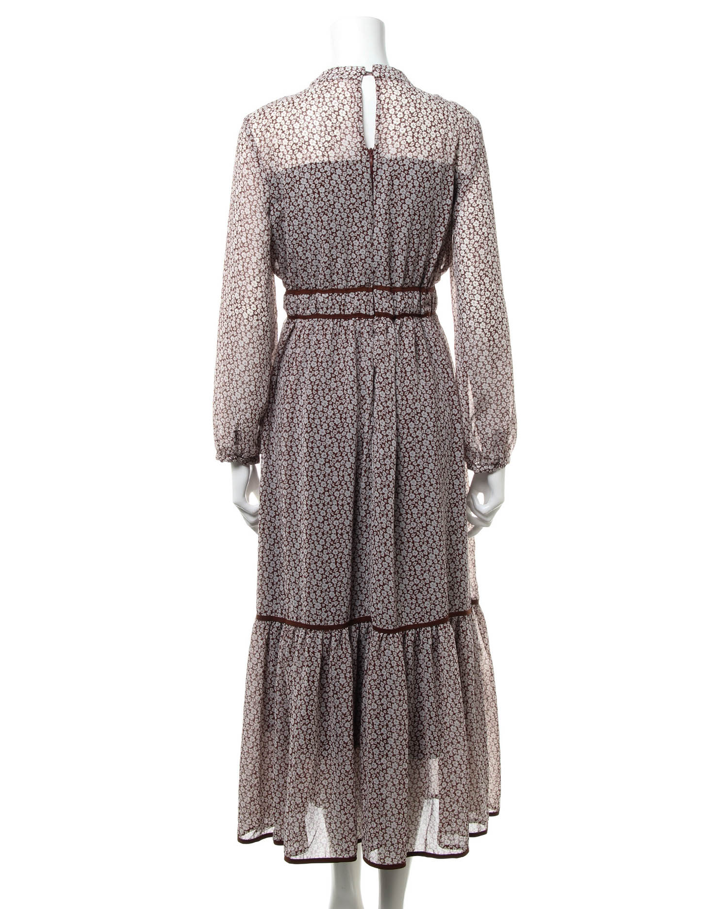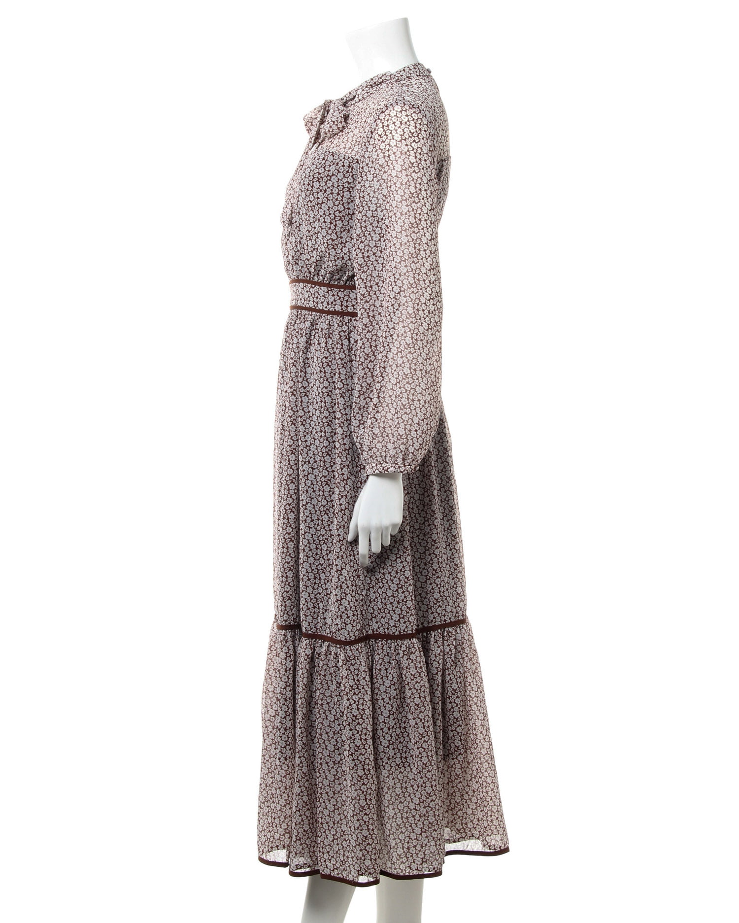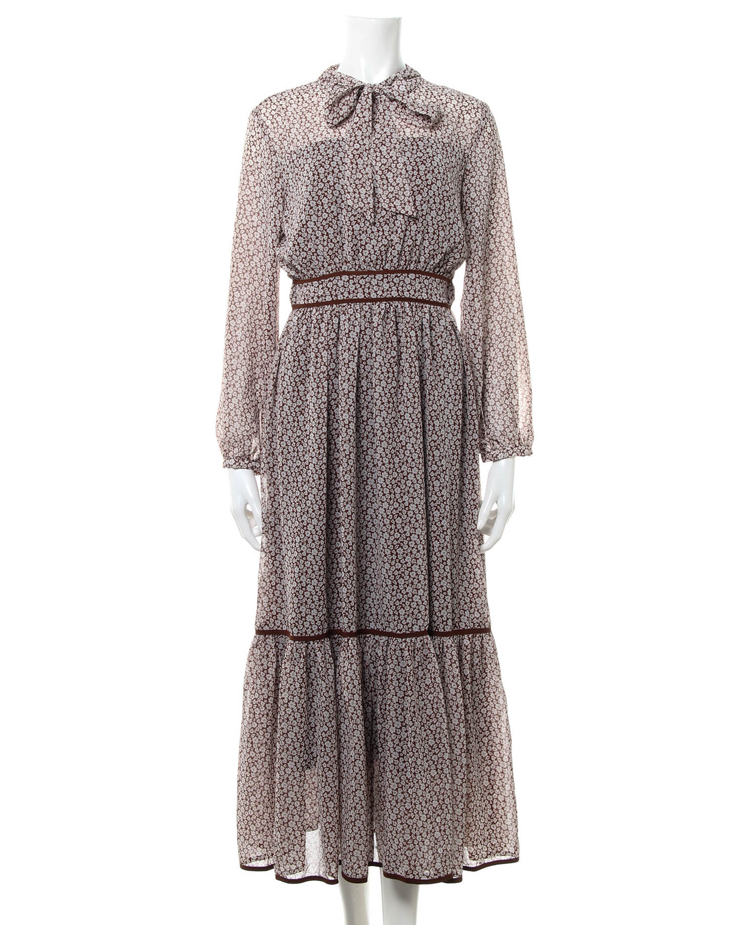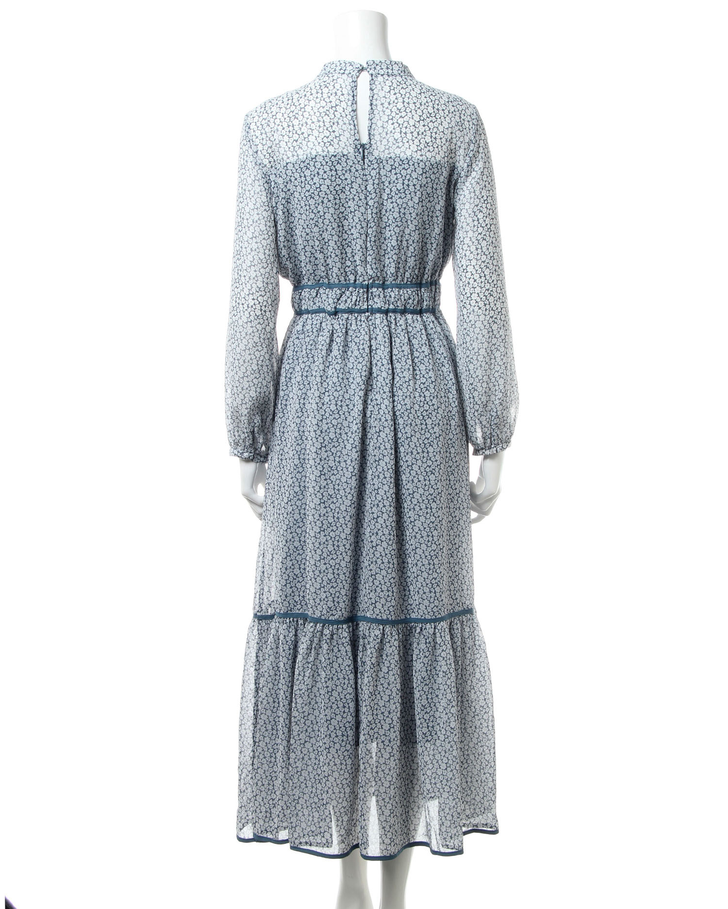 全体にあしらった小さなフラワープリントがクラシカルな雰囲気のロング丈ワンピース。きちんと感のあるボウタイデザインで大人レディな着こなしへと導きます。薄手のシアー素材もバスト下からスカート部分までの裏地付きで1枚でも安心。ウエストラインや裾にパイピングを入れることでアクセントにしています。バックファスナー付きで脱ぎ着も楽ちん。