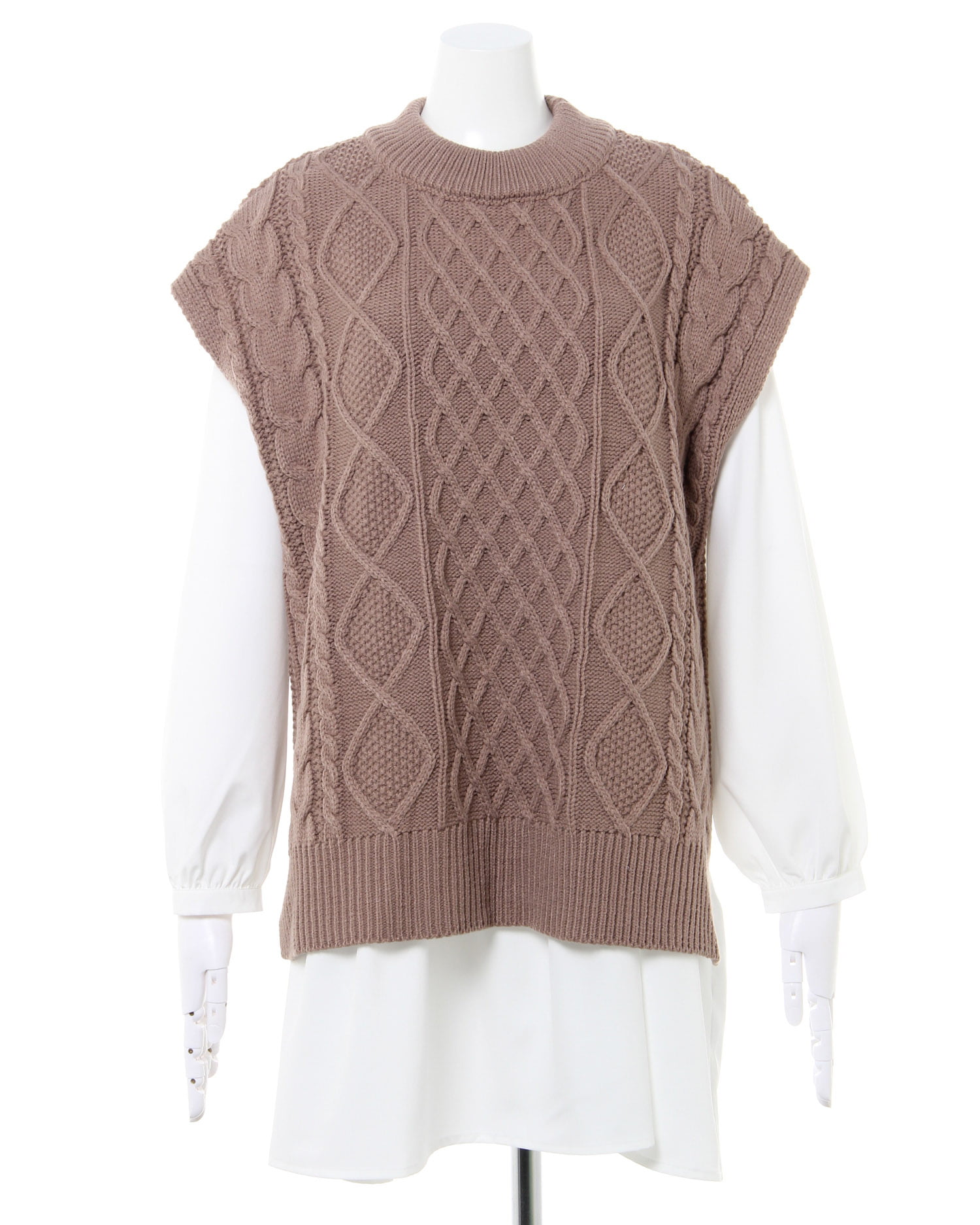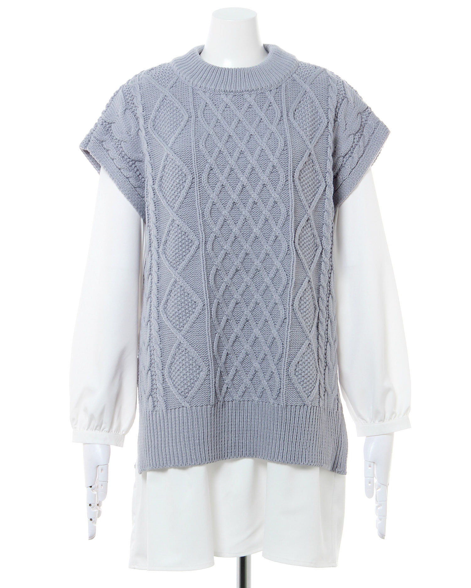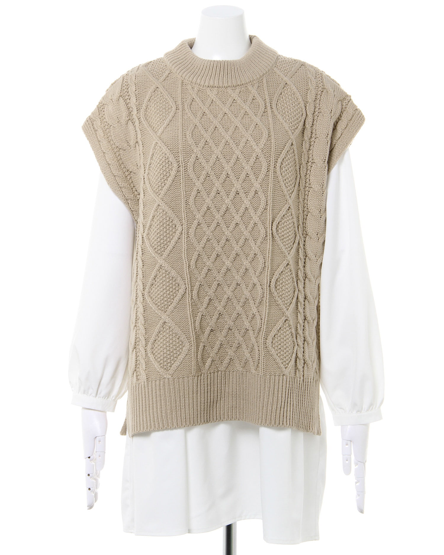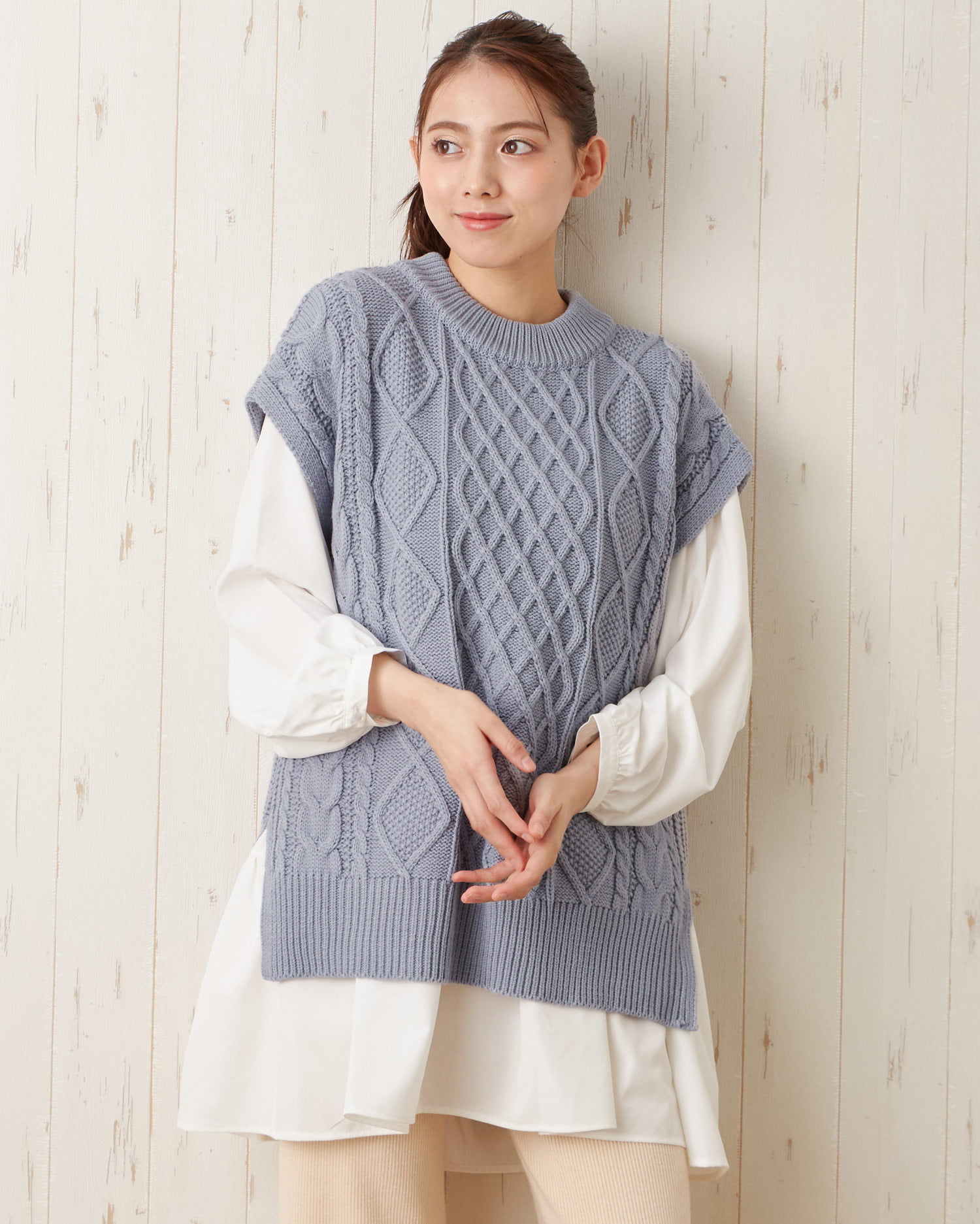 ナチュラルな雰囲気のケーブル編みのニットベストとレディなティアードブラウスのセットが登場。ゆったりとしたシルエットで快適な着心地になっています。広めのバックオープンデザイン&リボンがアクセントに。ヒップを覆うロング丈で体型カバーも狙えるブラウスとの組み合わせでトレンドライクなコーディネイトが完成します。