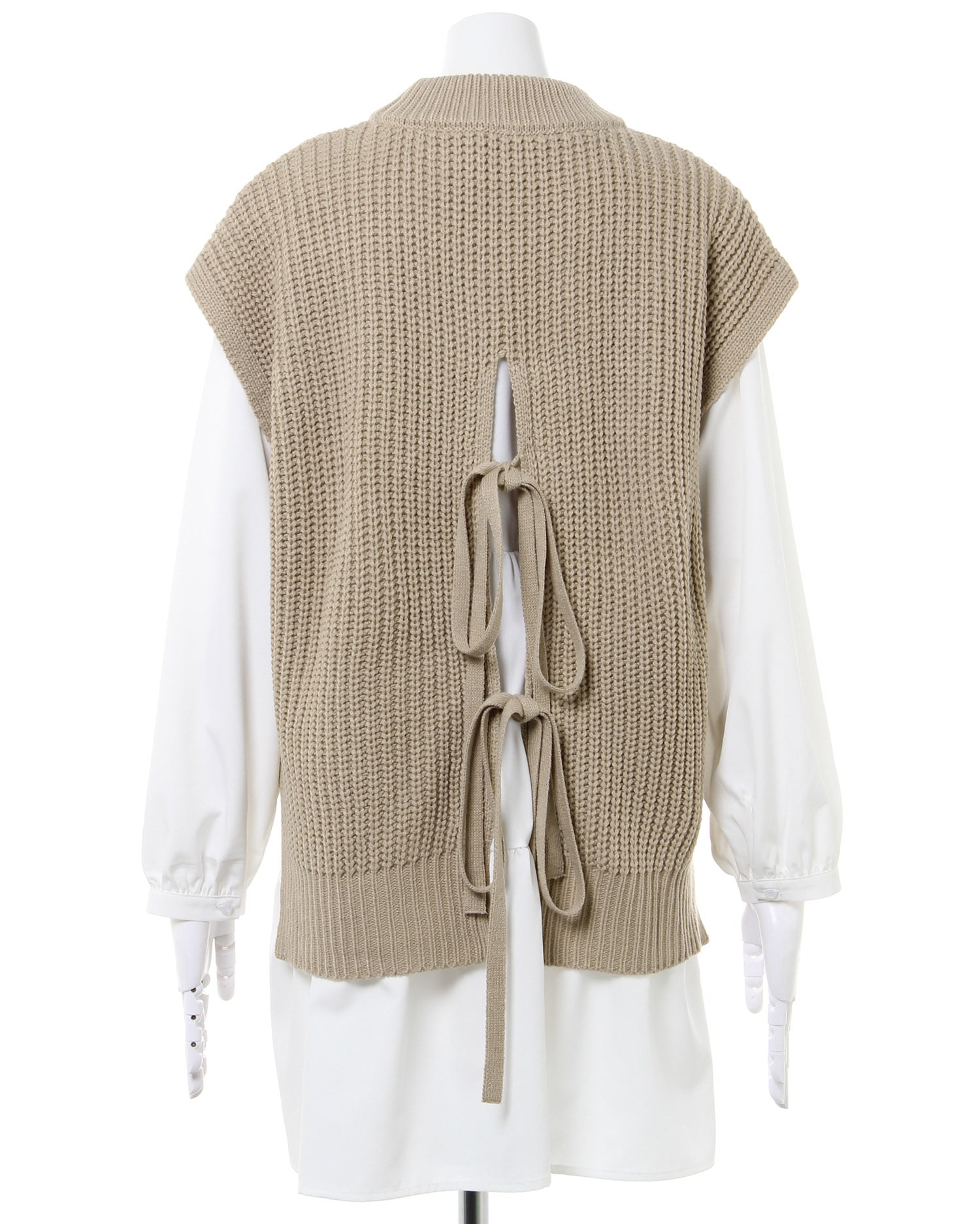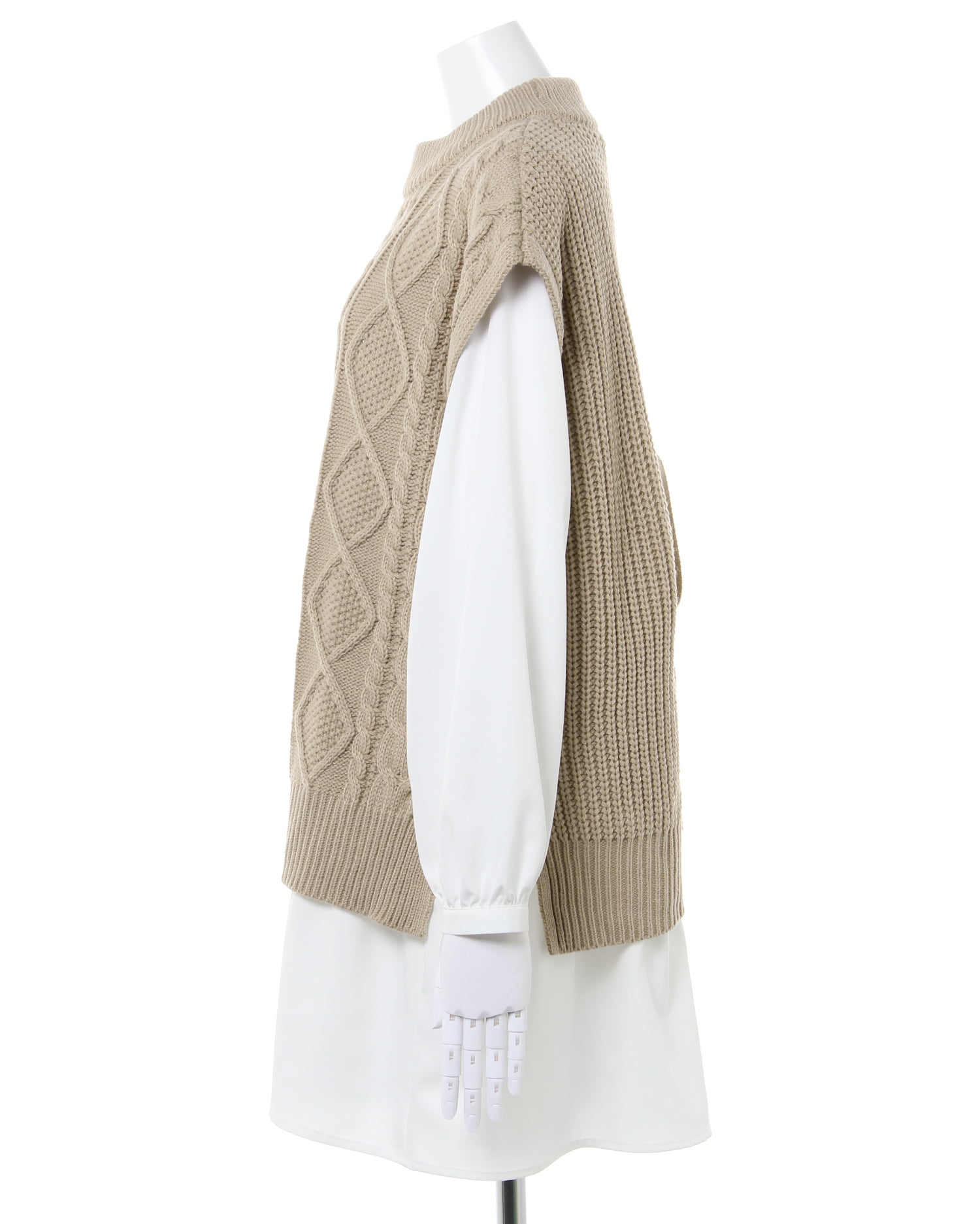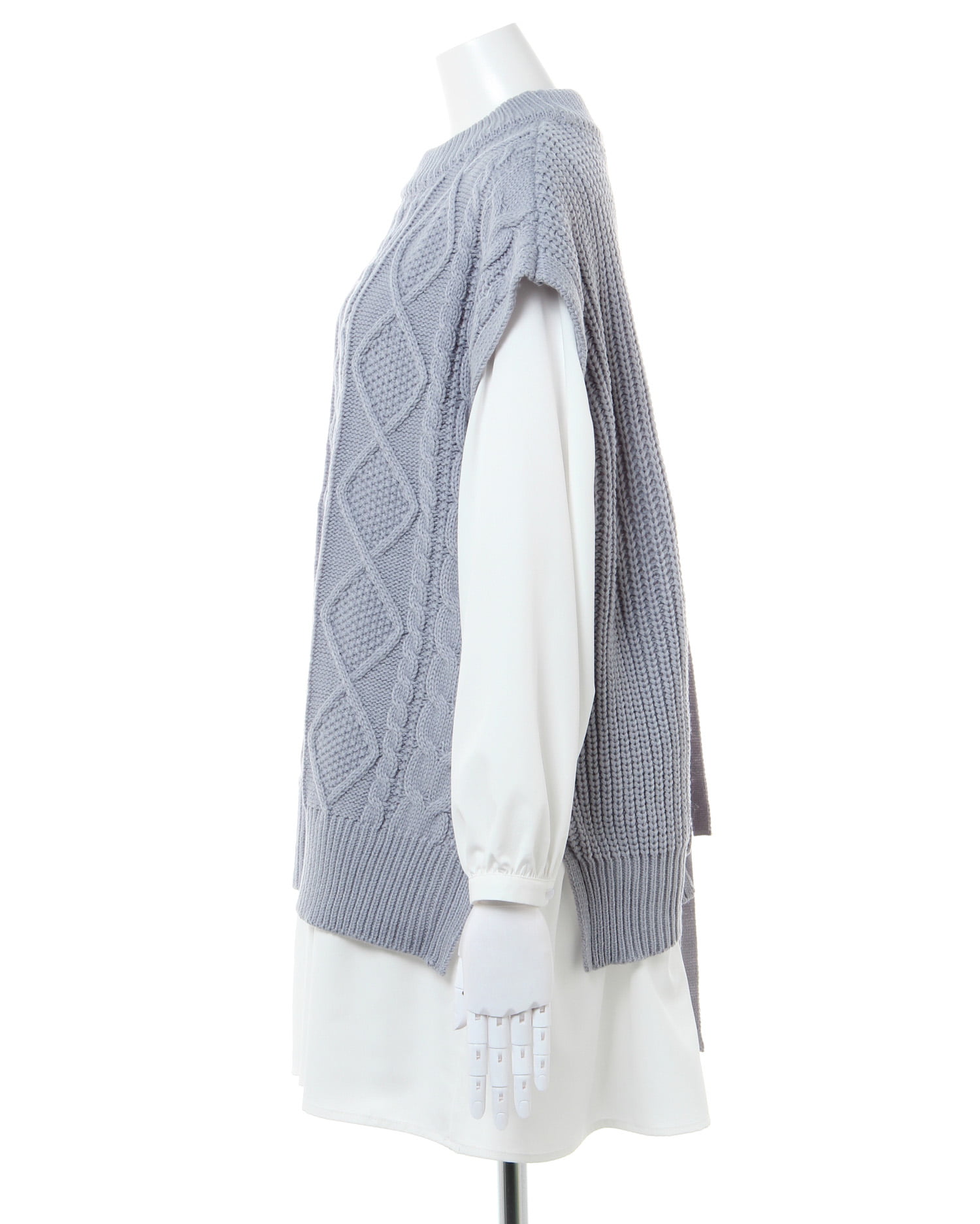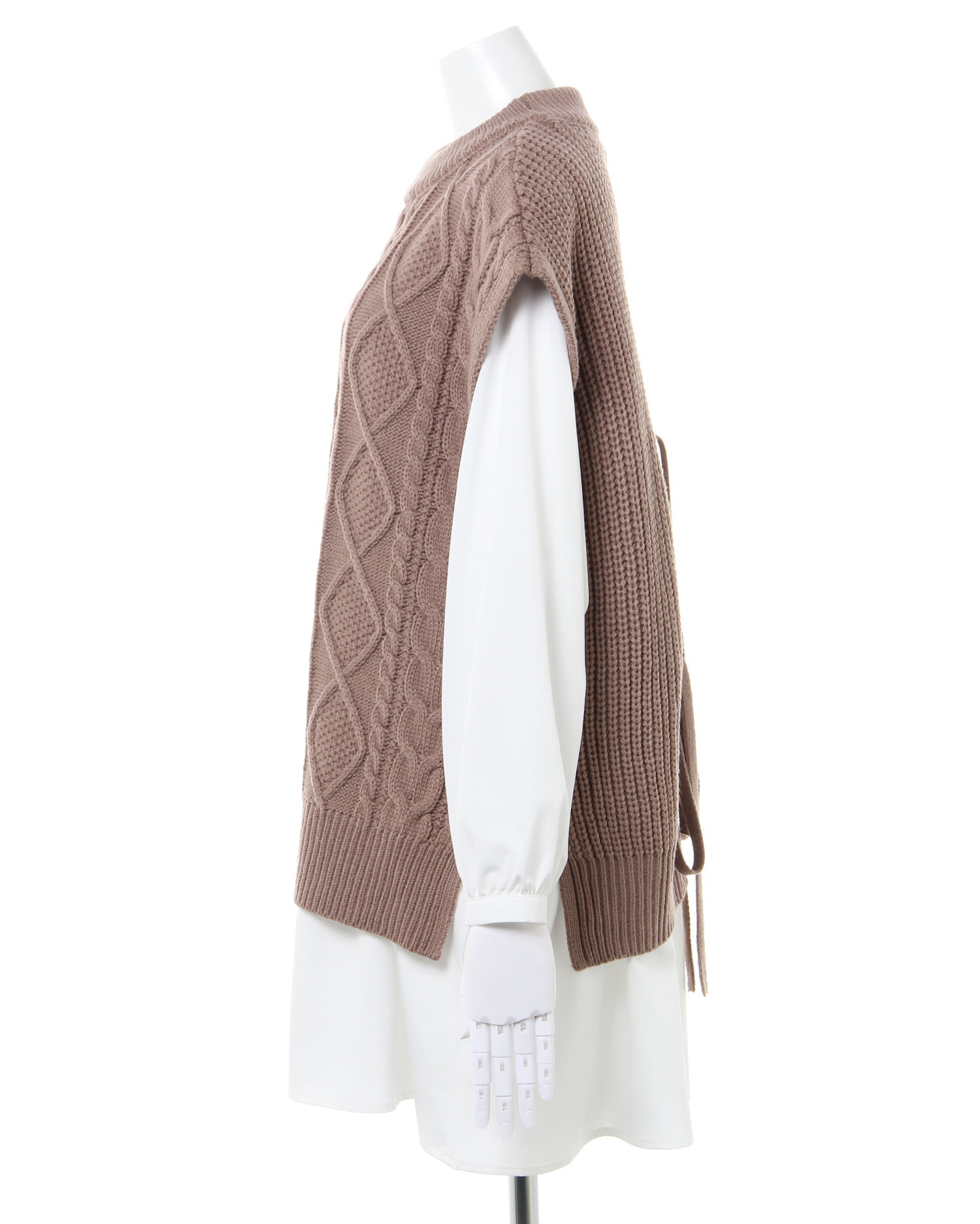 ナチュラルな雰囲気のケーブル編みのニットベストとレディなティアードブラウスのセットが登場。ゆったりとしたシルエットで快適な着心地になっています。広めのバックオープンデザイン&リボンがアクセントに。ヒップを覆うロング丈で体型カバーも狙えるブラウスとの組み合わせでトレンドライクなコーディネイトが完成します。