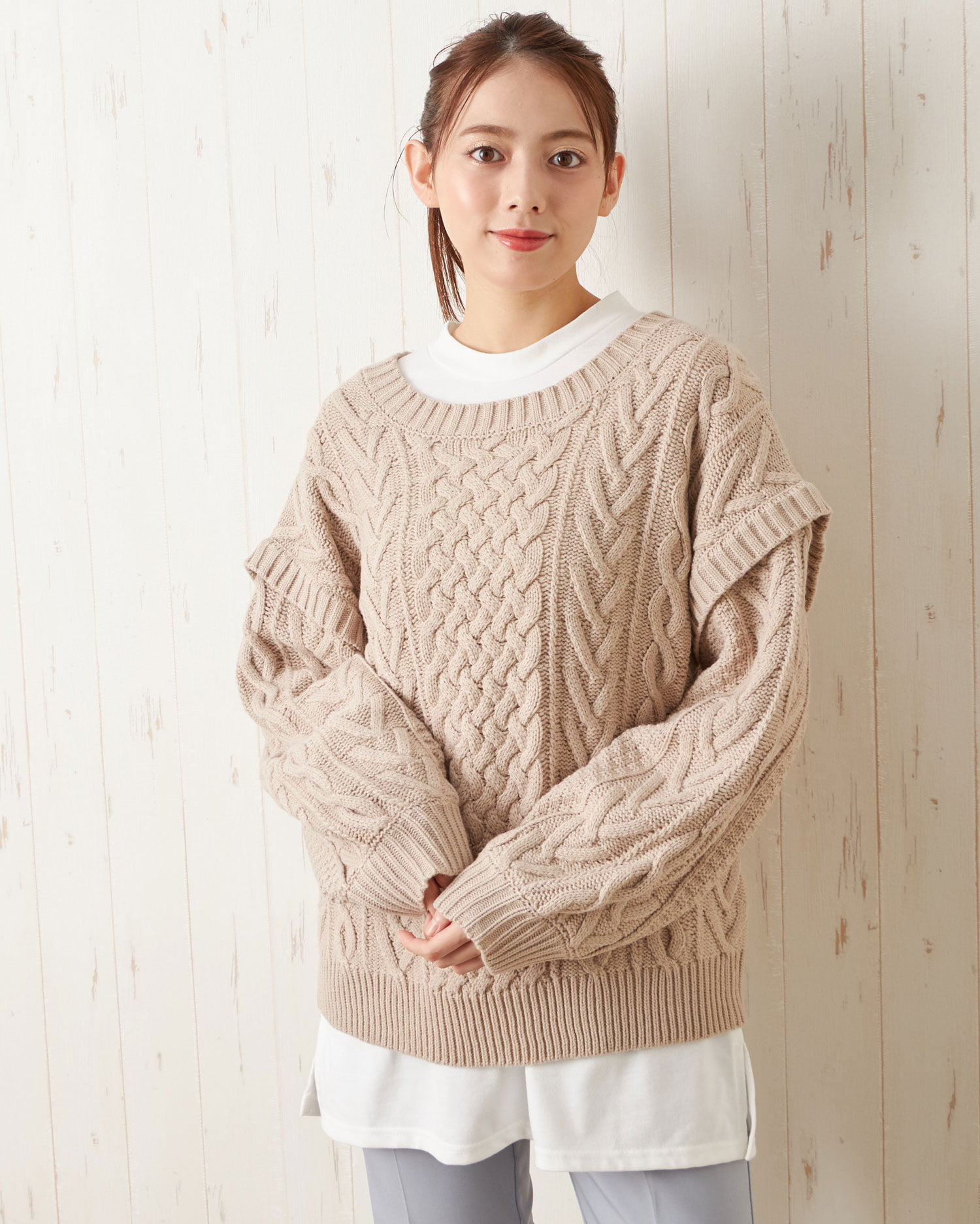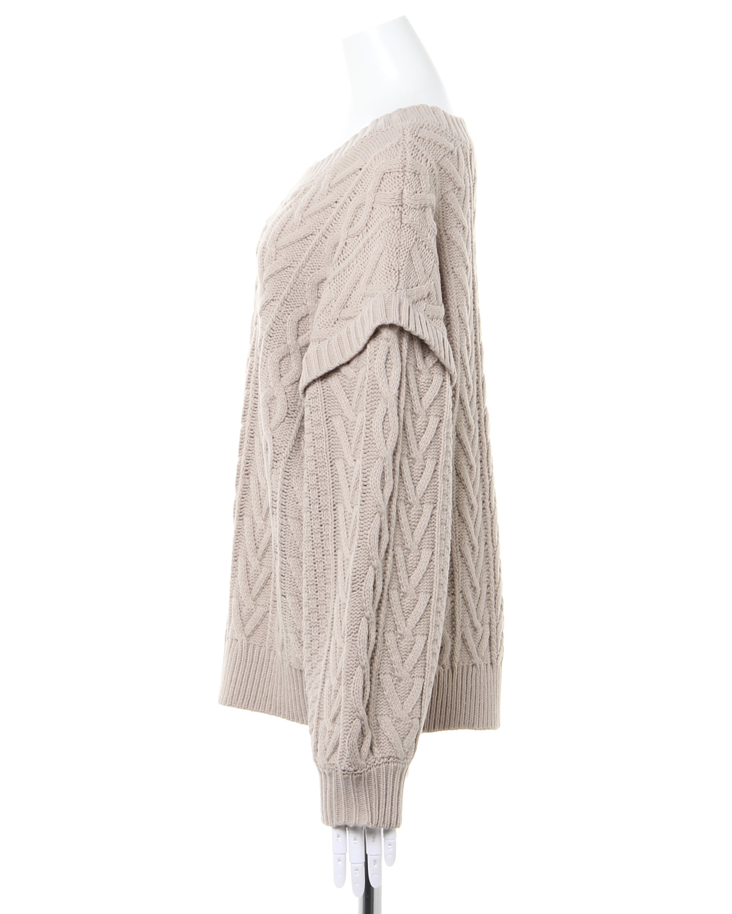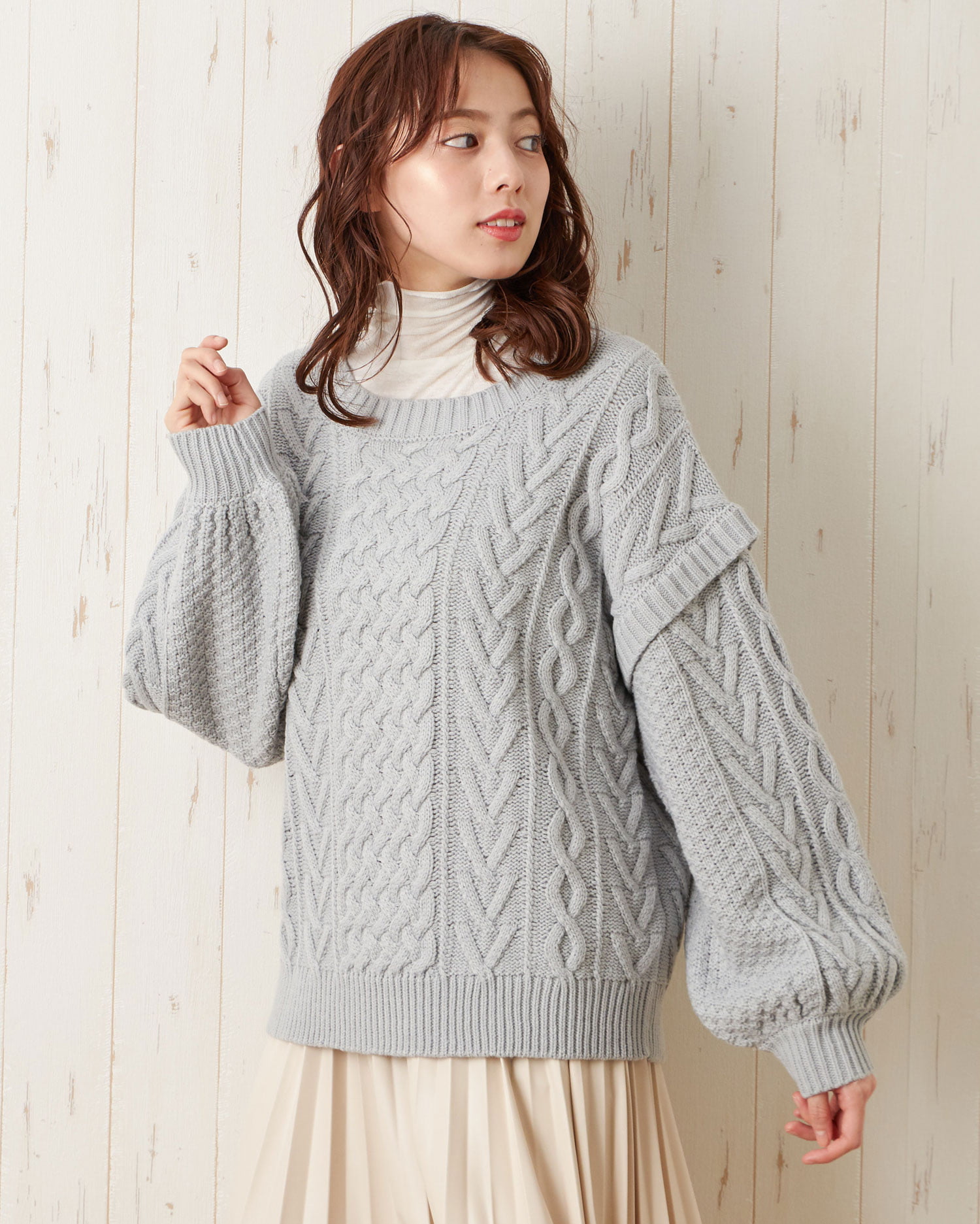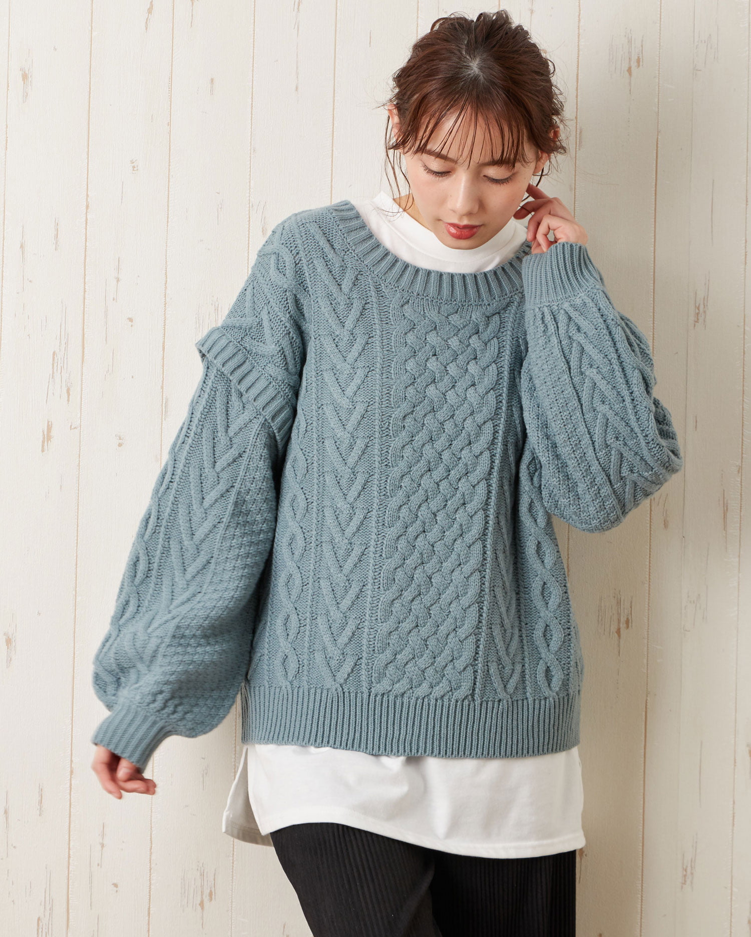 季節感たっぷりのほっこりスタイルが完成するケーブル編みのニットトップス。トレンドのゆったりとした身頃で快適な着心地になっています。ボディラインを拾わず、スタイルカバーを狙えるのも◎。すっきりと開いたネックラインでインナーと合わせた着こなしも楽しめます。袖部分に切り替えを入れたデザインがスタイリッシュ。