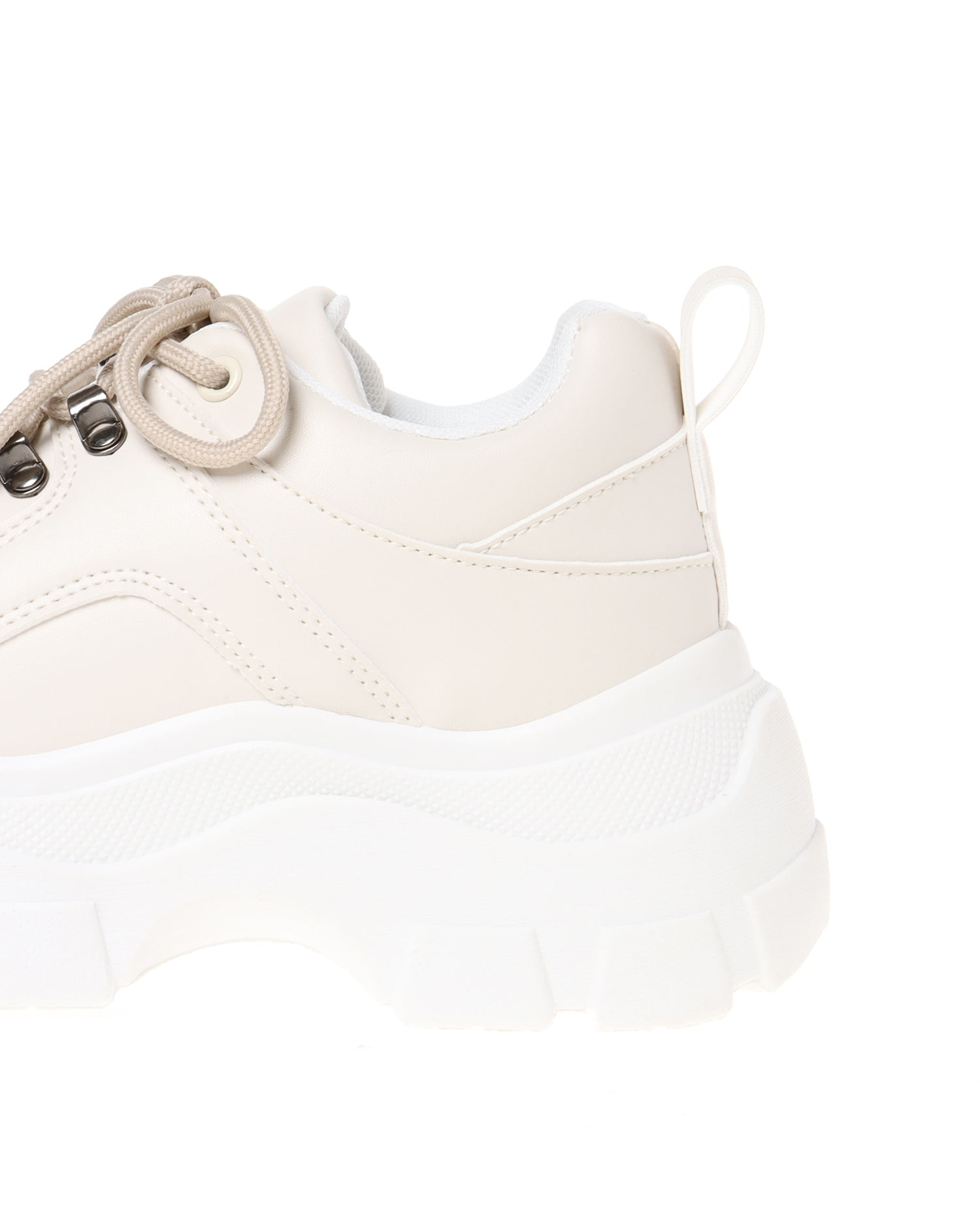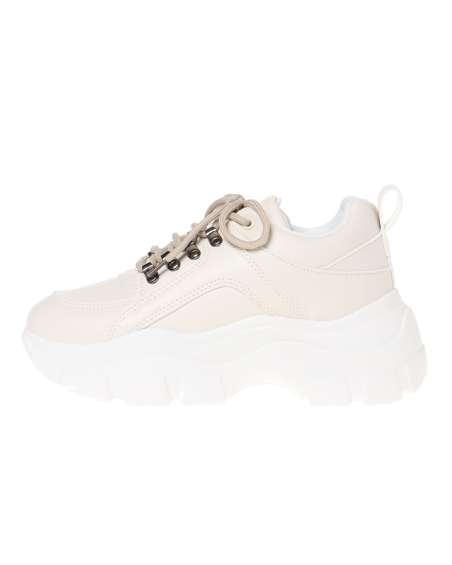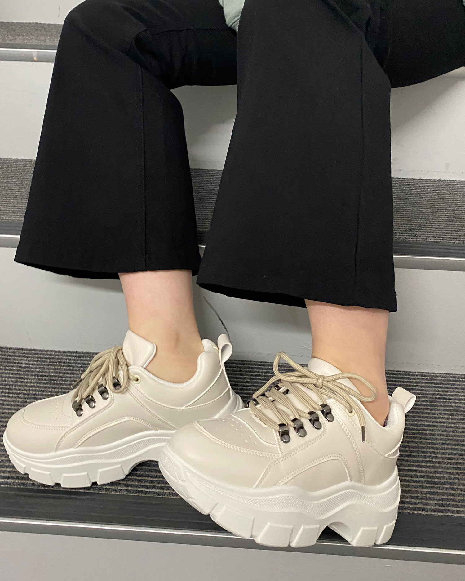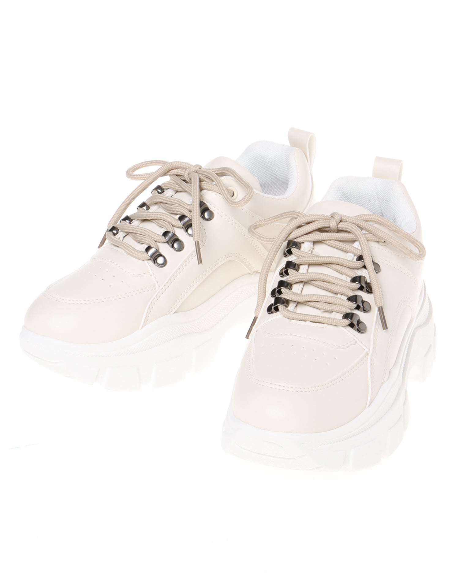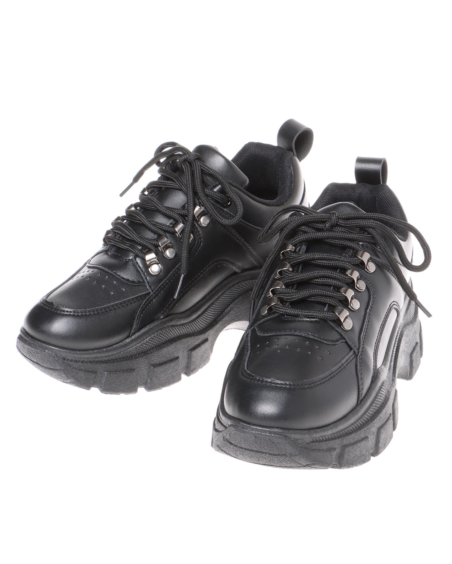 トレンドのダッドスニーカーでアクティブガールに。シンプルなワンカラーにメタリックなシューレース金具がアクセントになっています。厚みのあるボリュームソールで脚長効果も抜群。かかと部分にはクッションが入っているので歩きやすく、快適な履き心地になっています。どんなスタイルにも合わせやすいベーシックなカラーがラインナップ。
