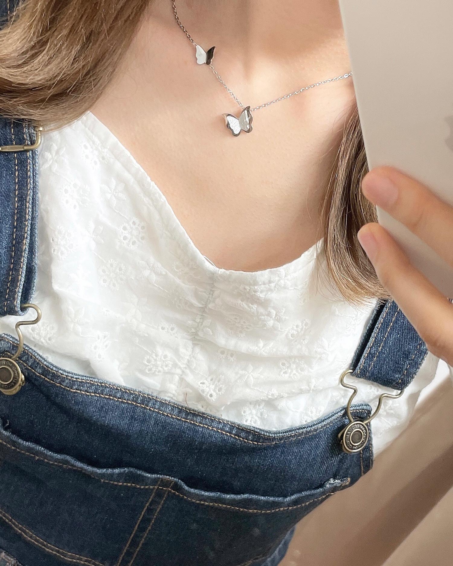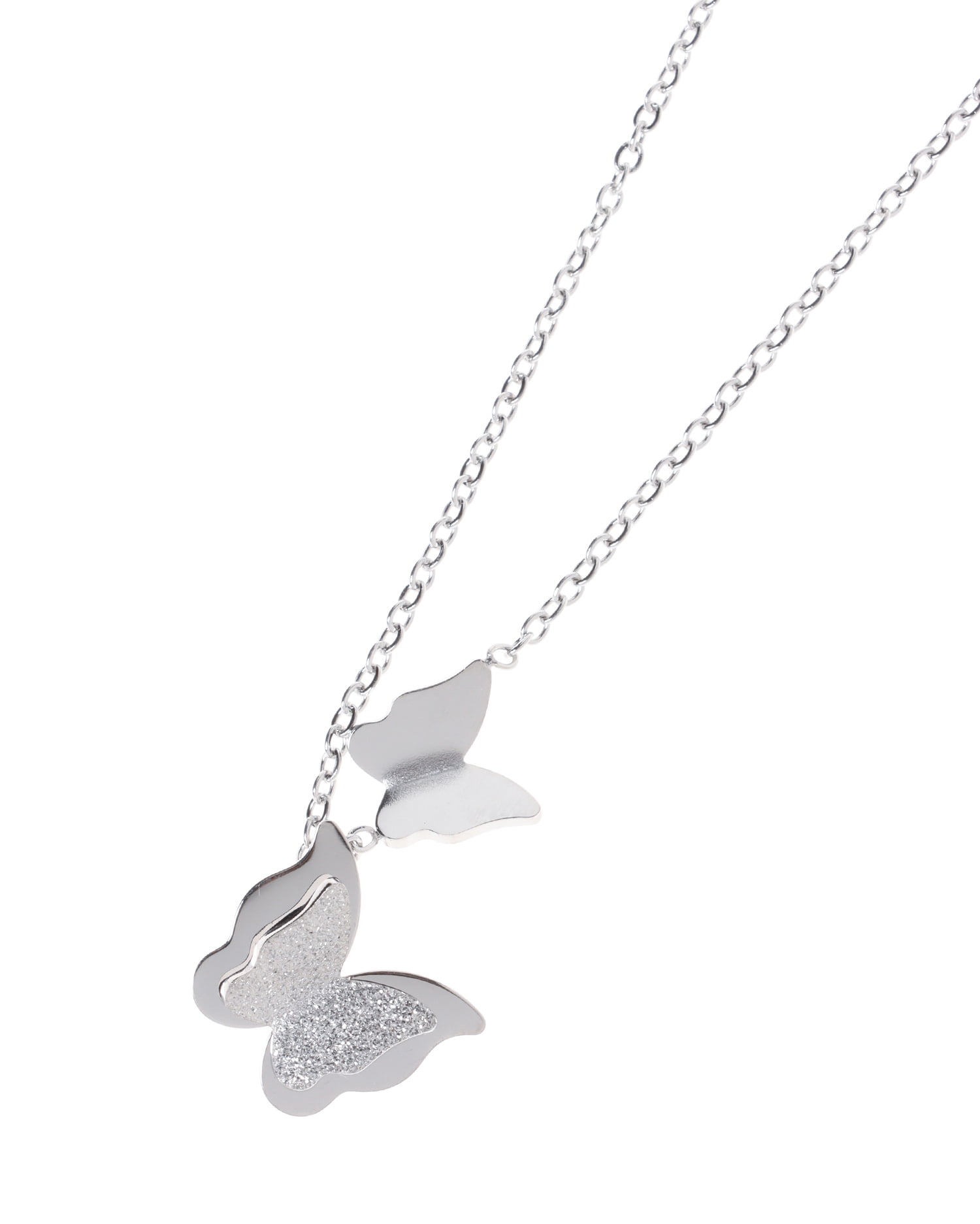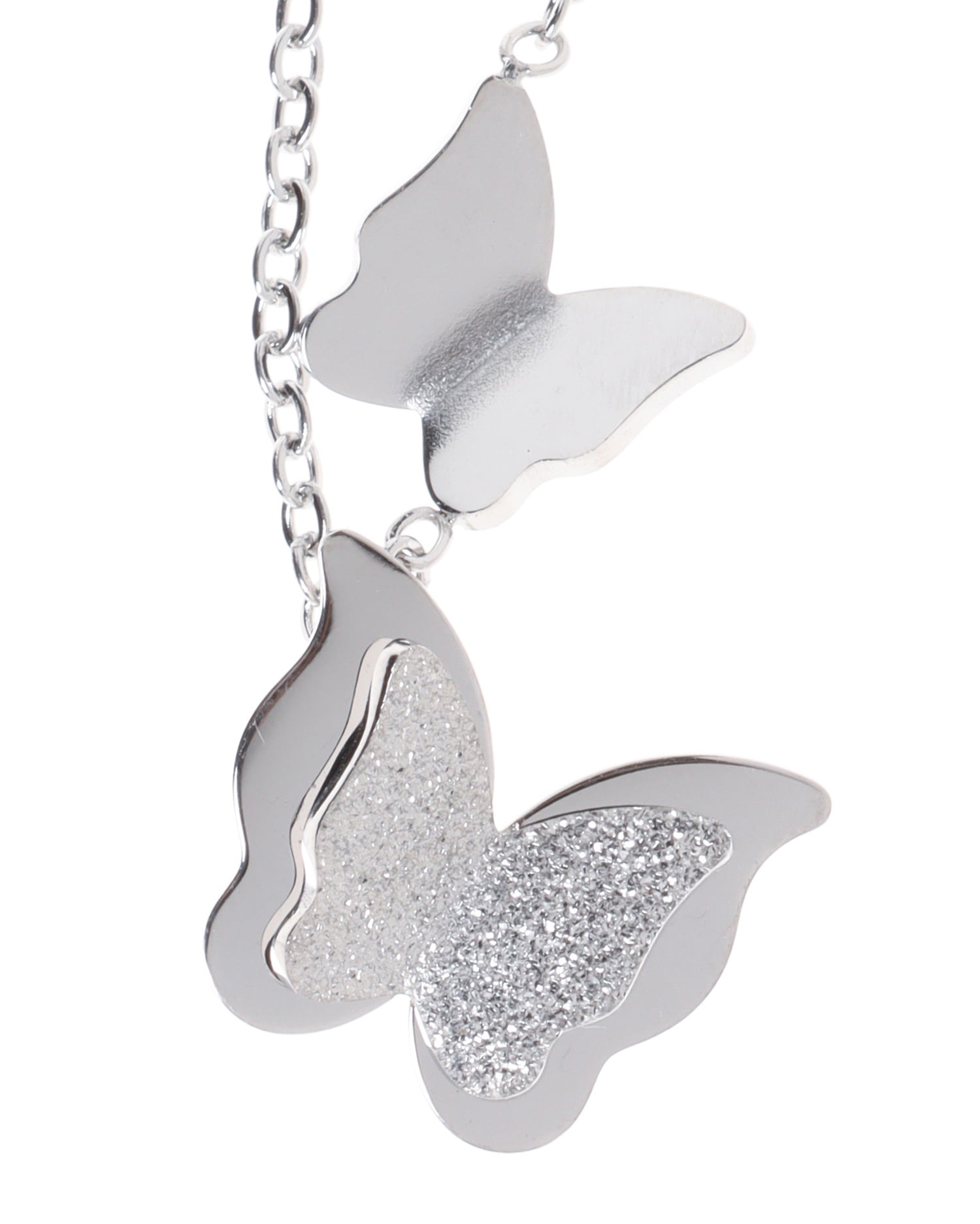 大きさの異なる2匹の蝶がコーディネイトのアクセントに。小振りなデザインでどんなスタイルにも合わせやすいネックレスです。細めのチェーンが華奢見えを叶えてくれるのも◎。ラメを散りばめた立体的デザインもポイントです。どんなスタイルにも合わせやすいのでデイリーに活躍。シンプルなTシャツなどにさらりと合わせた大人コーデもおすすめです。