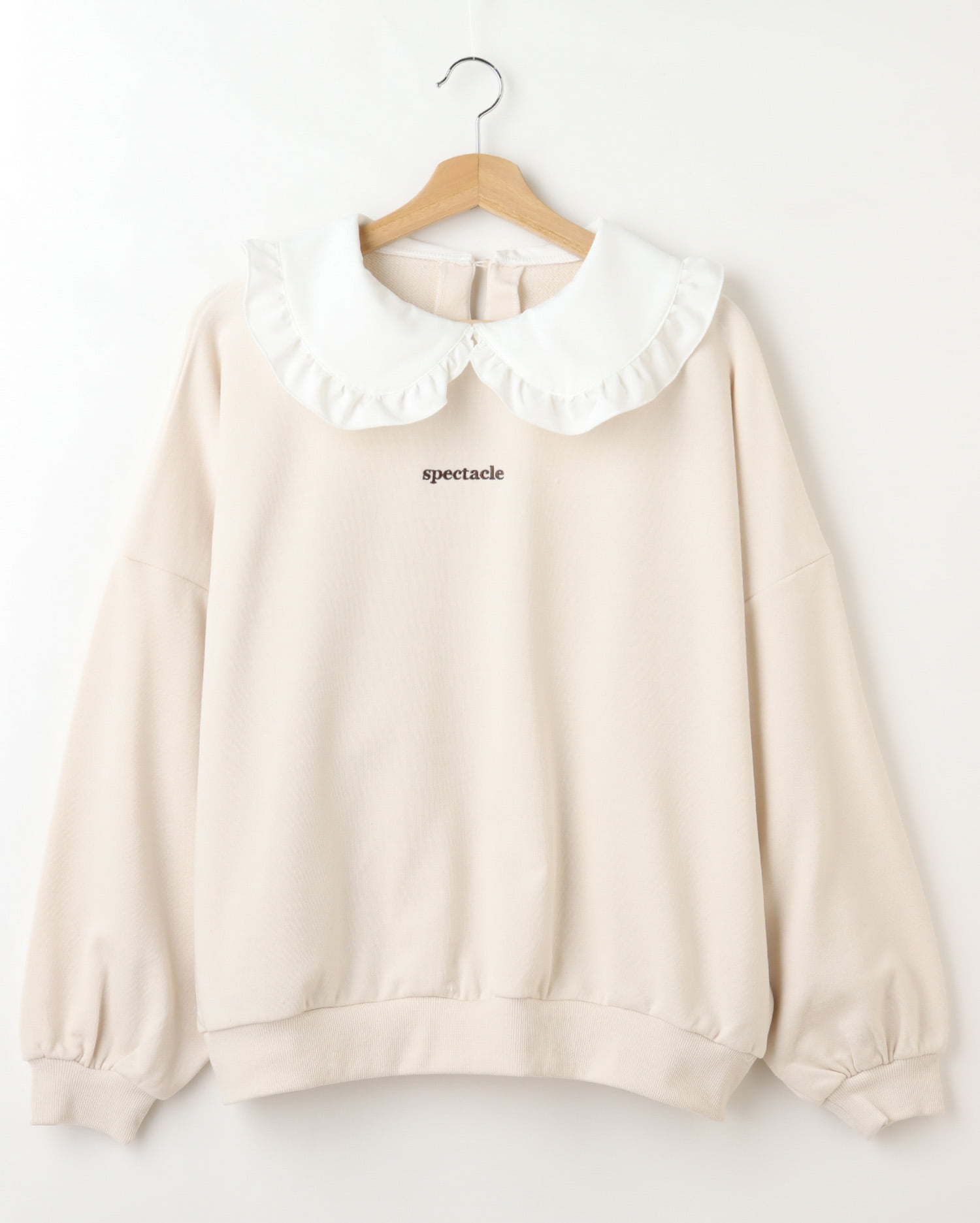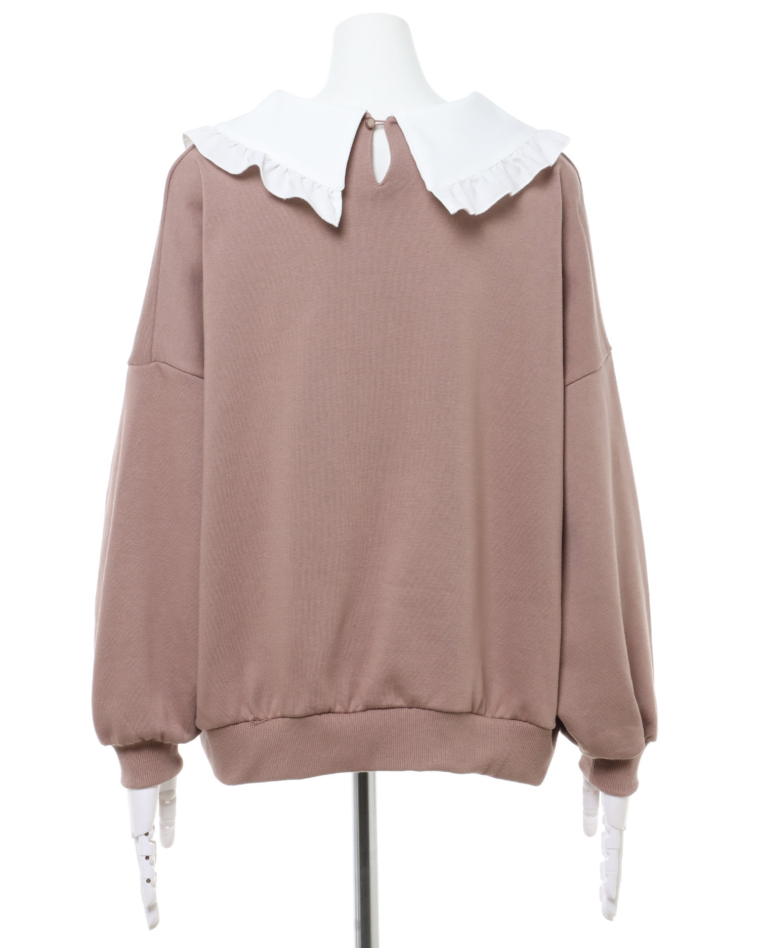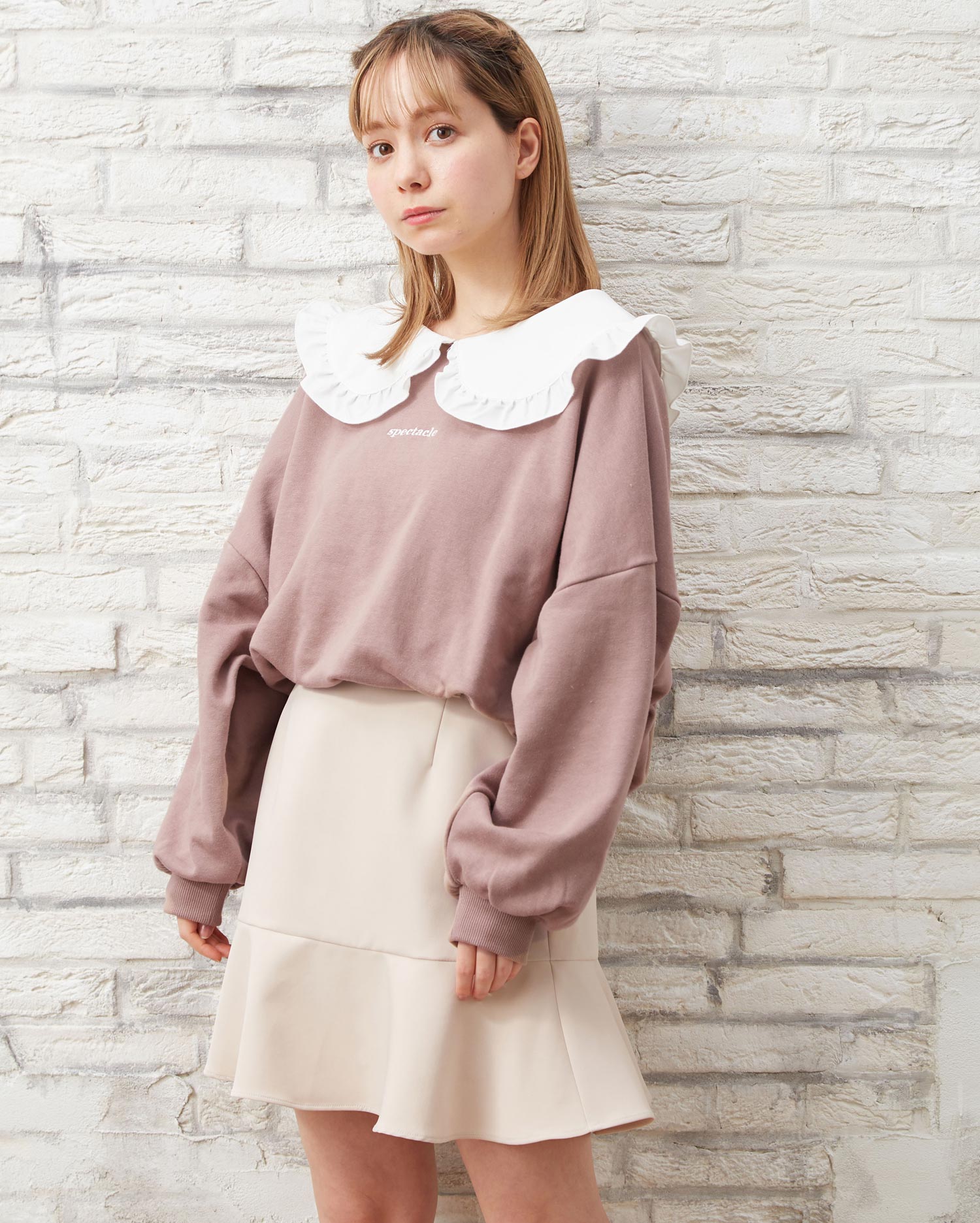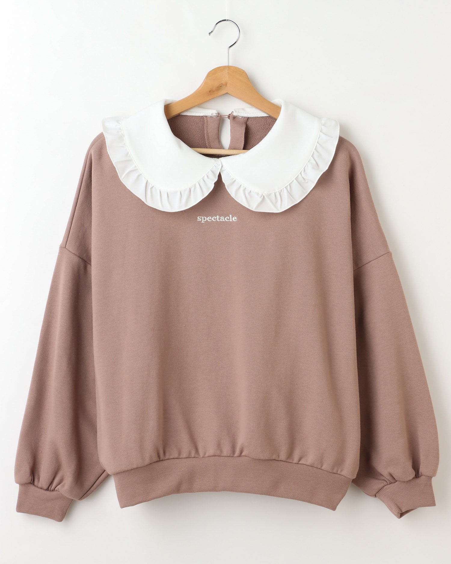 ガーリーなフリル襟付きのスウェットトップス。ブラウスをレイヤードしたかのようなデザインが新鮮なアイテムです。ゆったりとした身頃で着心地も快適。トレンドのニュアンスカラーに胸元の刺繍がアクセントになっています。バックのドロップカットもポイント。ショート丈のボトムスで元気に着こなすのもおすすめです。