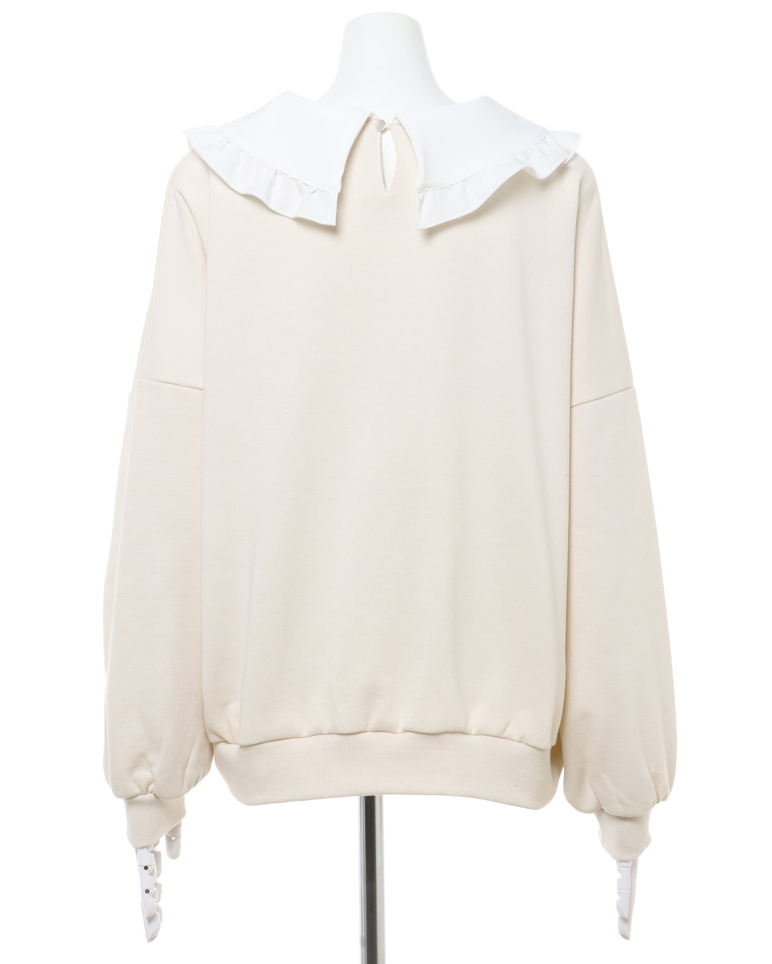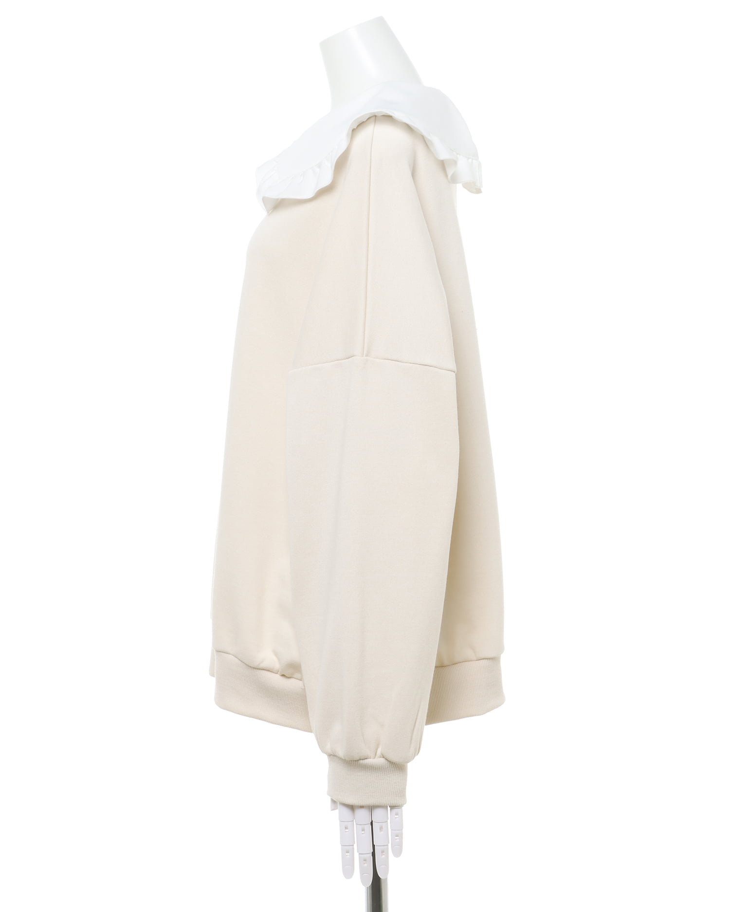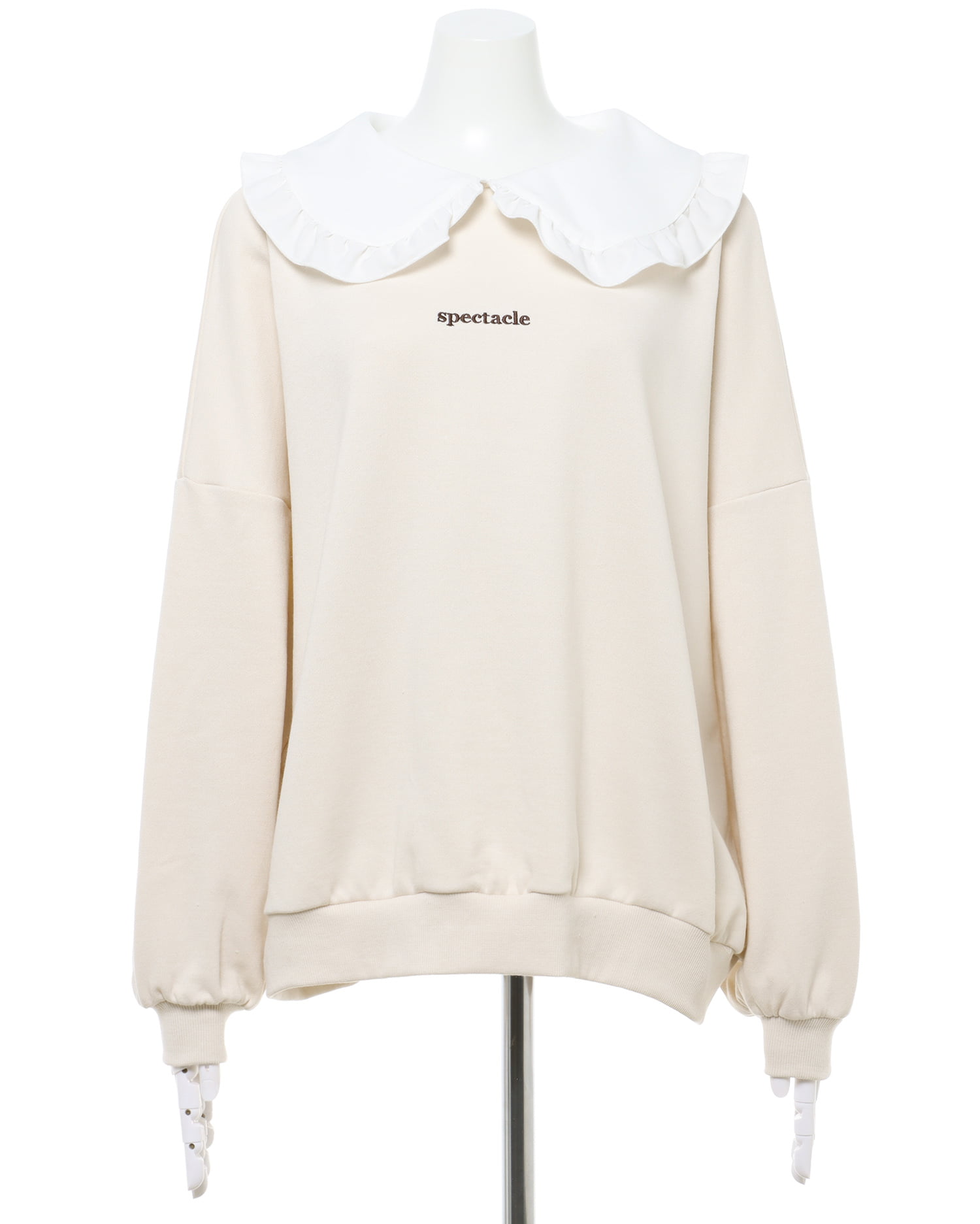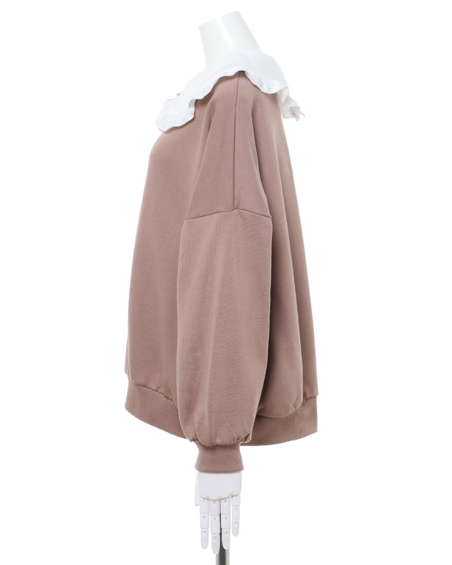 ガーリーなフリル襟付きのスウェットトップス。ブラウスをレイヤードしたかのようなデザインが新鮮なアイテムです。ゆったりとした身頃で着心地も快適。トレンドのニュアンスカラーに胸元の刺繍がアクセントになっています。バックのドロップカットもポイント。ショート丈のボトムスで元気に着こなすのもおすすめです。