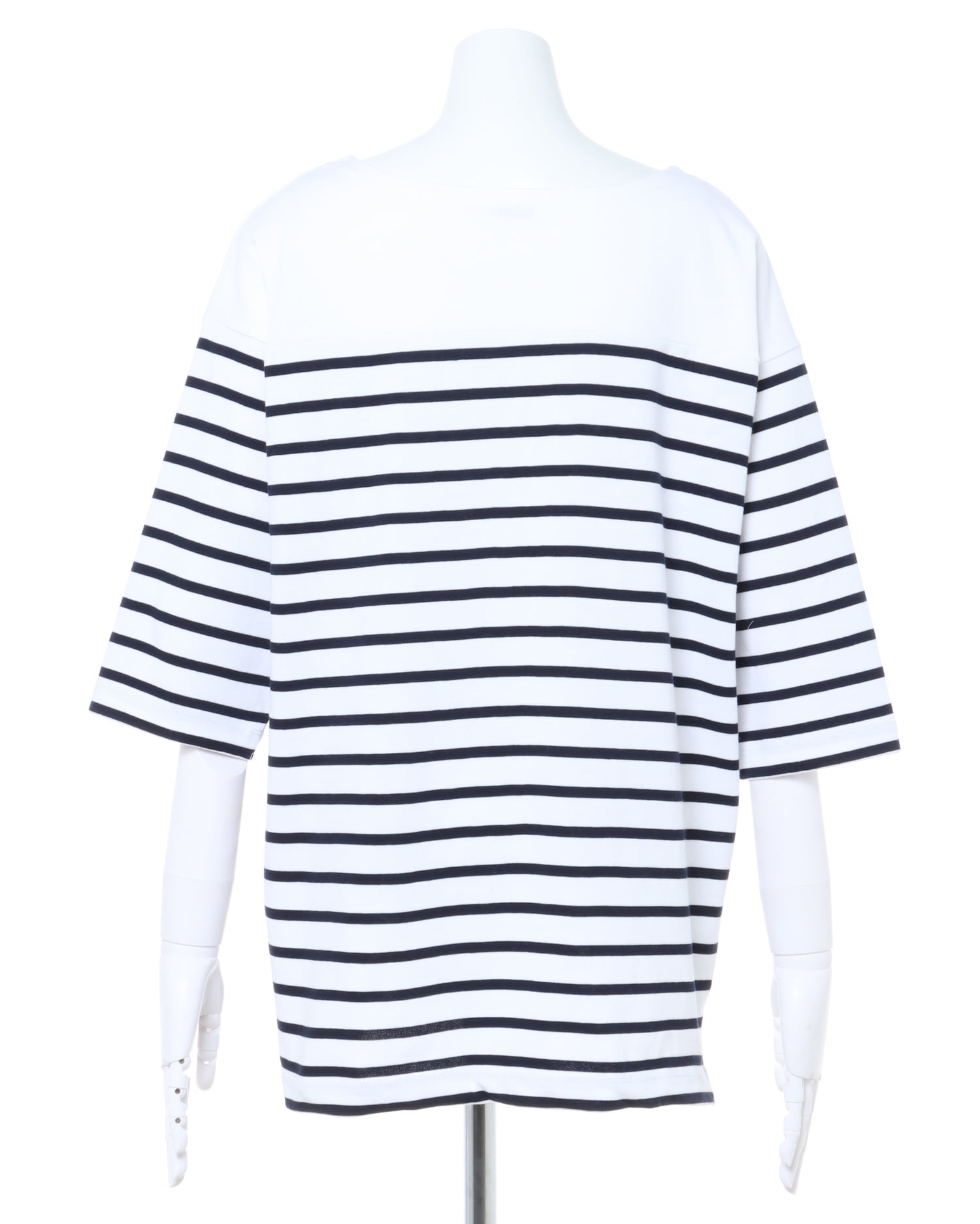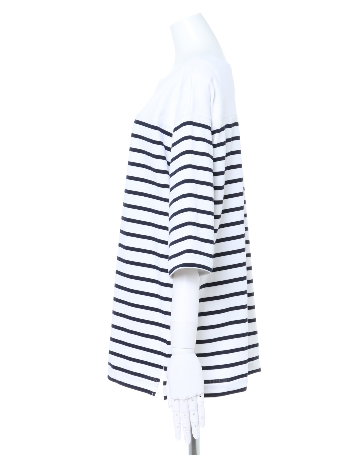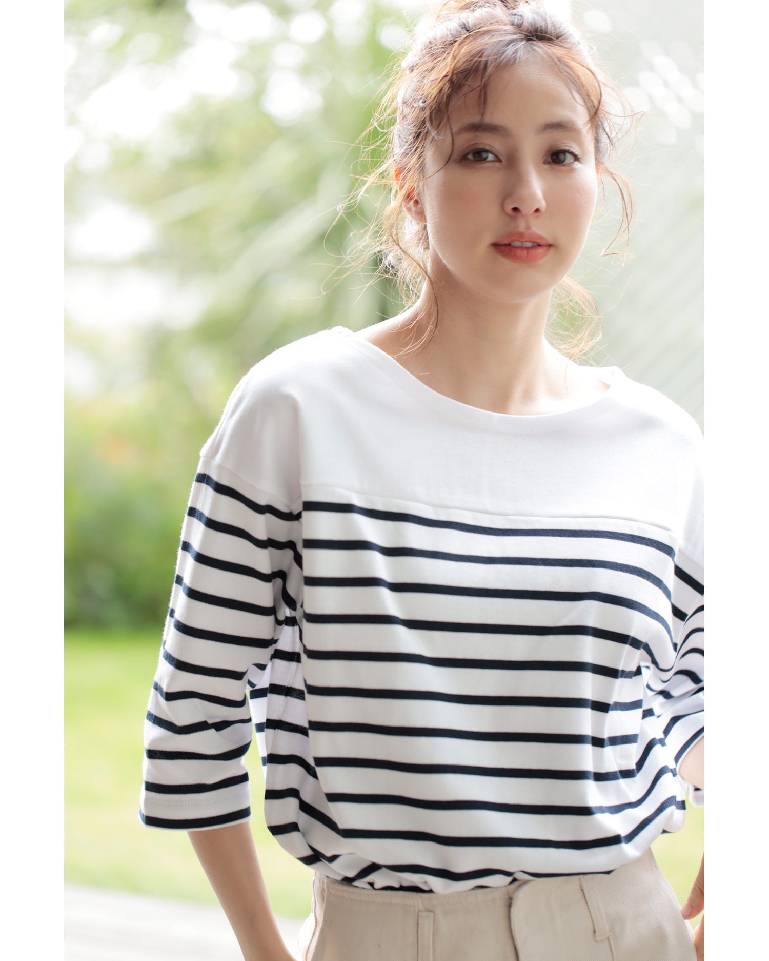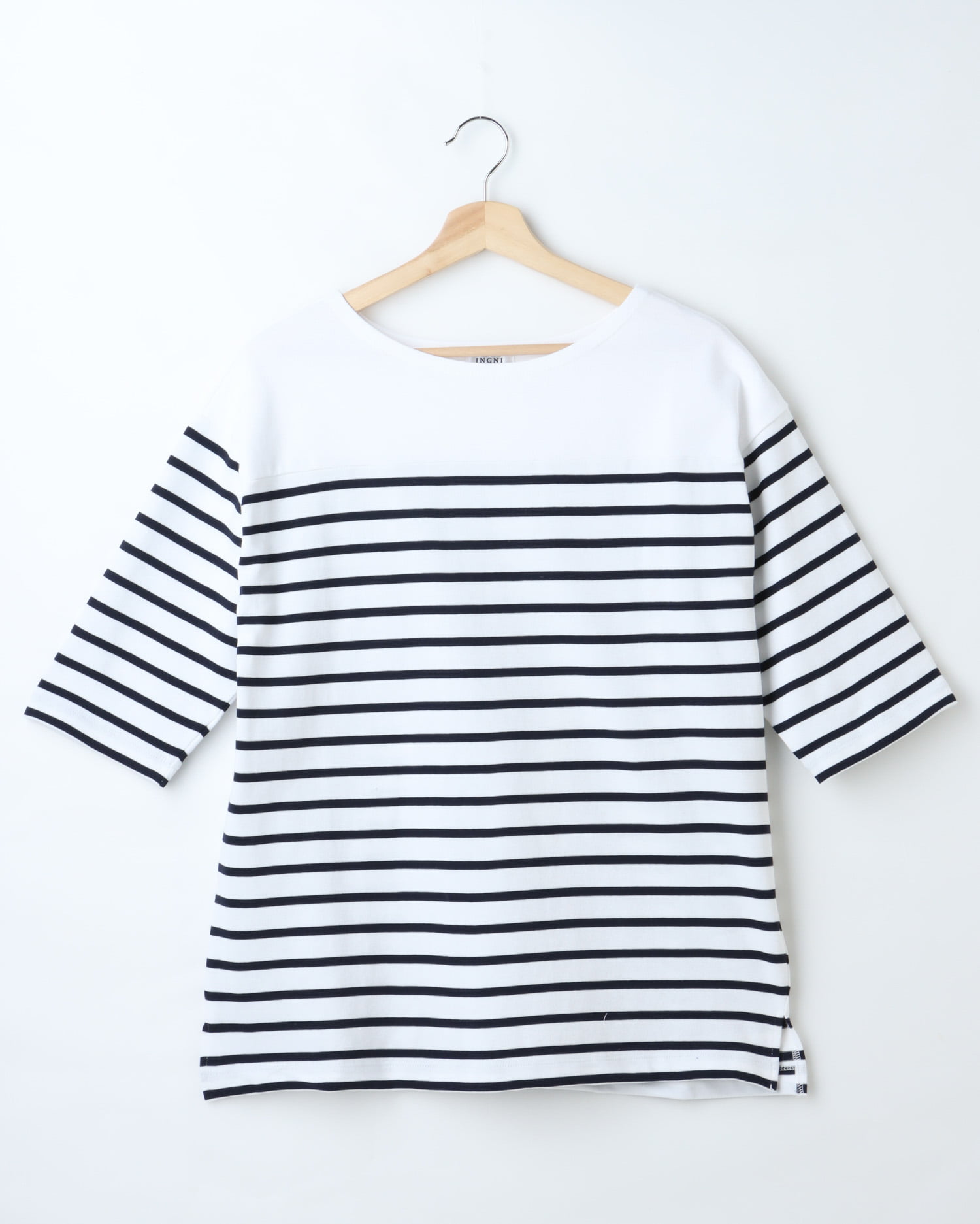 季節感のあるリラックス&カジュアルが完成するビッグシルエットのボーダートップス。細めピッチのボーダーで大人ラフな雰囲気に仕上げています。ヨーク部分を無地にすることですっきり見えるのもポイント。ハリ感のある生地と7分袖でレイヤードスタイルにもおすすめです。ボディラインを拾わないゆったりとした身頃で体型カバーも◎。