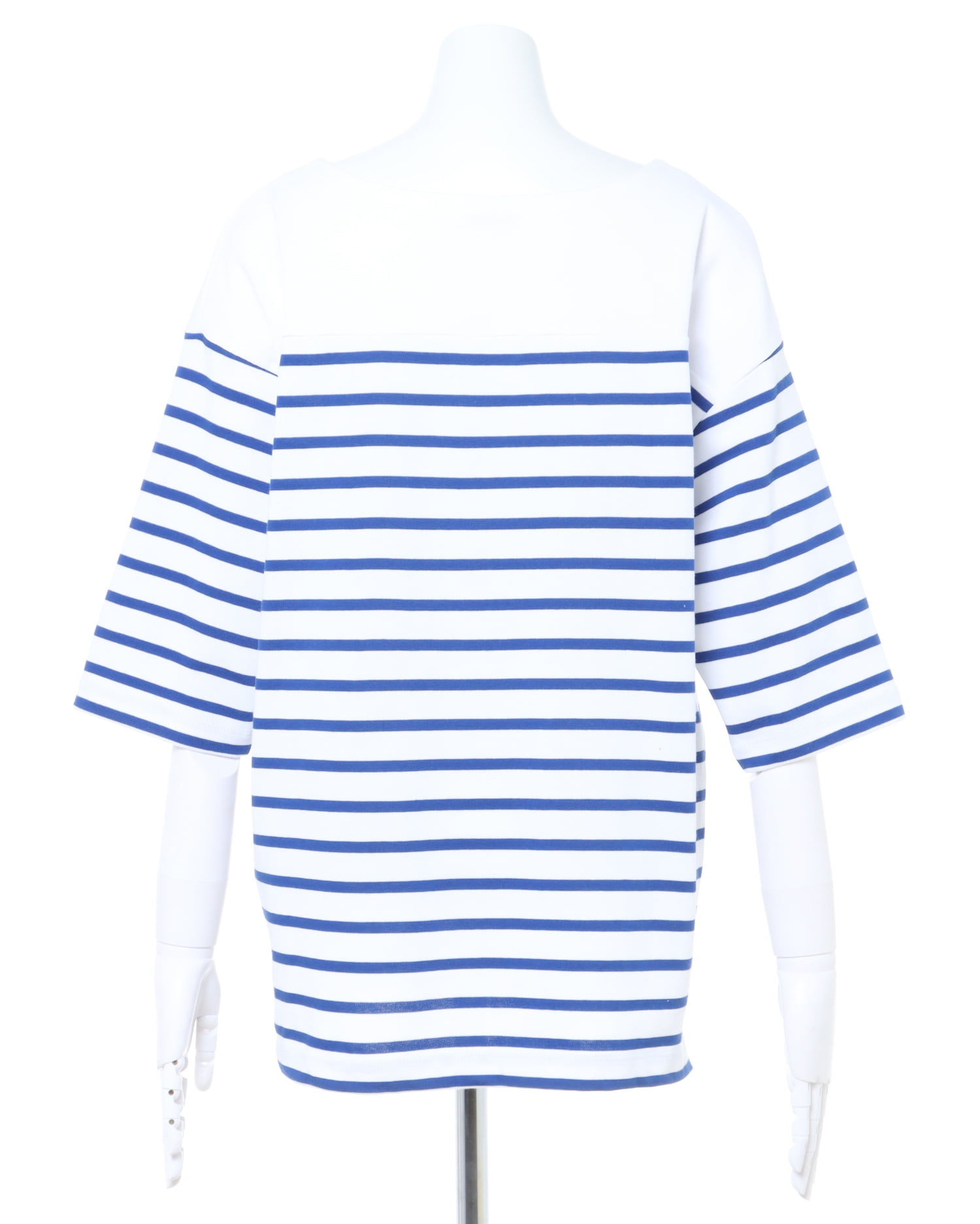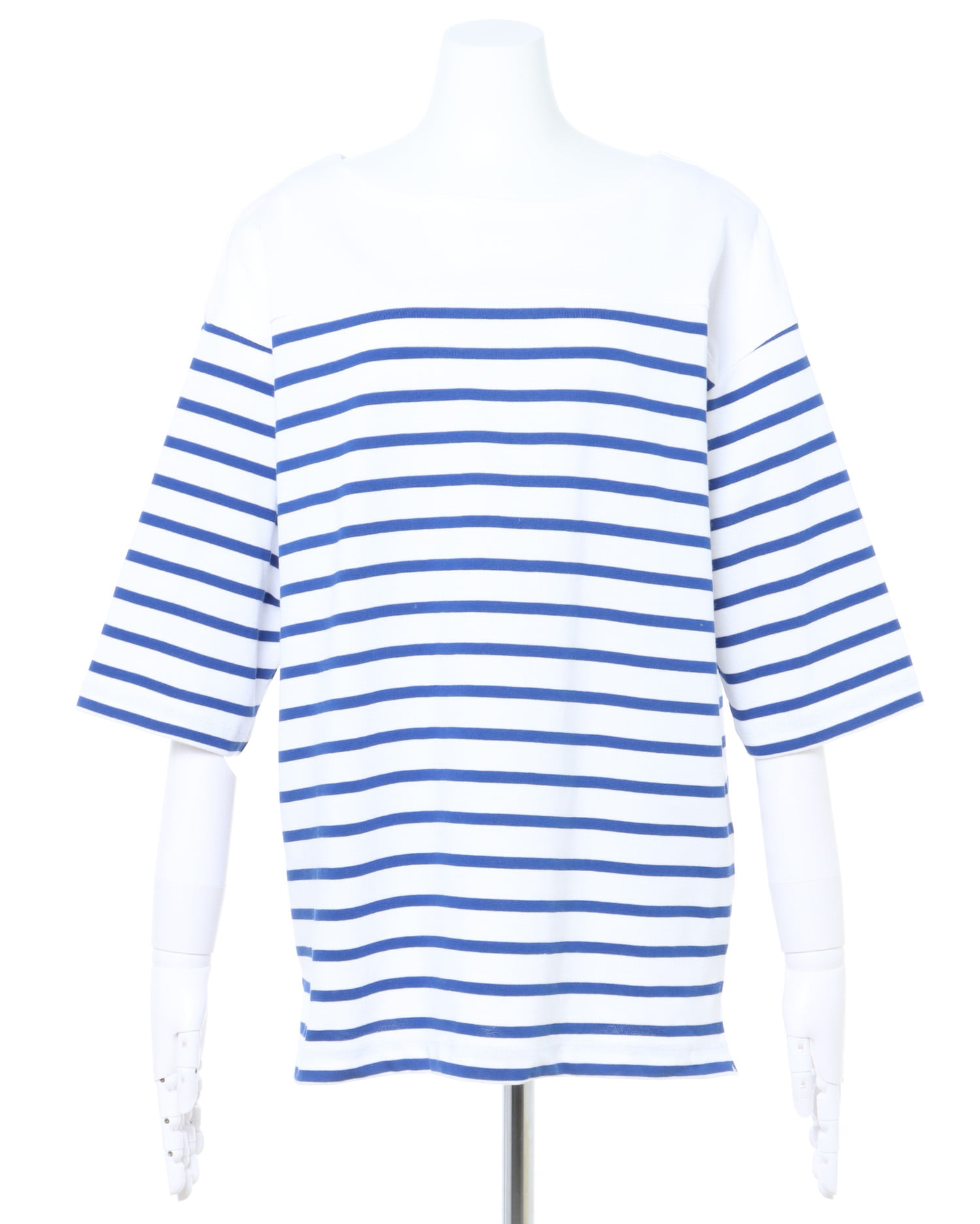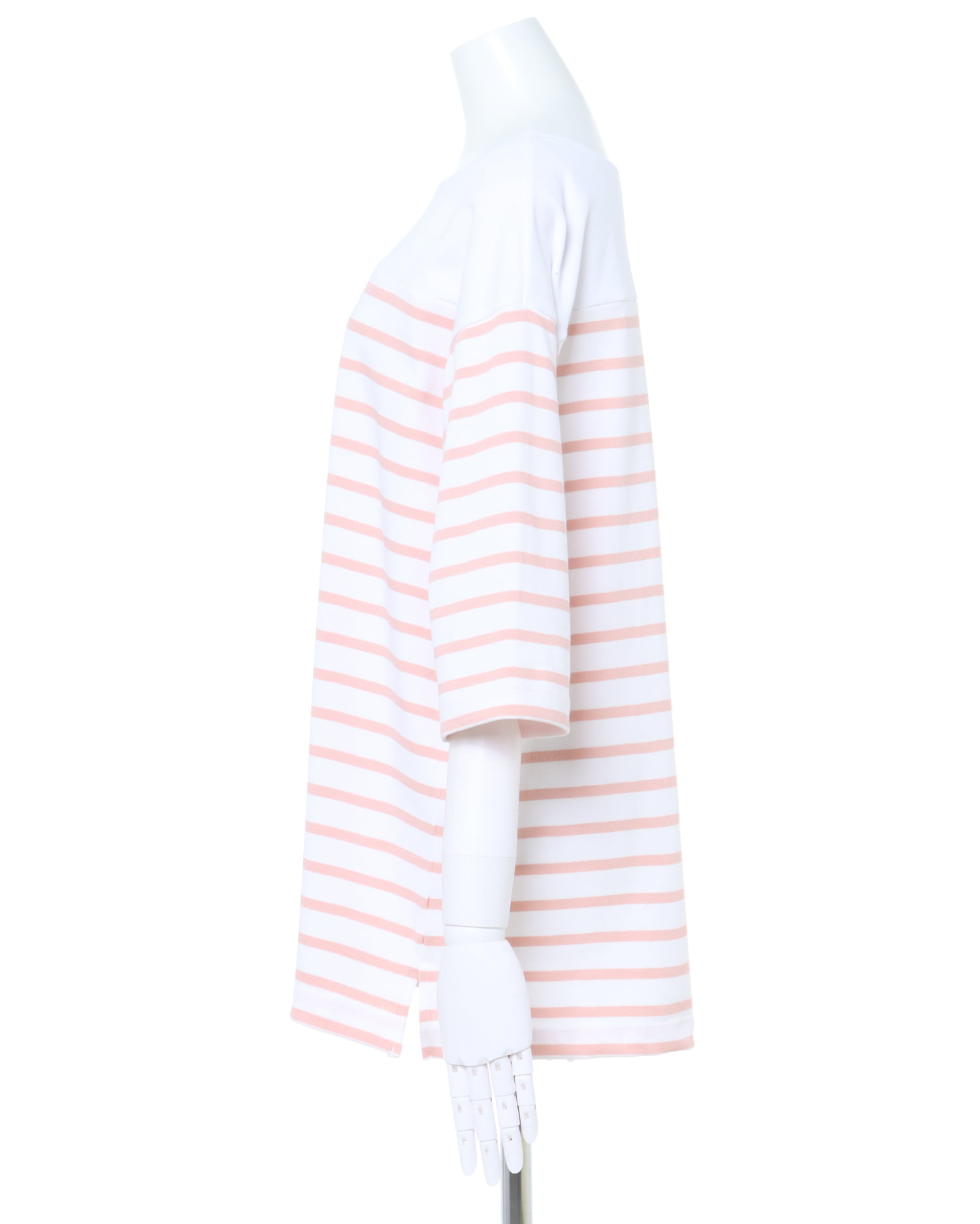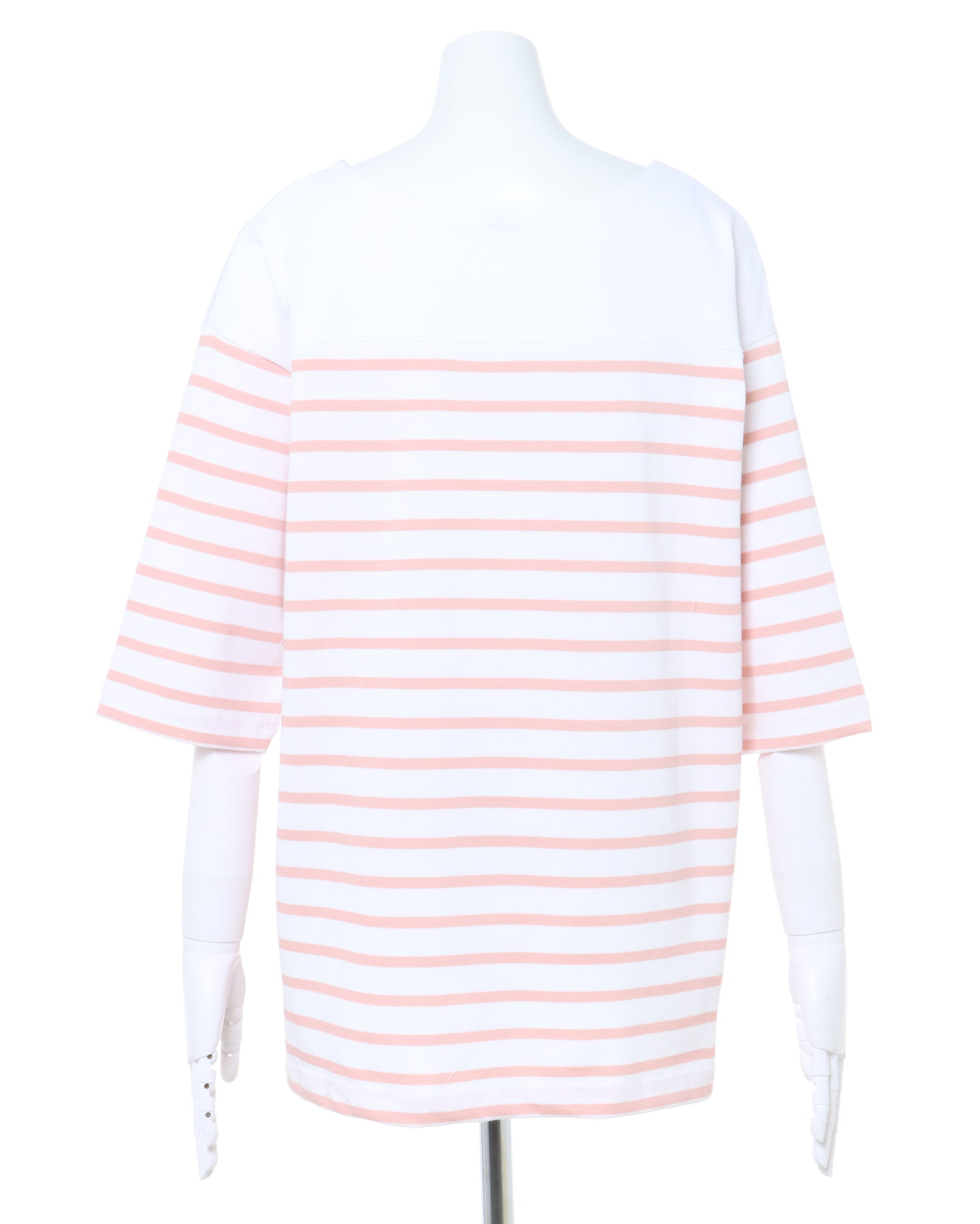 季節感のあるリラックス&カジュアルが完成するビッグシルエットのボーダートップス。細めピッチのボーダーで大人ラフな雰囲気に仕上げています。ヨーク部分を無地にすることですっきり見えるのもポイント。ハリ感のある生地と7分袖でレイヤードスタイルにもおすすめです。ボディラインを拾わないゆったりとした身頃で体型カバーも◎。