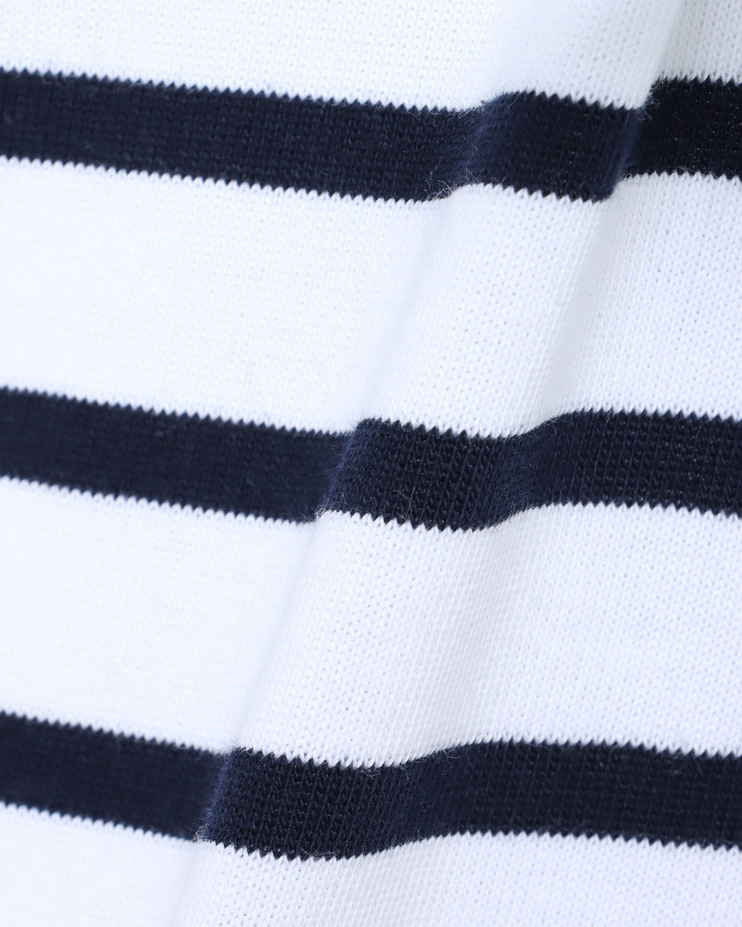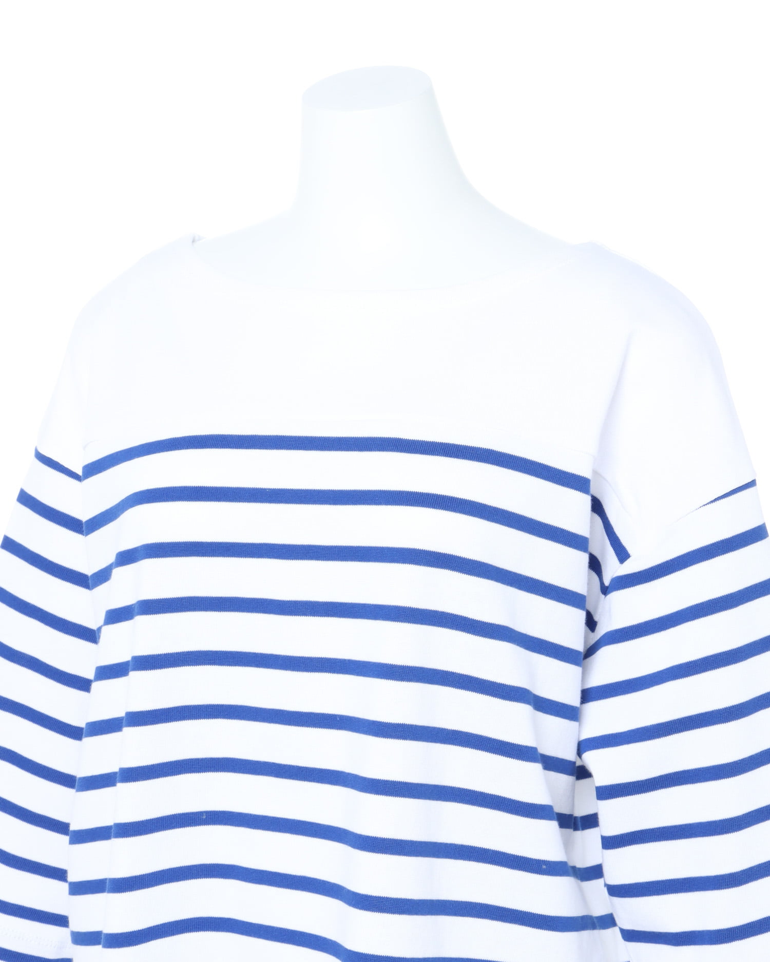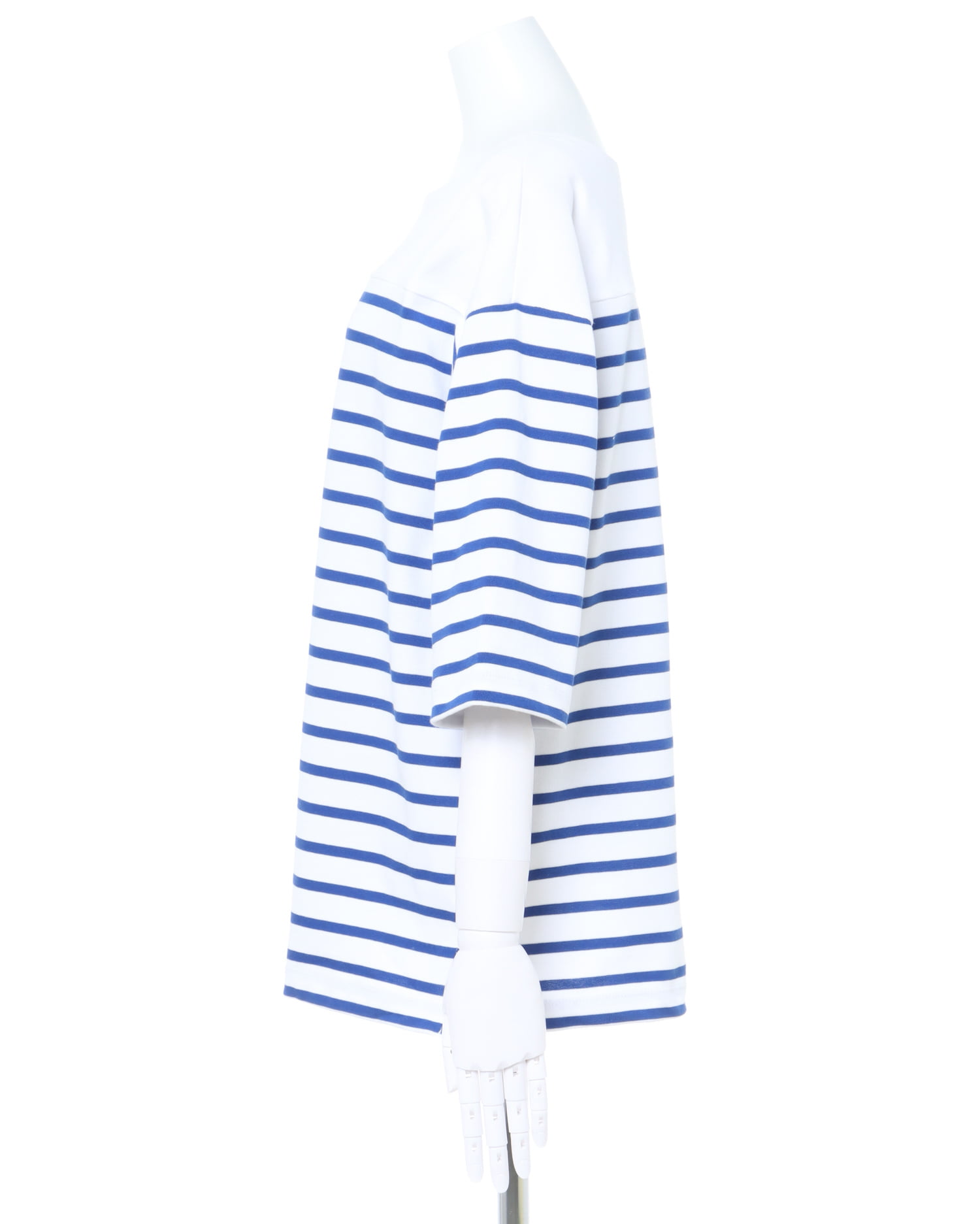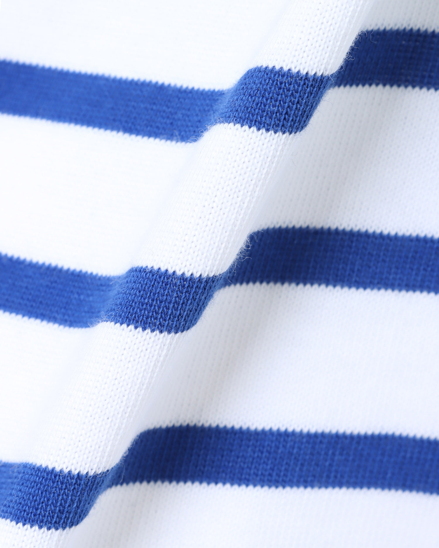 季節感のあるリラックス&カジュアルが完成するビッグシルエットのボーダートップス。細めピッチのボーダーで大人ラフな雰囲気に仕上げています。ヨーク部分を無地にすることですっきり見えるのもポイント。ハリ感のある生地と7分袖でレイヤードスタイルにもおすすめです。ボディラインを拾わないゆったりとした身頃で体型カバーも◎。