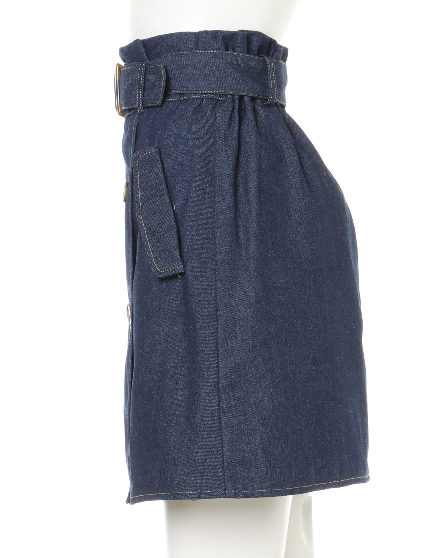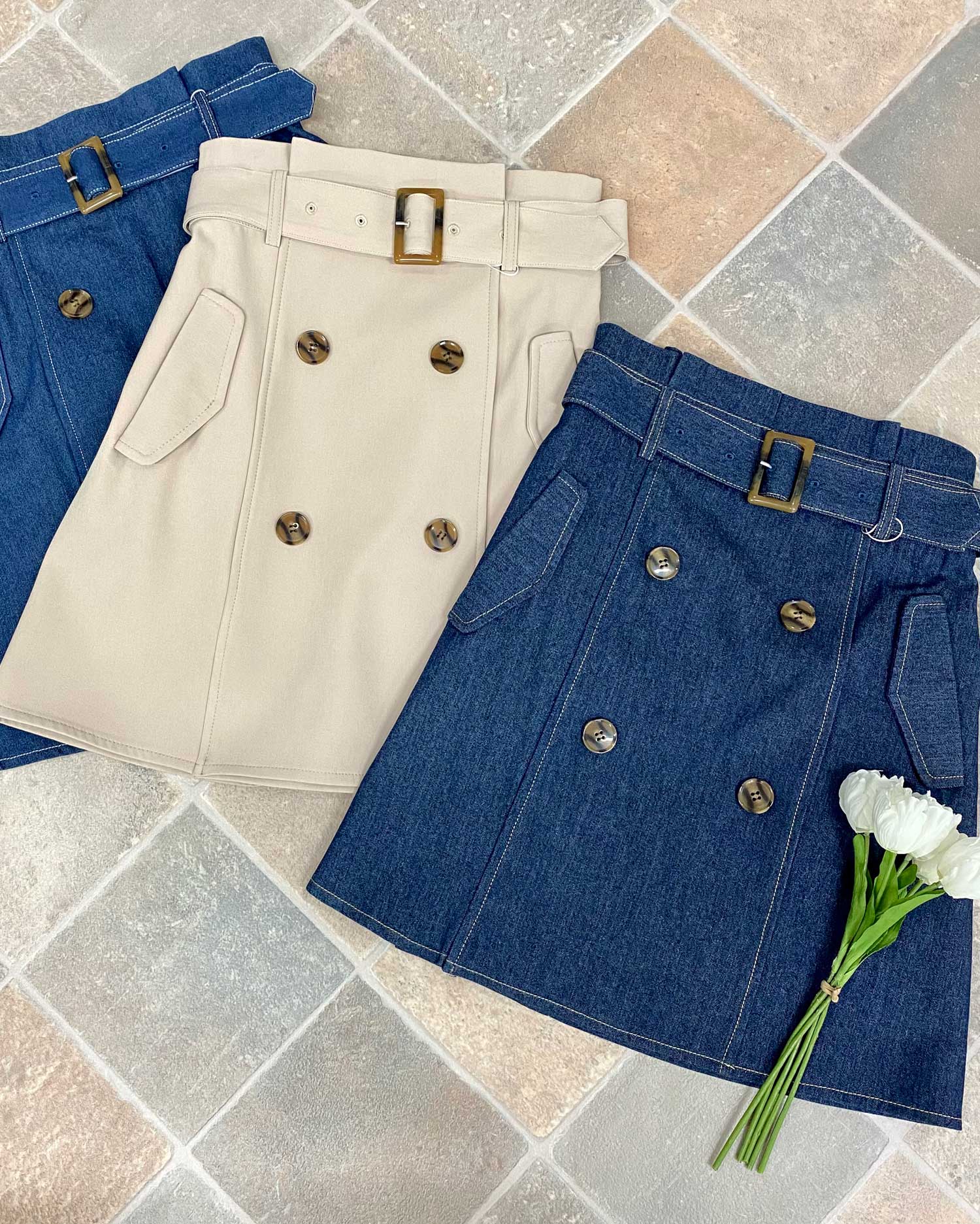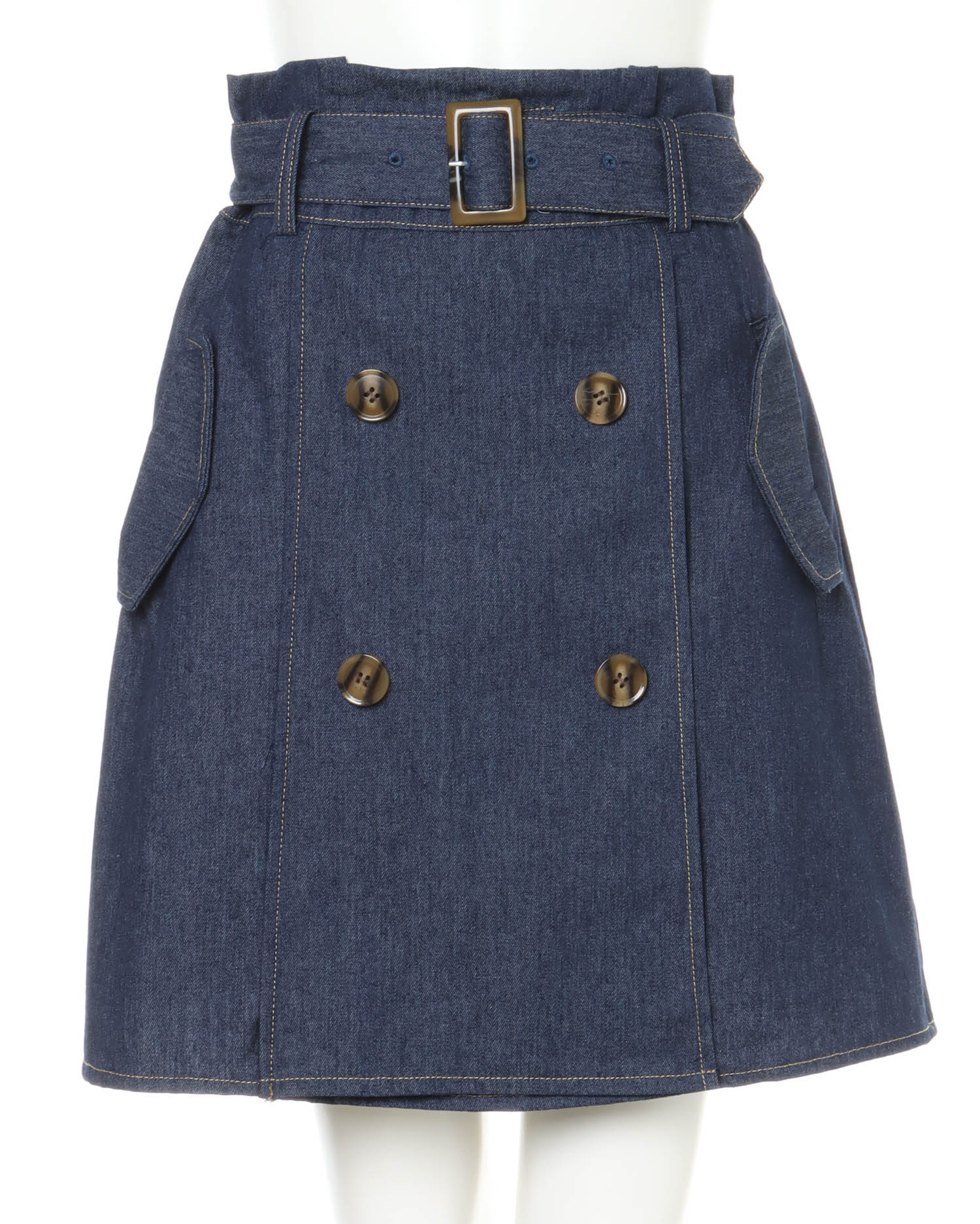 台形シルエットで美脚を叶えるトレンチデザインのスカート。きちんと感があるので普段使いはもちろん、お出かけシーンにも活躍します。巻きスカート風デザインもきちんと縫い止めてあるのではだける心配もナシ。バックウエストはゴム&ジップで脱ぎ着も楽ちん。スクエアバックルのベルトでトップスインスタイルも◎。フロントサイドには便利なポケット付き。