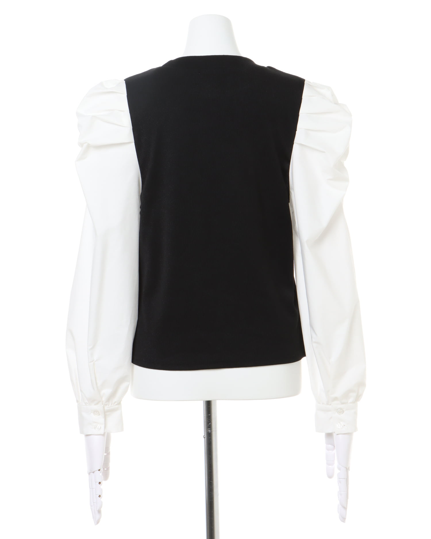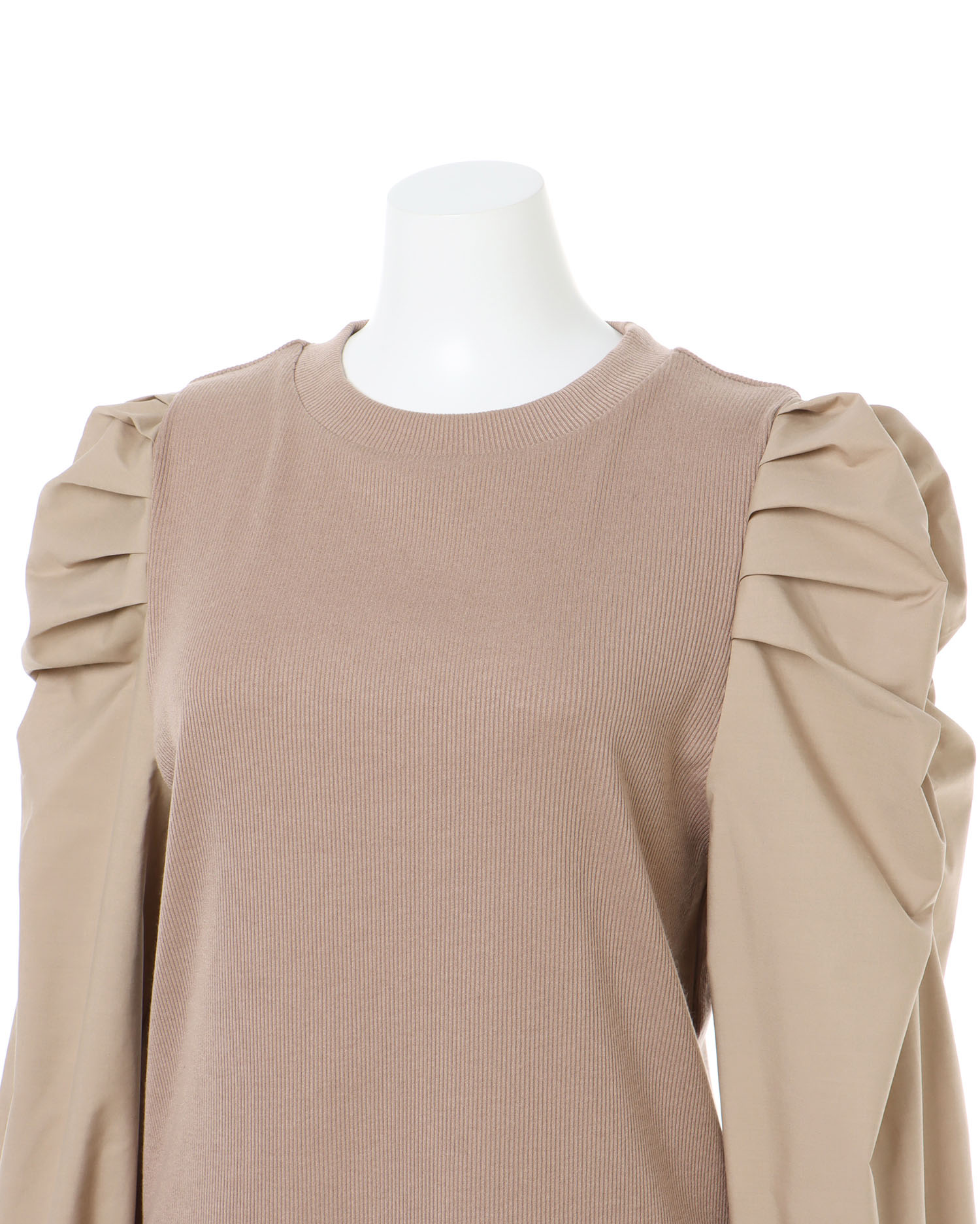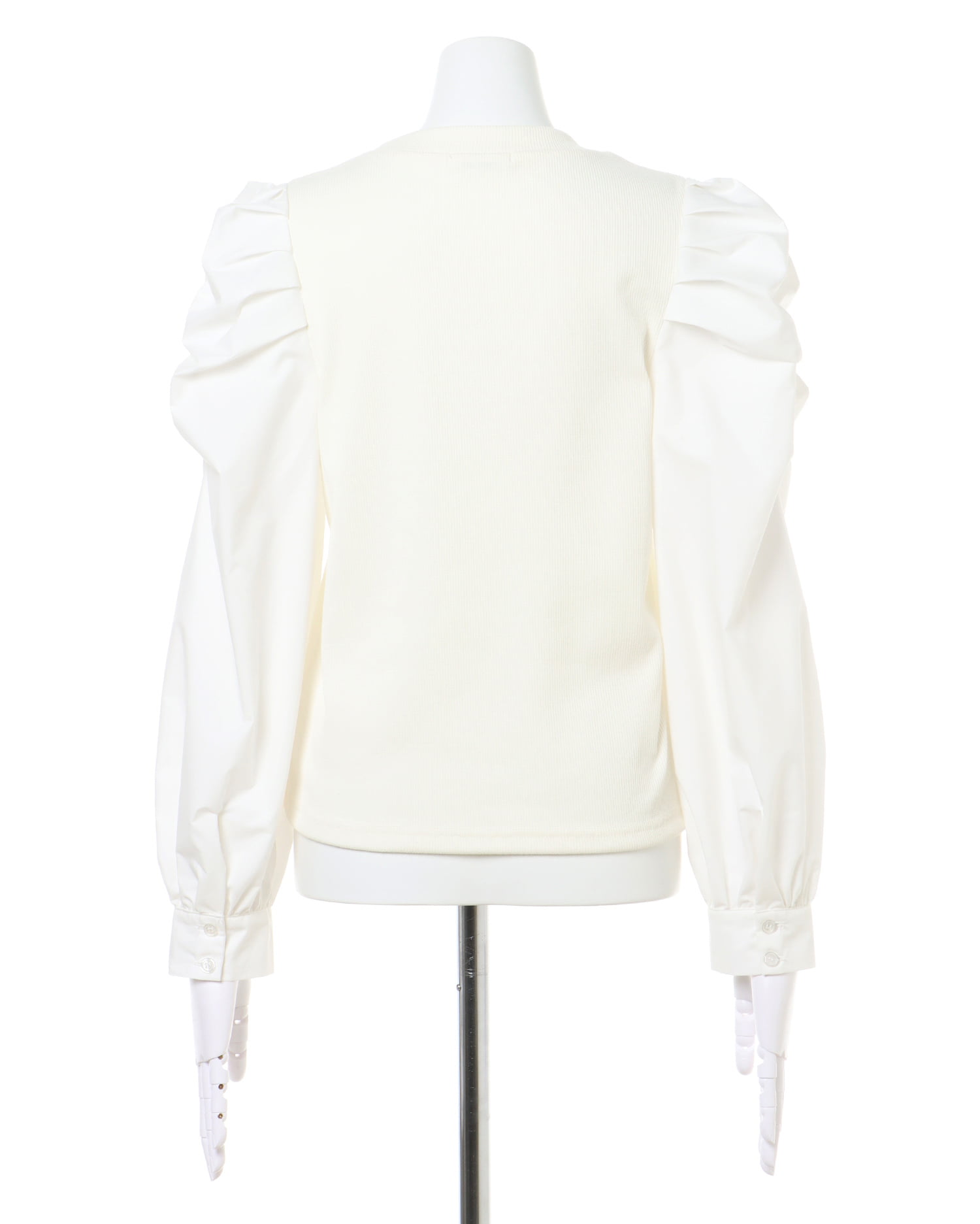 スリーブ部分をハリ感のある生地で切り替えた異素材ドッキングのトップスです。