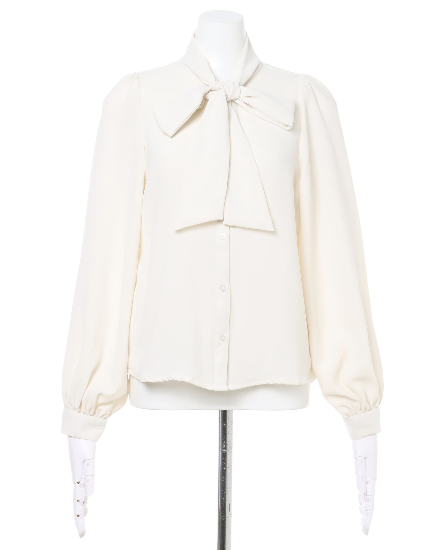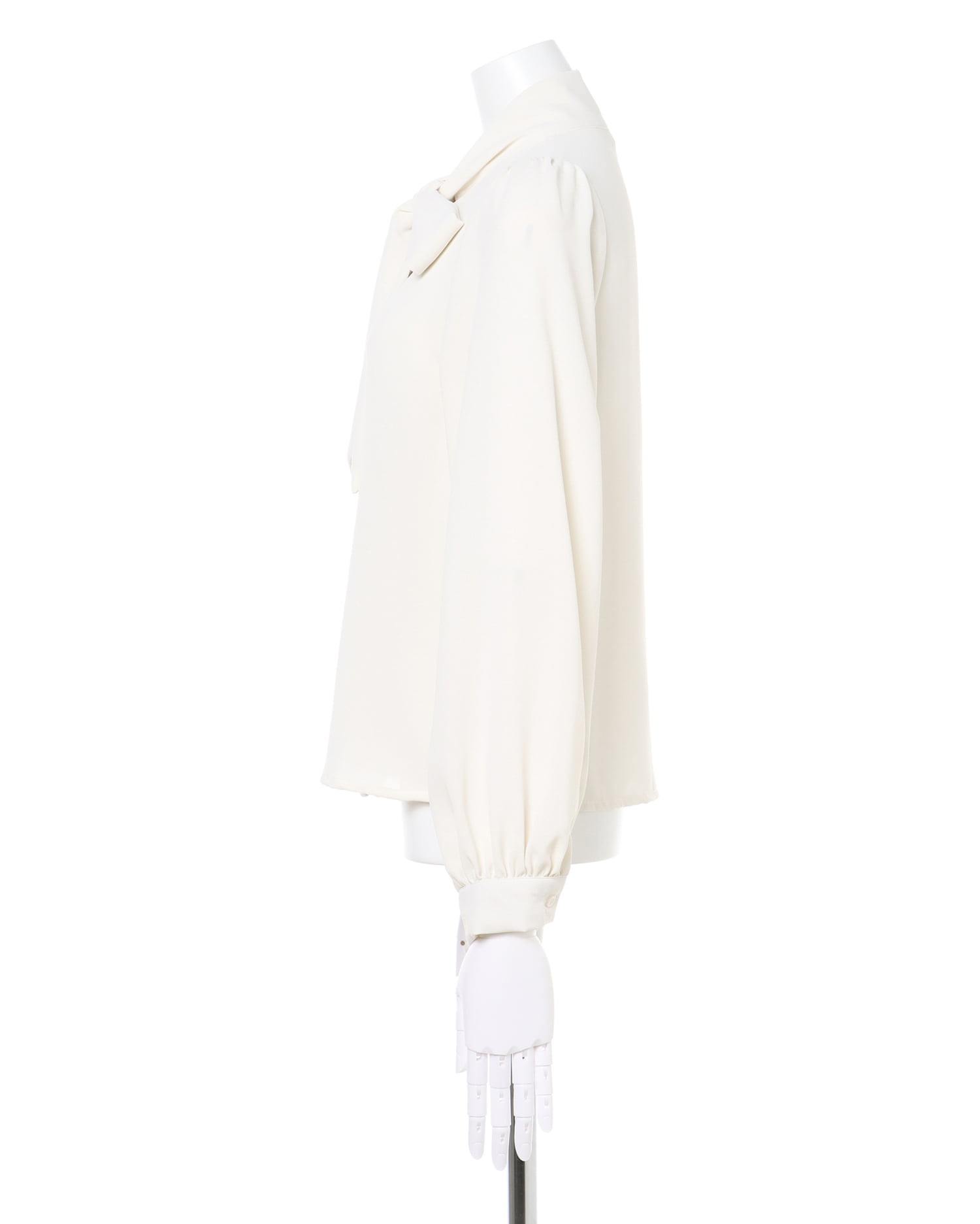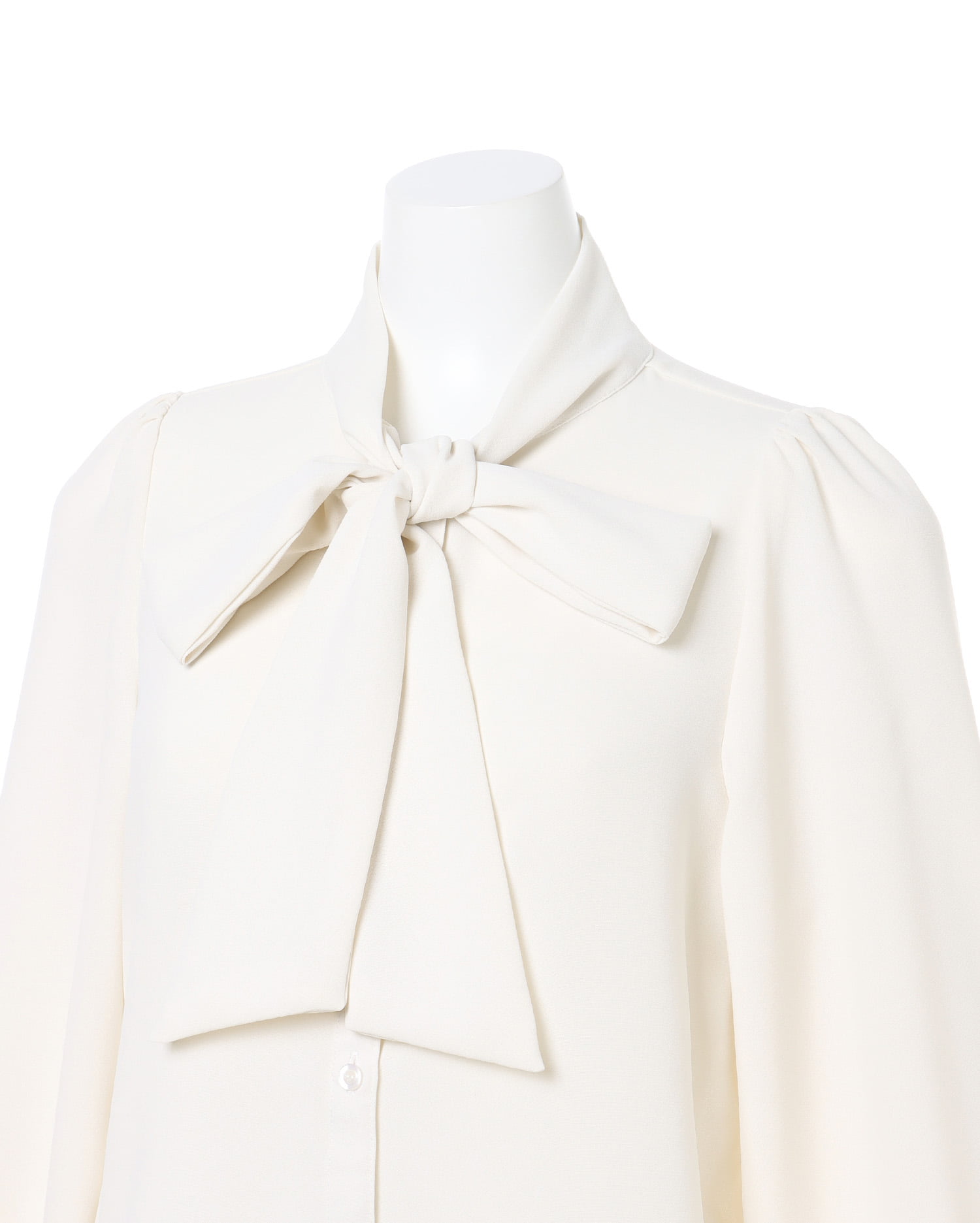 オンオフ問わずに着回せるシンプルブラウスはボウタイデザインが魅力。