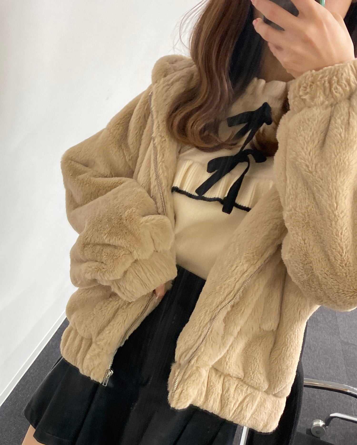 ミニ丈のプリーツスカートもパンツ型の裏地付きで1枚で着られるアイテムに仕上げています。