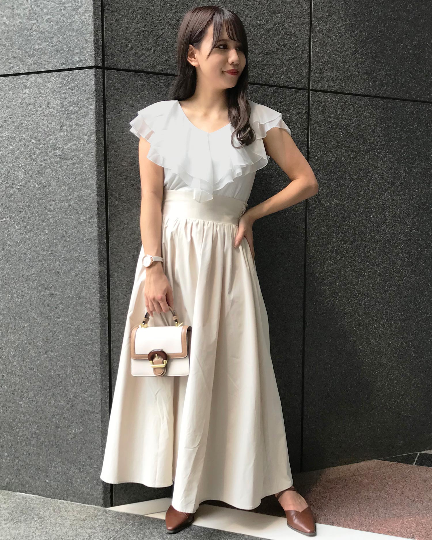 大きなフリルが気になる二の腕をさり気なくカバー。