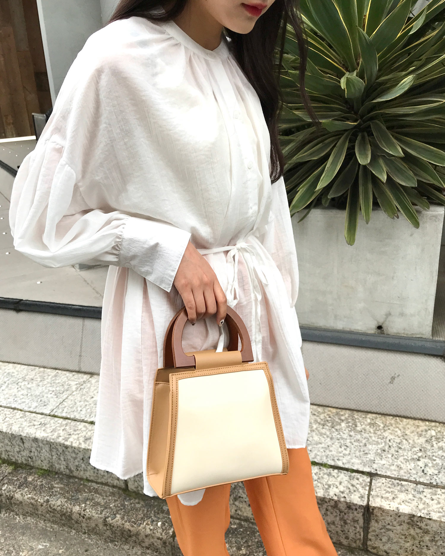 シンプルなワンカラーも表面感のある生地でこなれた印象へと導きます。