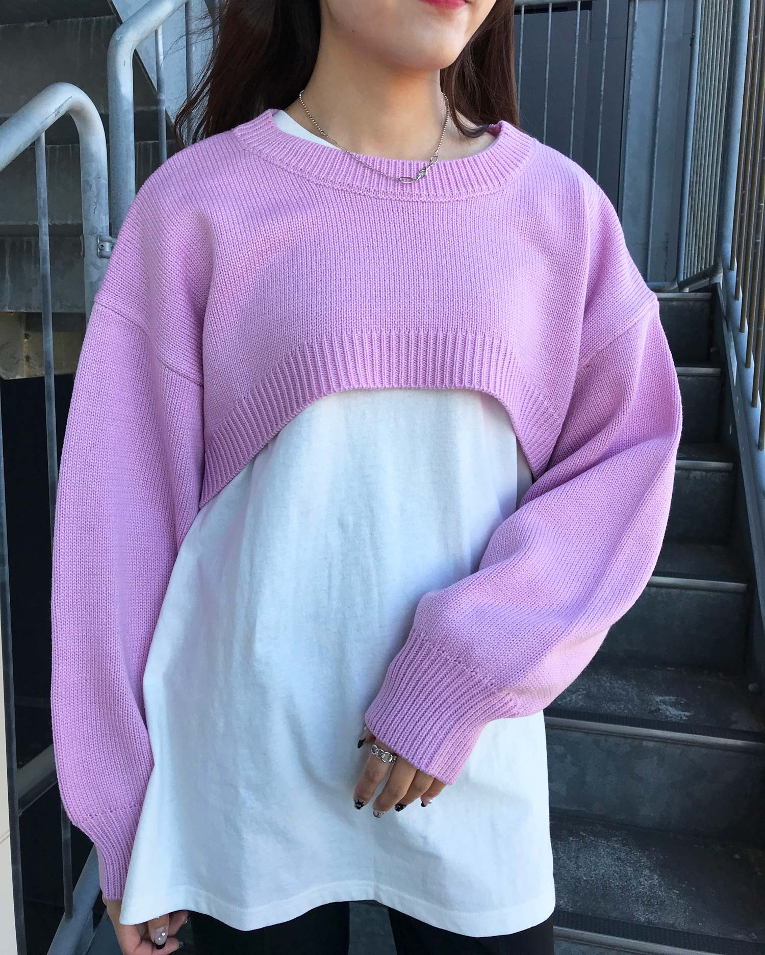 大胆なクロップド丈でトレンドのレイヤードコーデがスタイリッシュに映えるニット。
