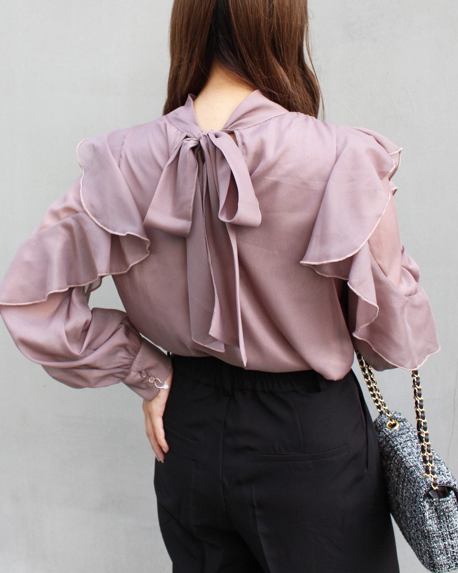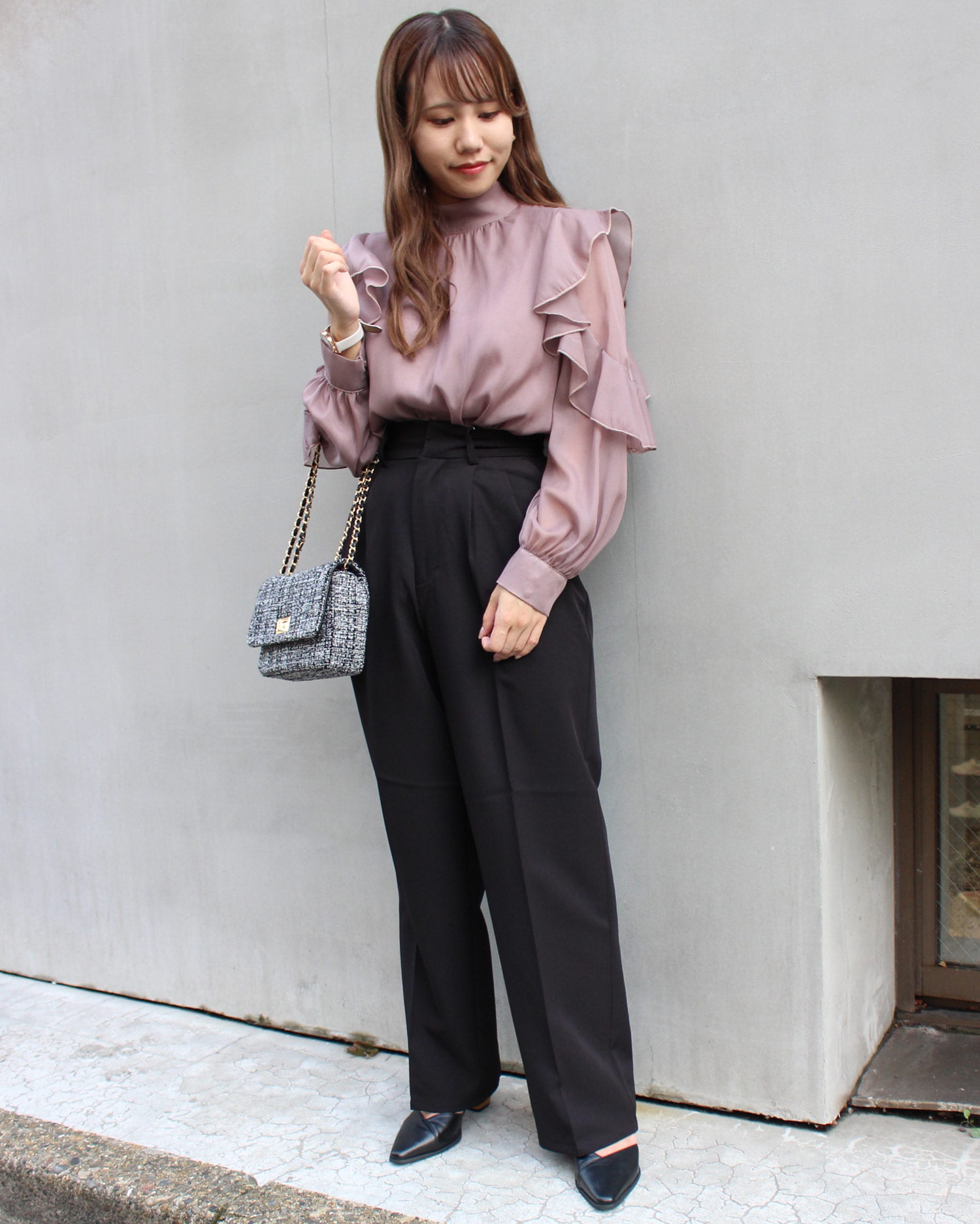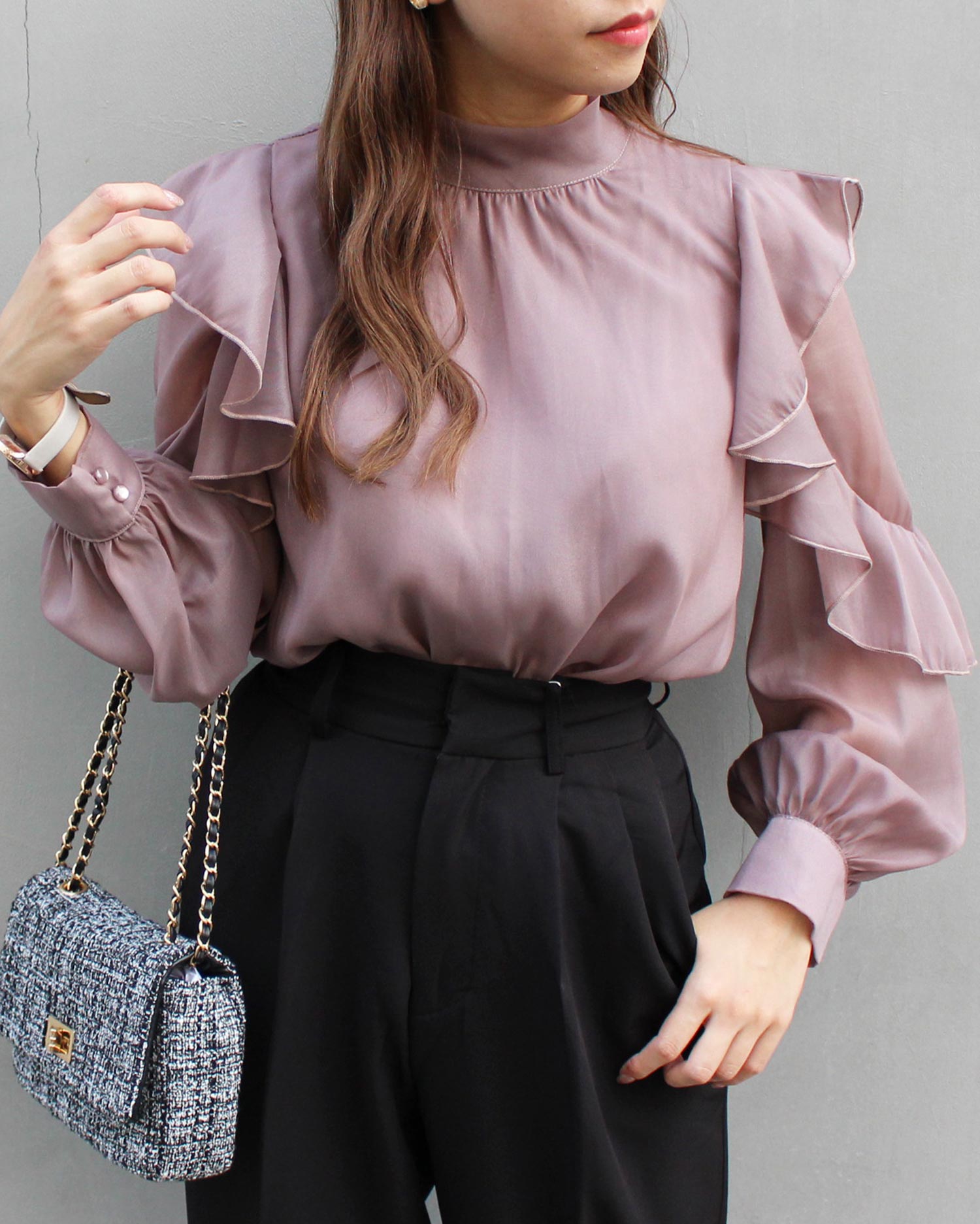 袖にあしらったフリルがレディライクな印象をさらにプラス。