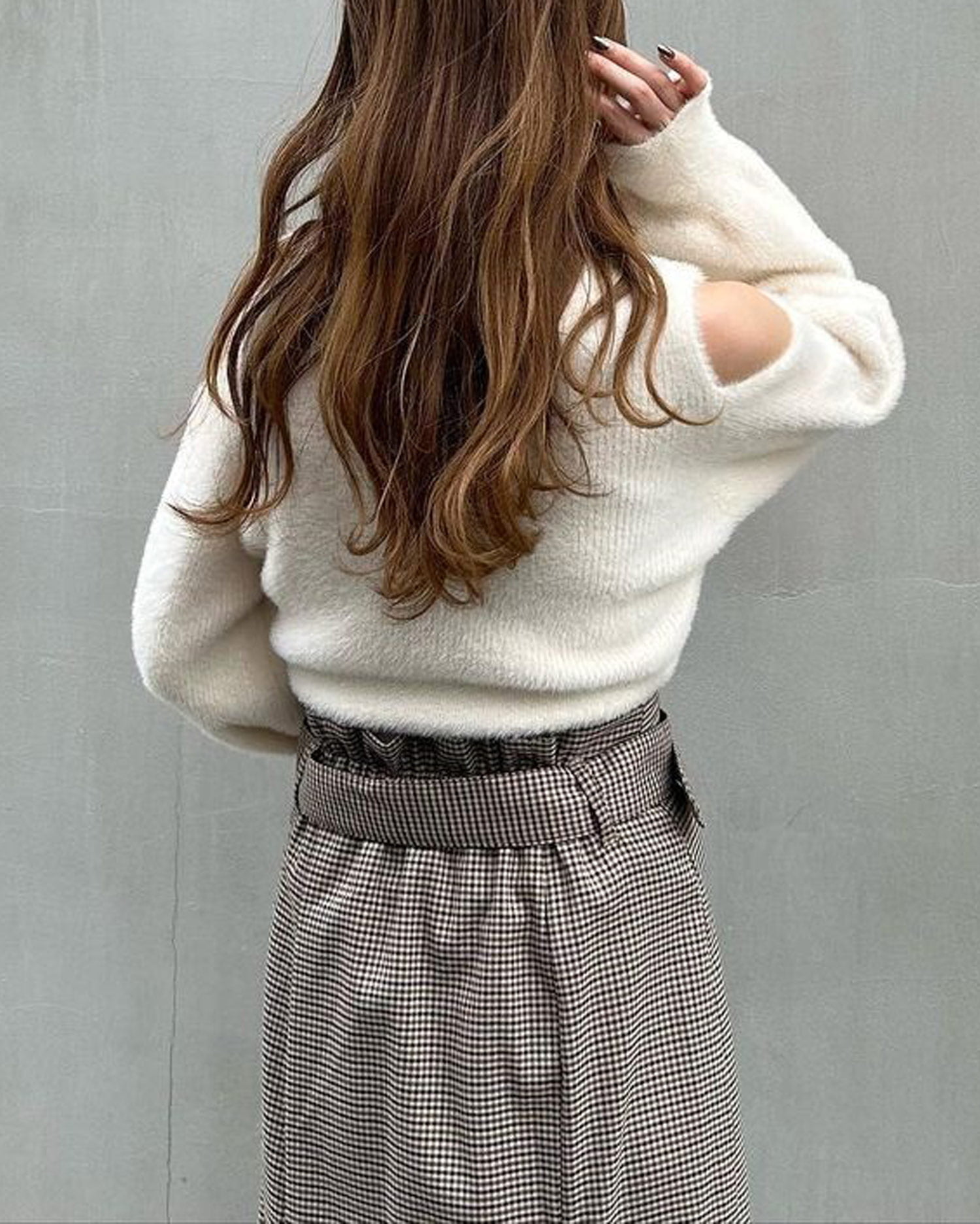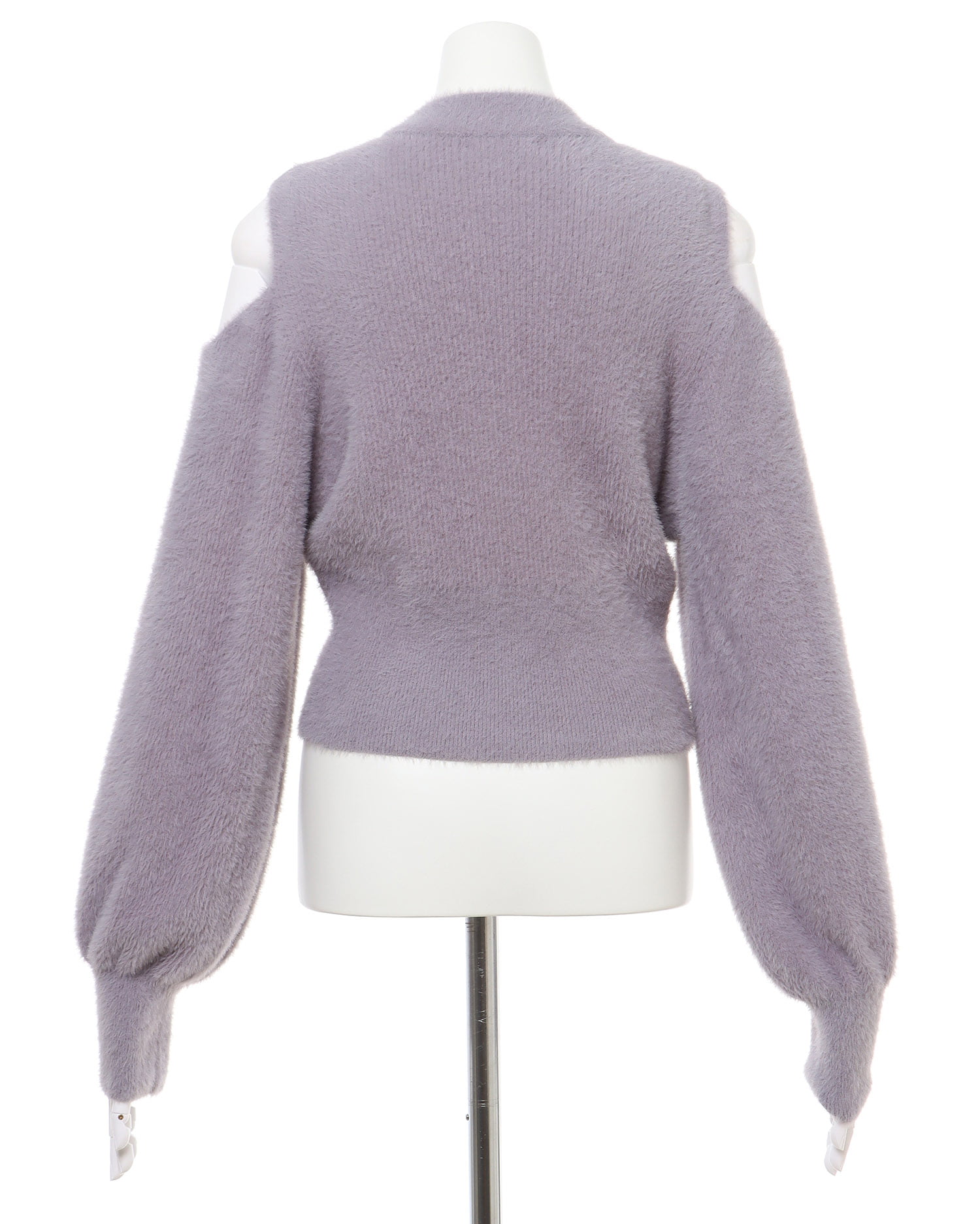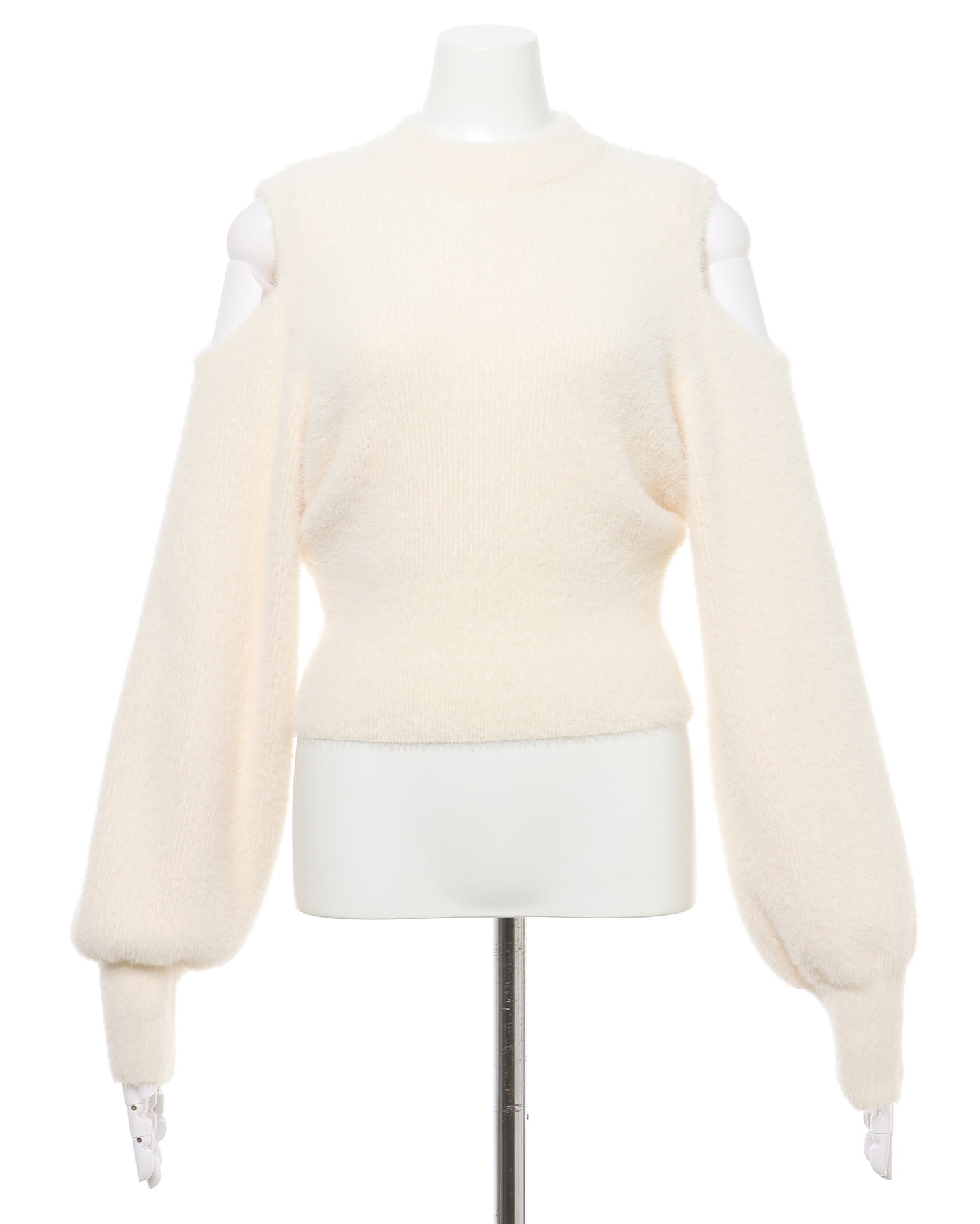 毛足の長いなめらかタッチのフェザーヤーンニットはオープンショルダーデザインでレディな雰囲気に。