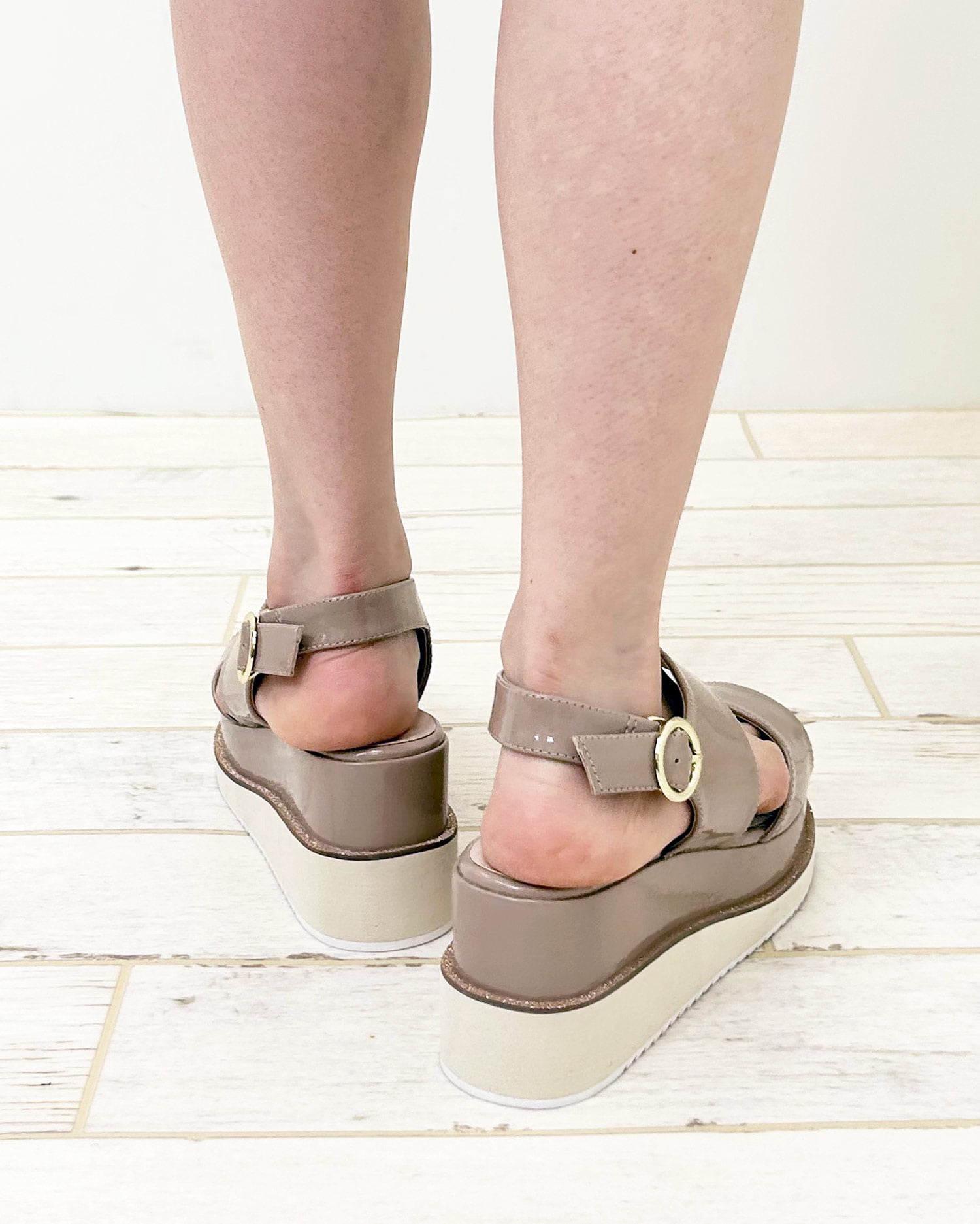 ソールの切り替え部分にラメをあしらったプラットフォームサンダル。