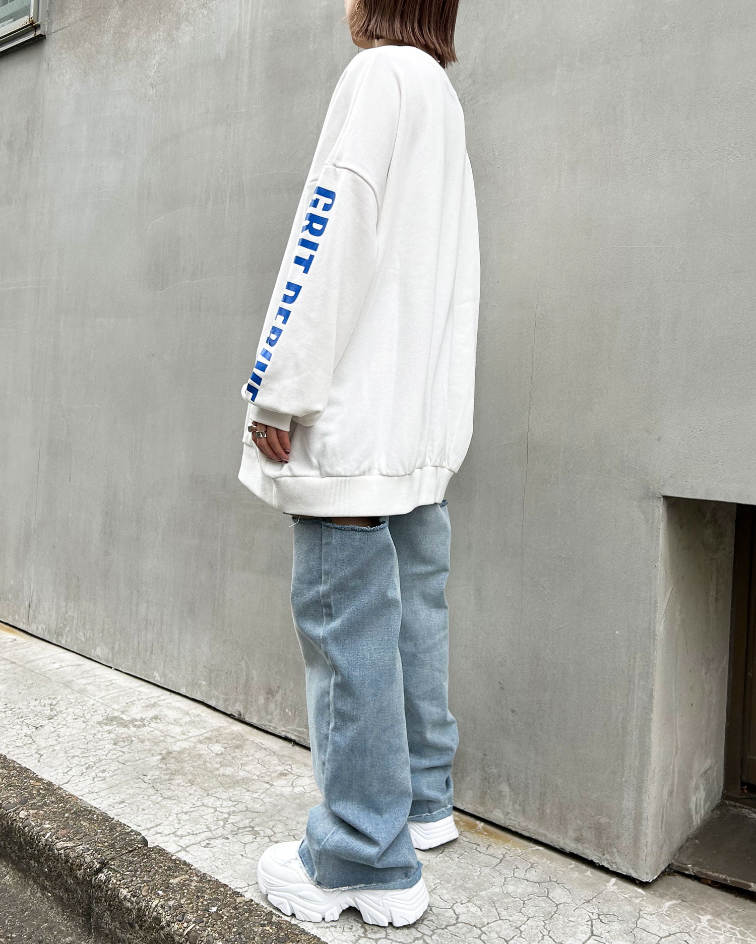 袖にプリントしたロゴがインパクト抜群のスウェットトップス。