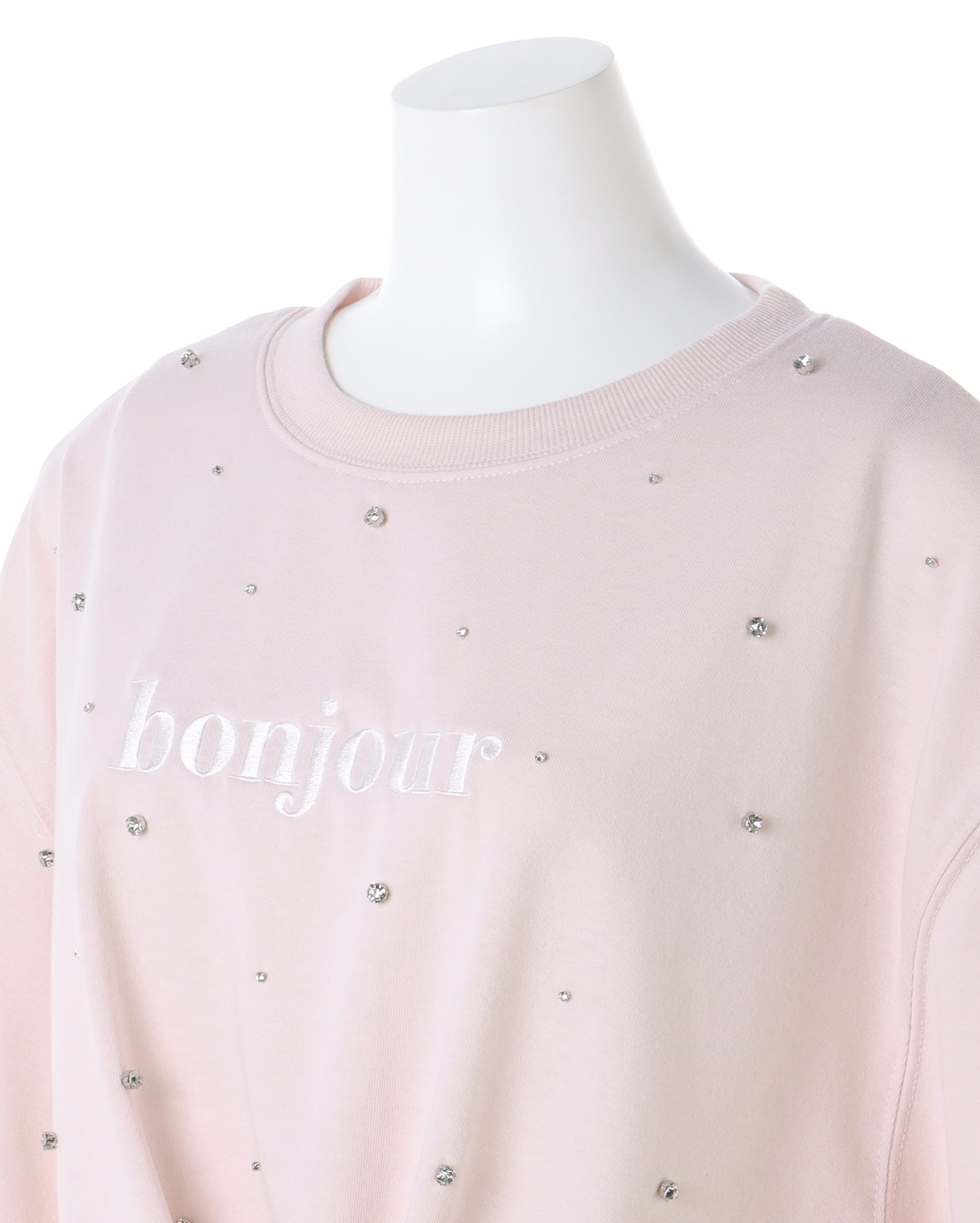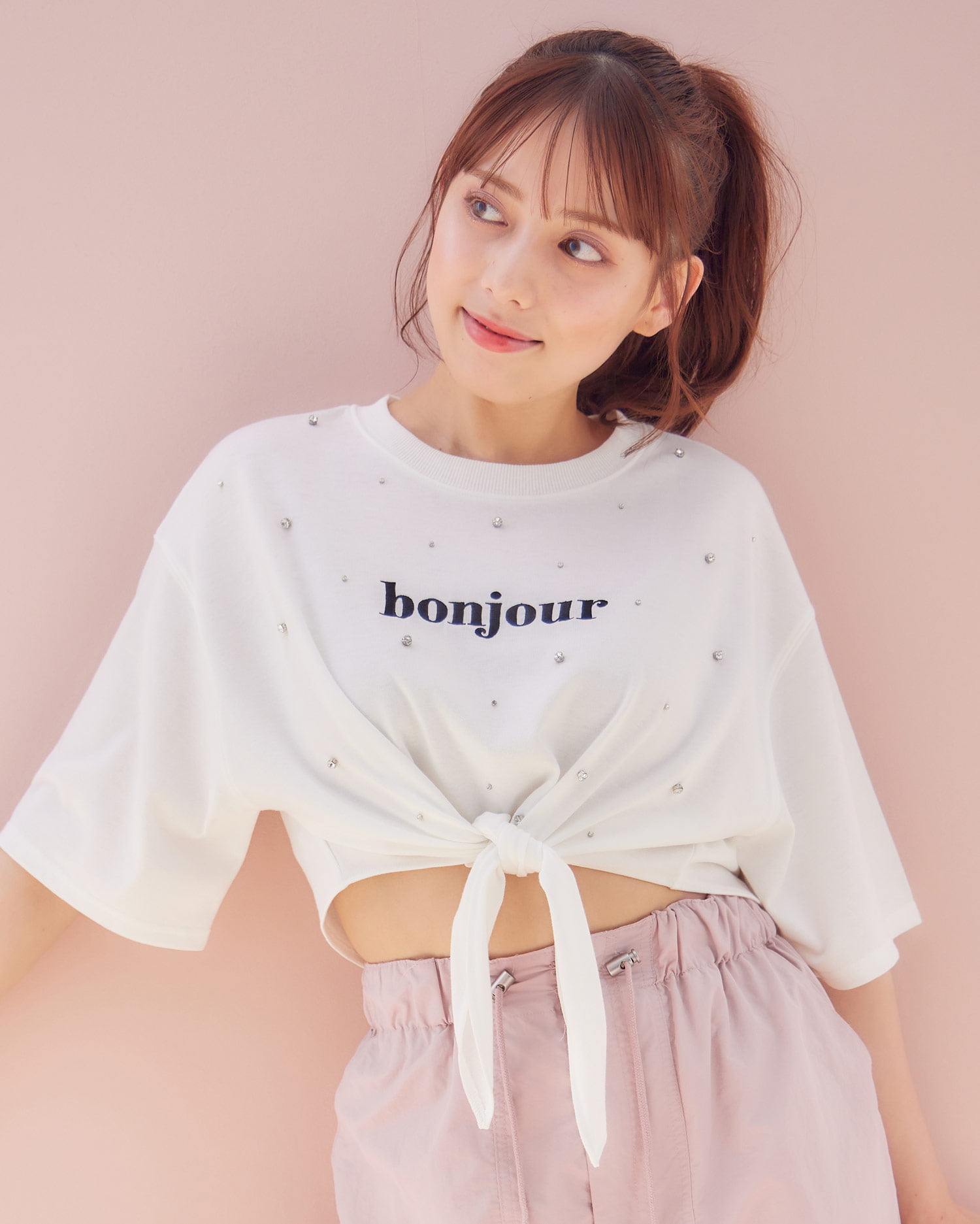フロントにラインストーンを散りばめた華やかデザインのTシャツ。