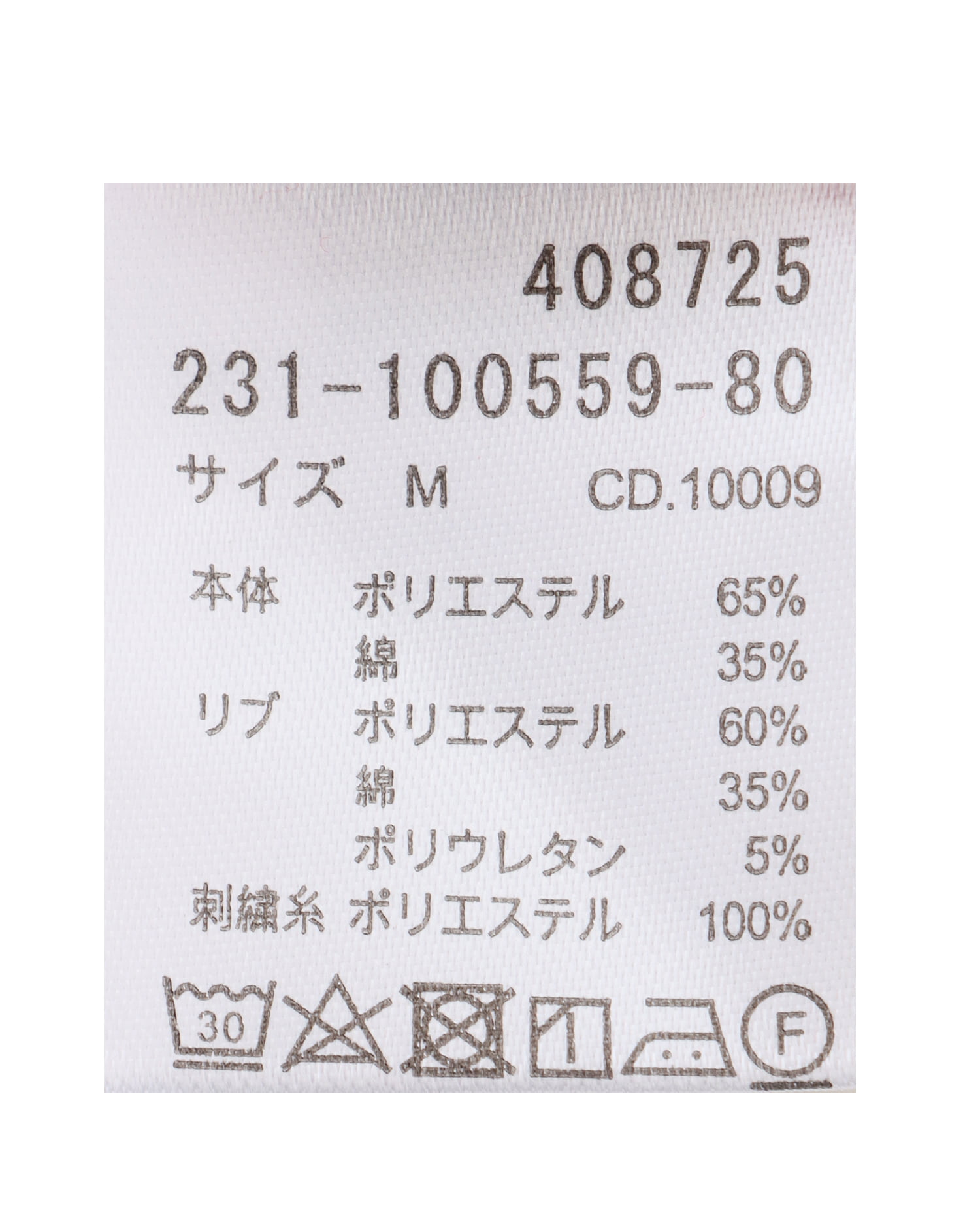 原産国 中国 本体 ポリエステル65% 本体 綿35% リブ ポリエステル60% リブ 綿35% リブ ポリウレタン5% 刺繍糸 ポリエステル100%